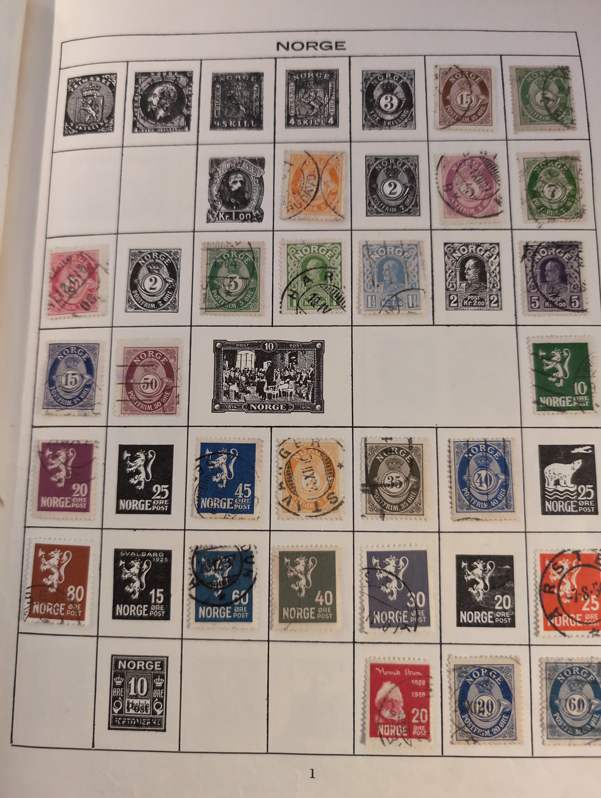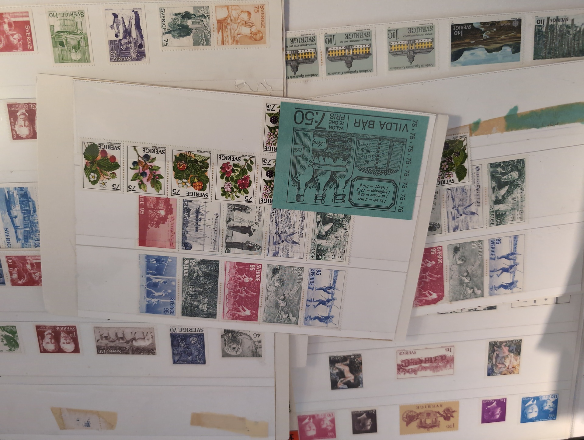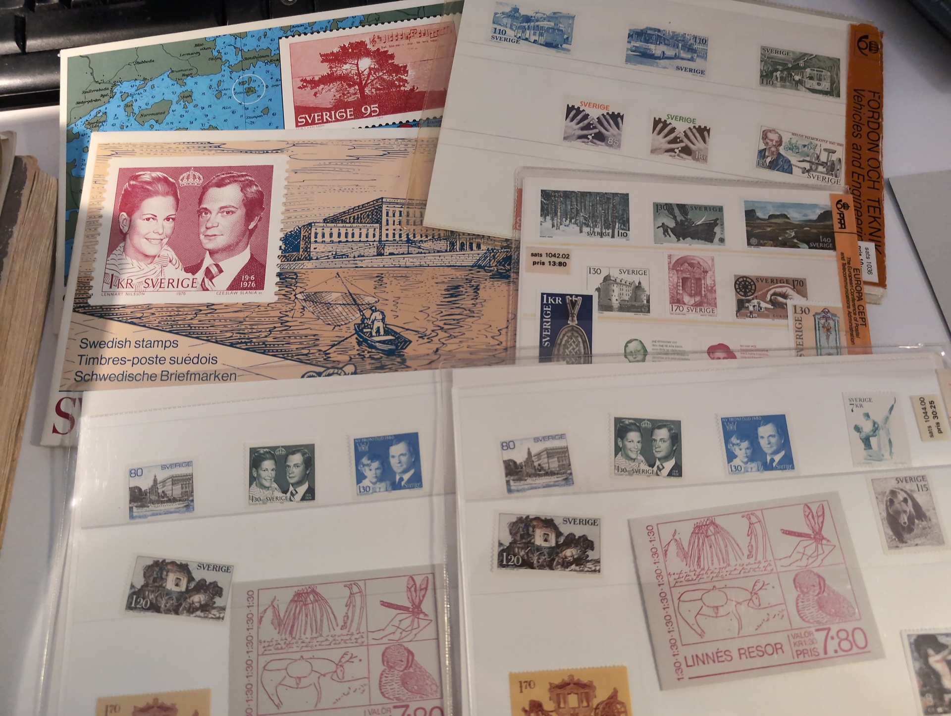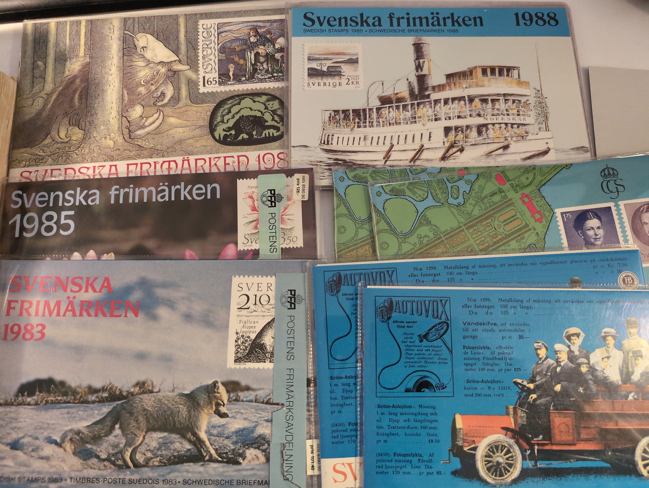 ALL WORLD. Accumulation mostly used 1870s–1980s in box. Four booklet year sets 1980s incl discount booklets, seven year sets 1980/1988 incl. 2x1980 and 1981 and some other face value stamps. Book 'Friherre Erik Leijonhifvuds samling Svenska Frimärken', an old HaWe album, Club books and old album pages with some interesting stamps incl. Denmark and Finland incl. several with rings lower values. Please see a selection of scans at www.philea.se. Somewhat mixed quality.
