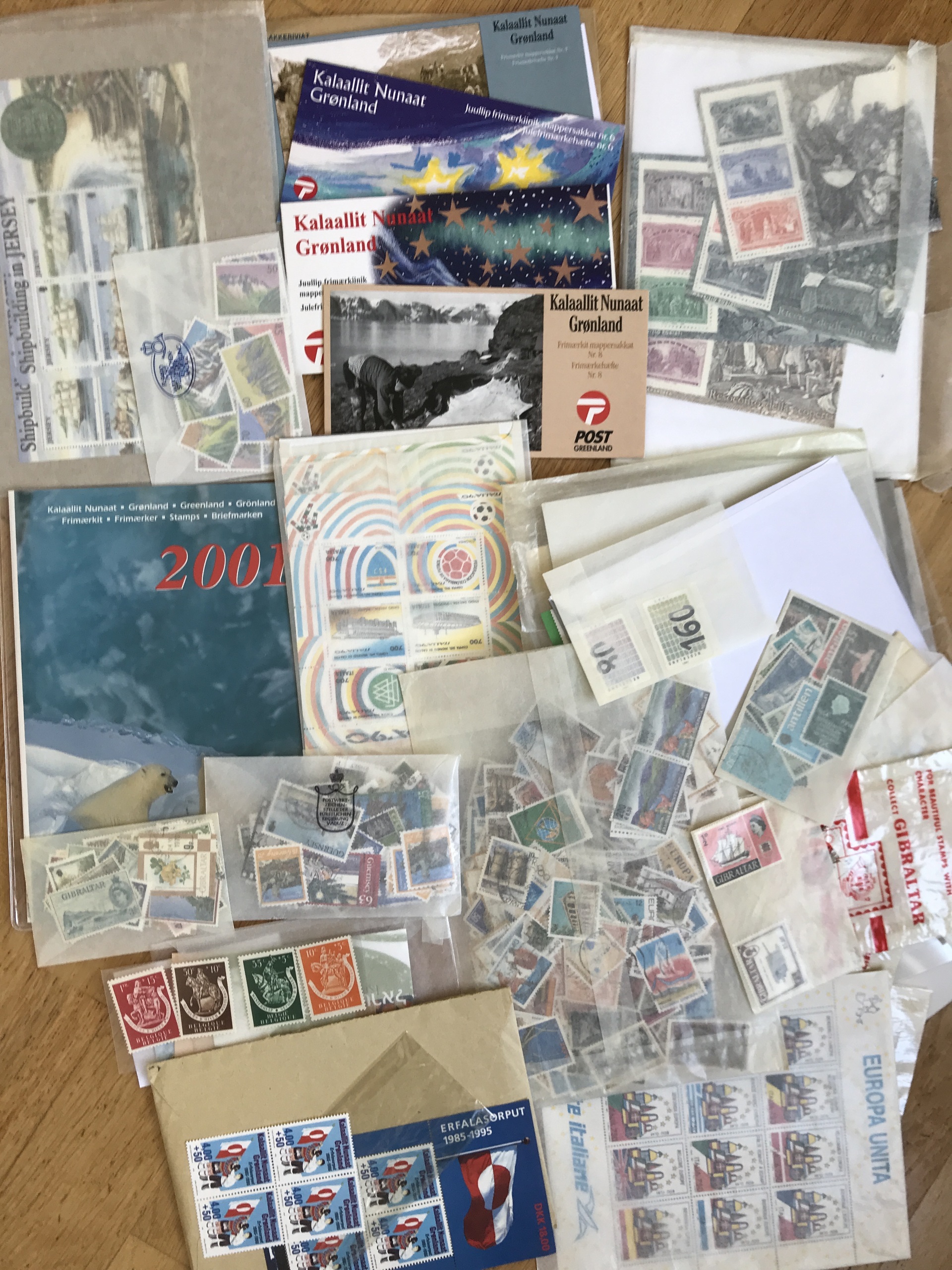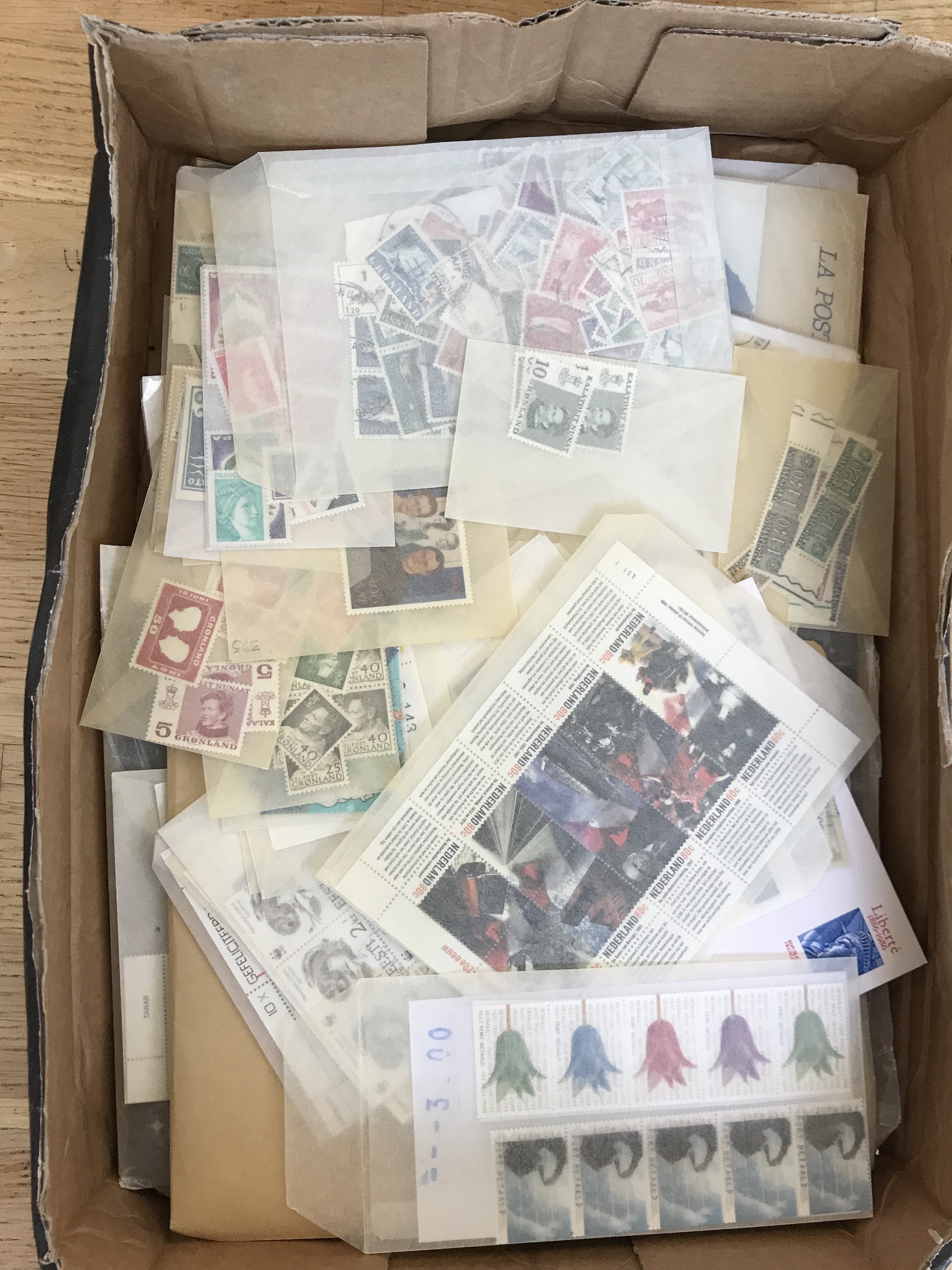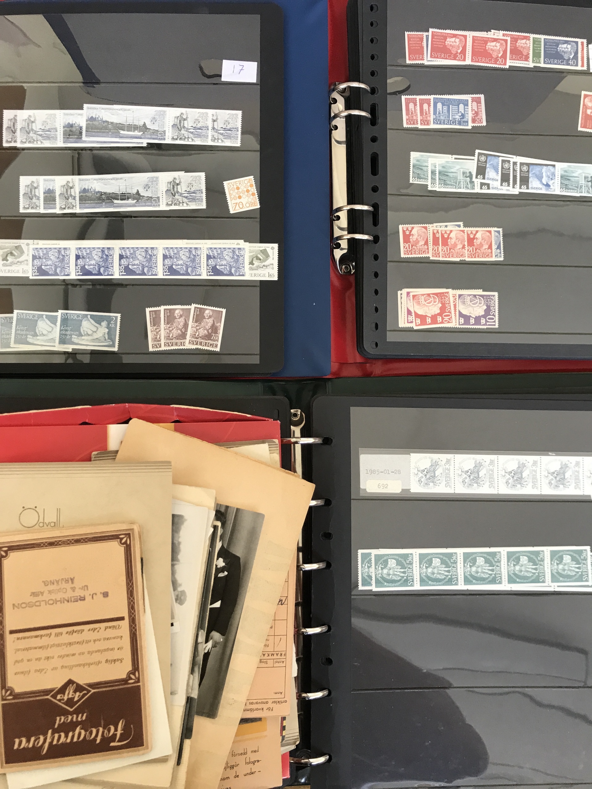 ALL WORLD. ★★/★/⊙. Banana box with much ** incl. Sweden in three binders, stamps in envelopes incl.some booklets and souvenir sheets, some old photos and also three empty binders with leaves. Please see a selection of scans at www.philea.se. Approx. 14 kg.