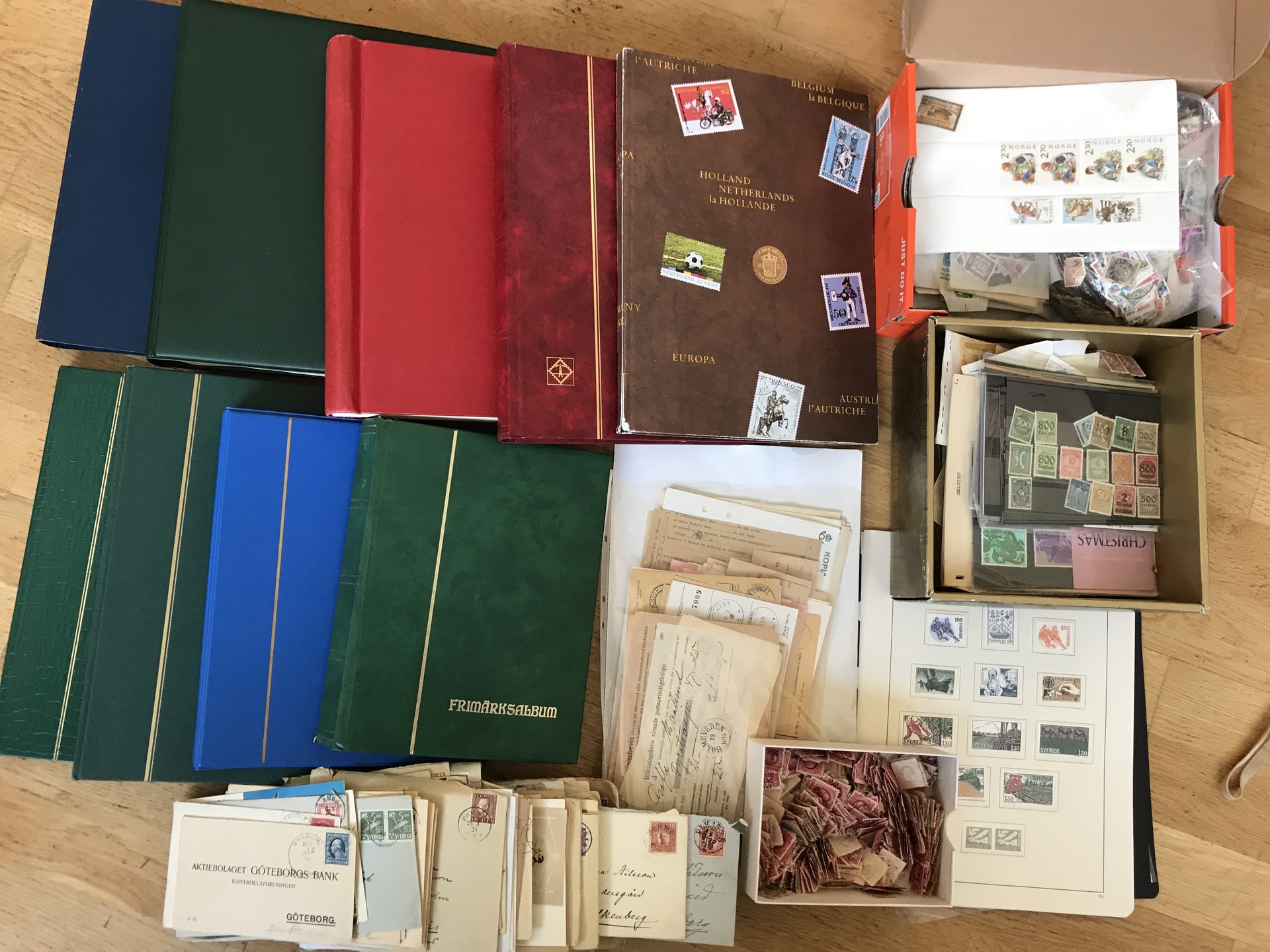 ALL WORLD. Mostly used. Banana box with 1000´s of stamps in e.g. nine albums, leaves and envelopes from various countries, covers and cards etc. incl. much Sweden etc. Approx. 14 kg.
