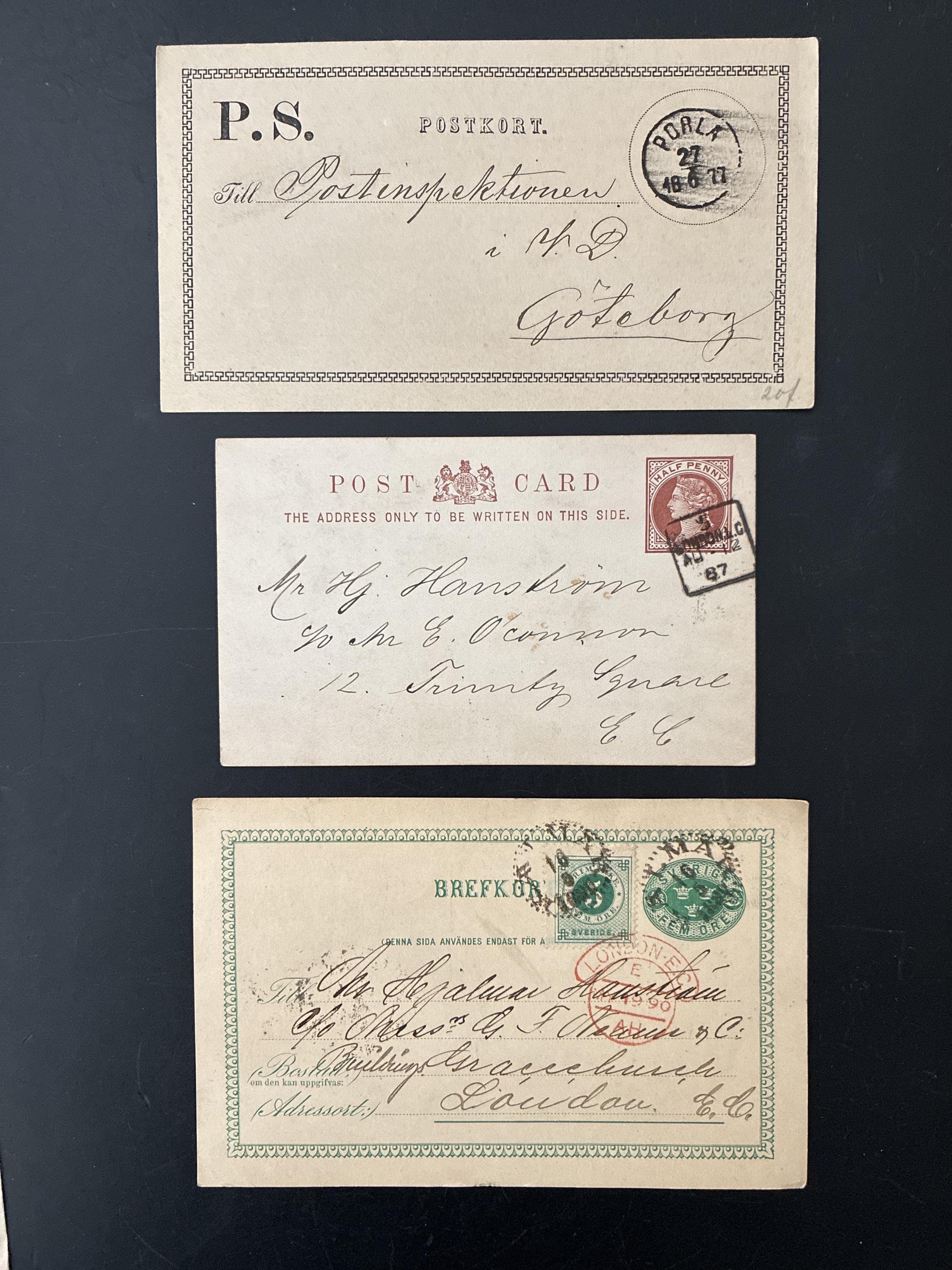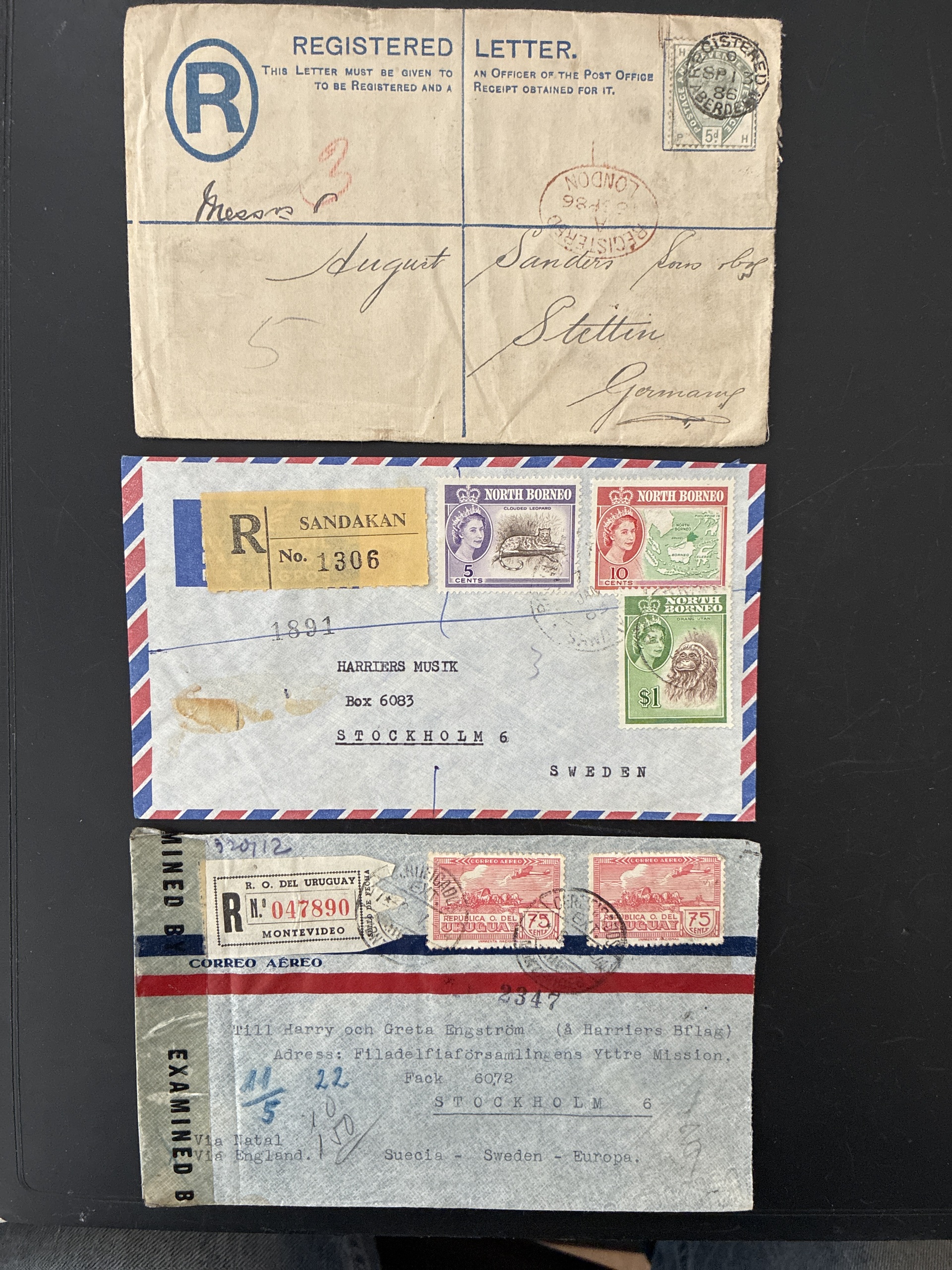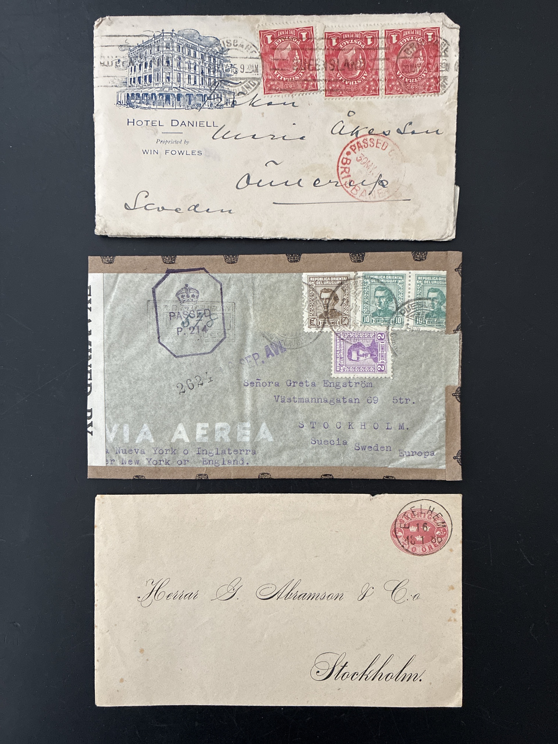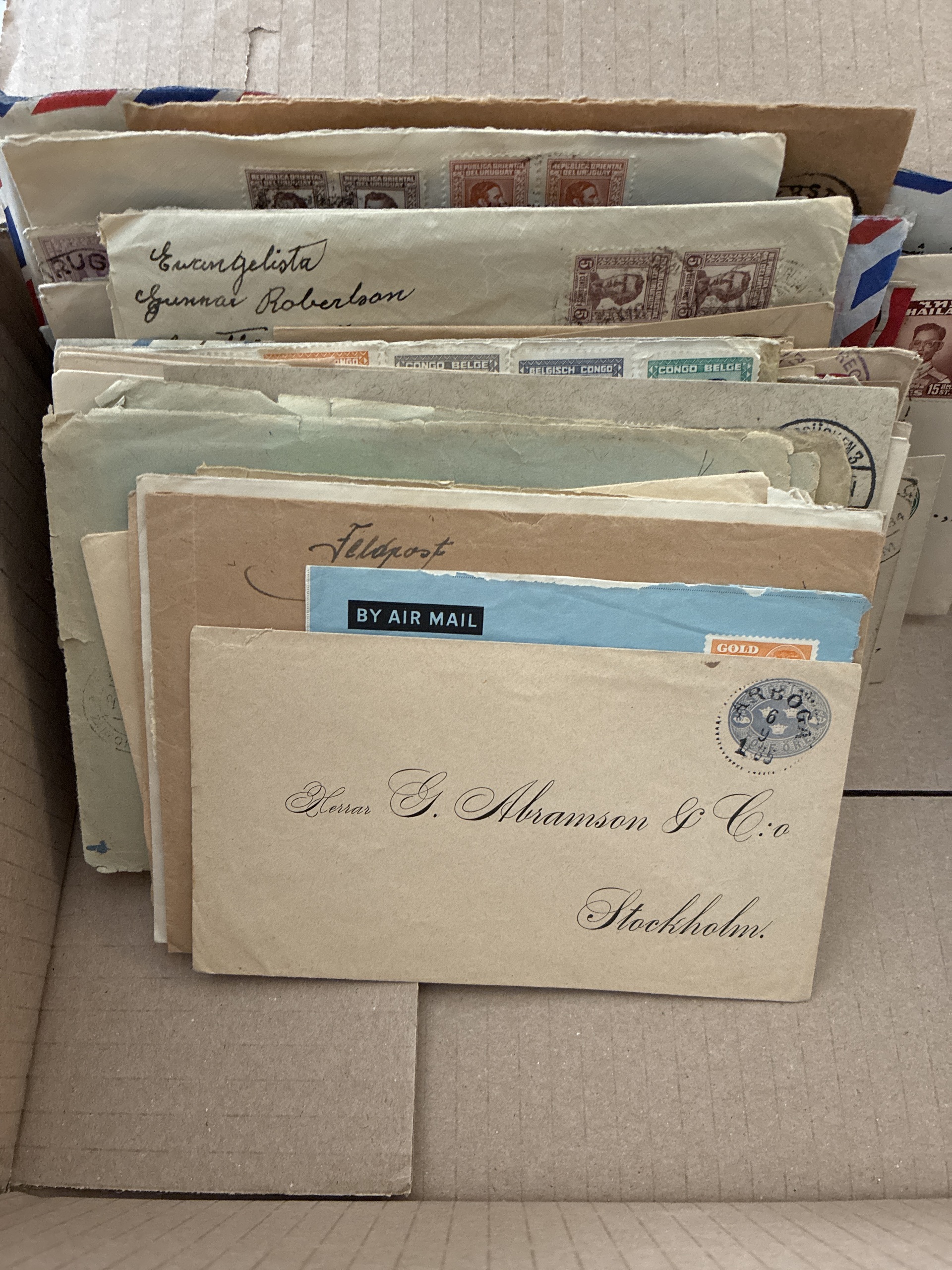 ALL WORLD. Lot covers 1870–1960s in box. Covers and cards with some better GB. Swedish postal stationeries and some South America airmail 1930s. Sold on behalf of Stockholms stasdsmission. Please see a selection of scans at www.philea.se. Mixed quality. (110)