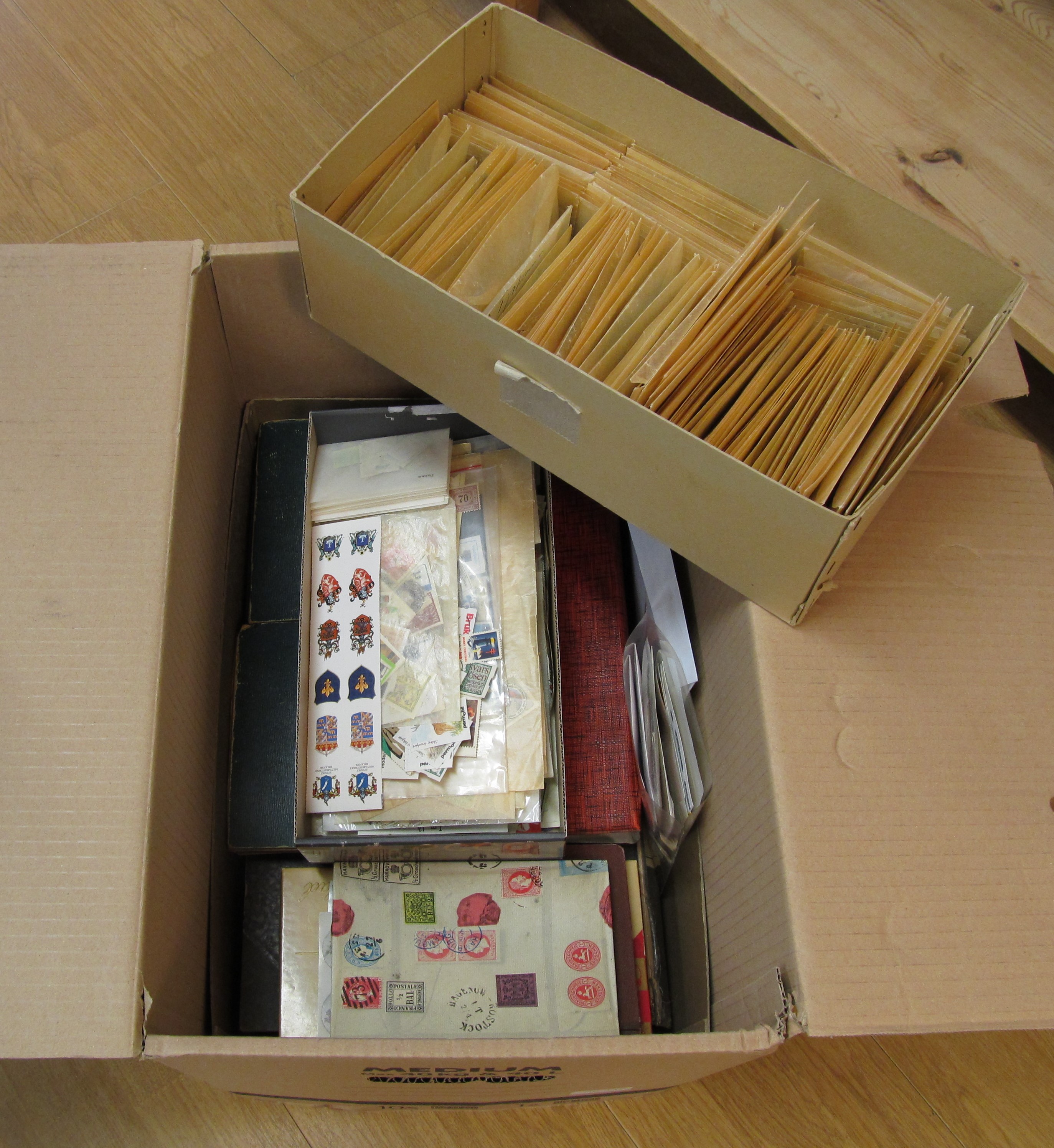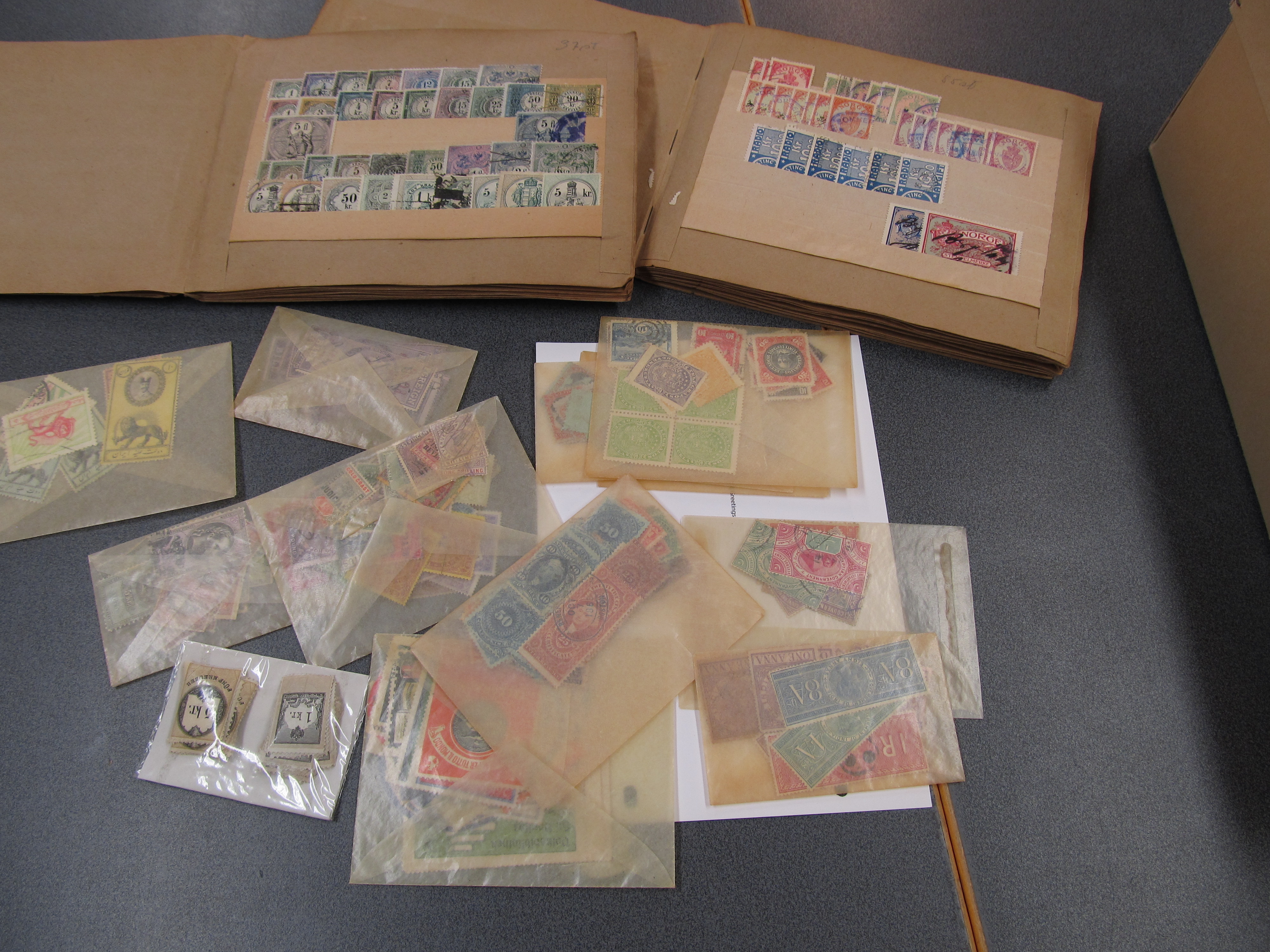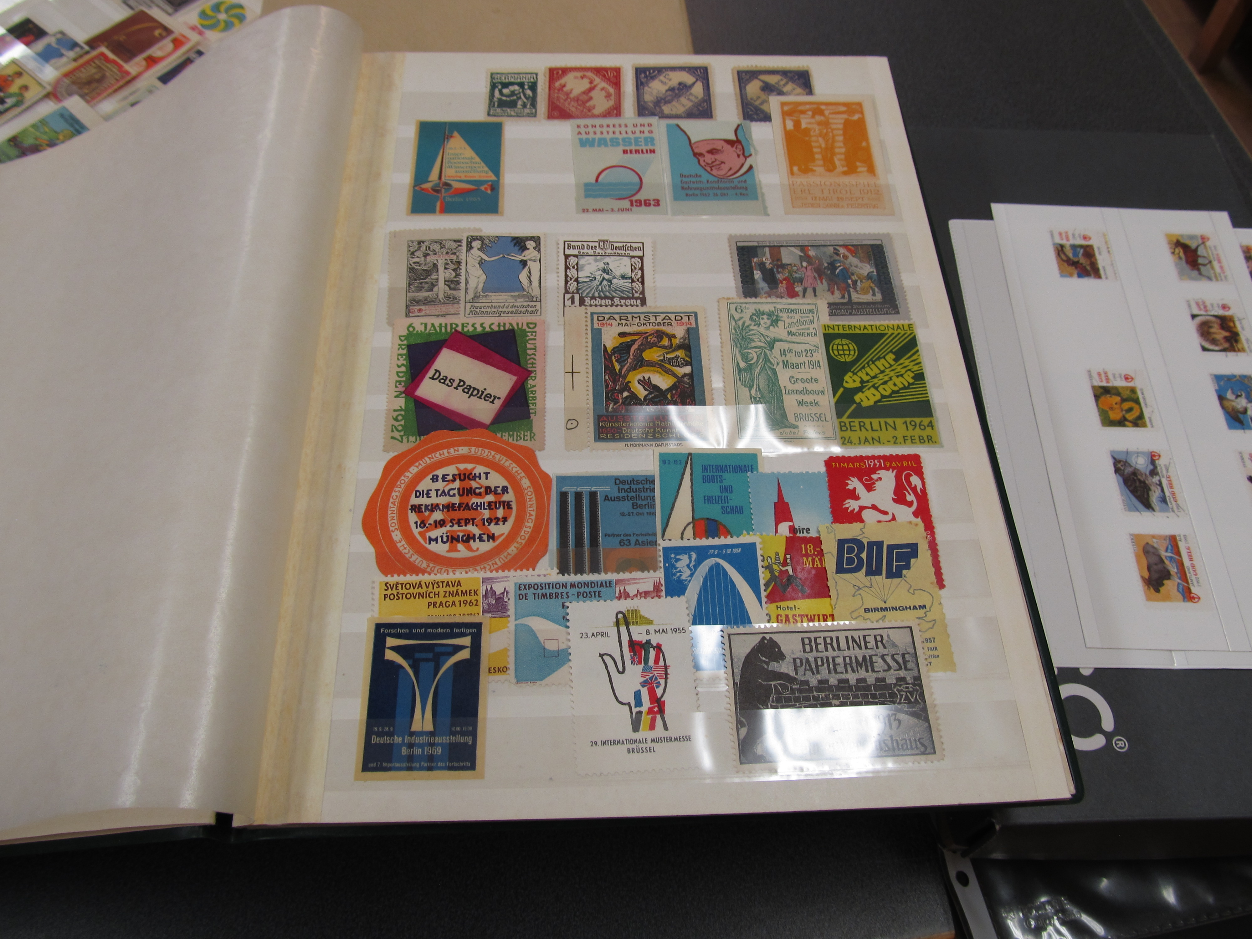ALL WORLD. Cinderella, accumulation in mid-size removal box. Interesting mixture contaning old revenue stamps in well filled glassine envelopes, appears to be sorted by country. One binder, some various size stockbooks, envelopes, loose leaves and plastic folders containing old to more modern labels and seals, etc. The major part appears to be purchased from the sale of the Esbjörn Janson estate. Some scans are presented at www.philea.se. Approx. 8 kg.