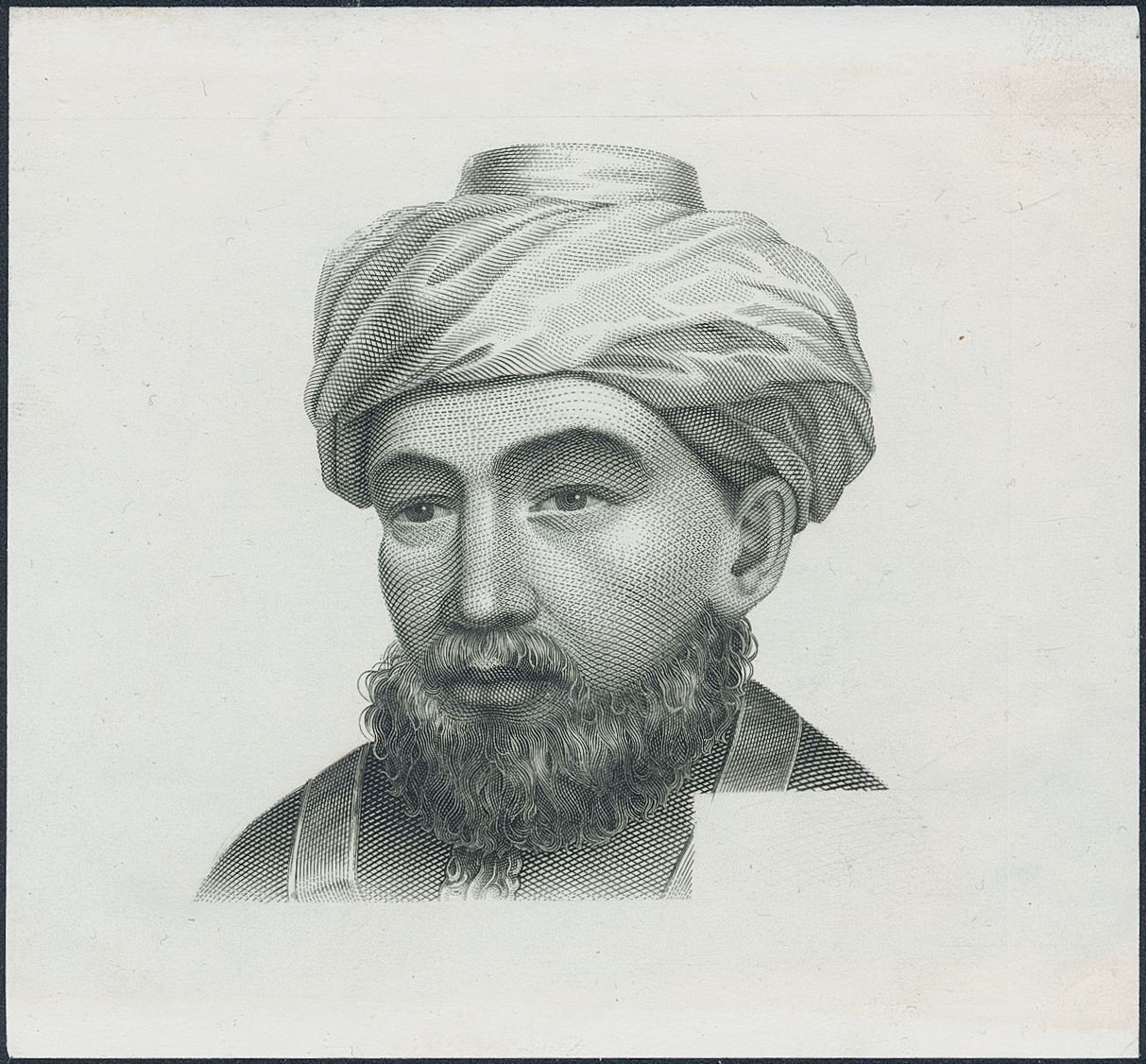 Thematics, Slania, Israel. (★). Moses Maimonides (Rabbi Mose ben Maimon) (1134–1204). Plate proof in greyish-olive for banknote.