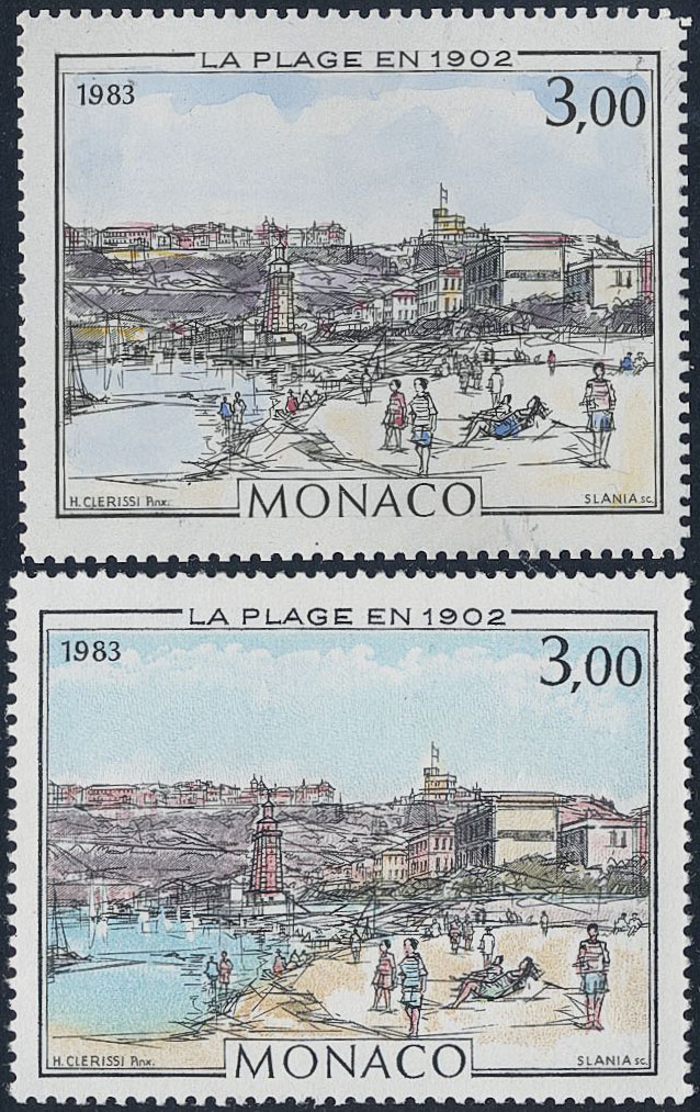 Thematics, Slania, Monaco. Michel 1589. (★). 1983 Belle Epoque II 3 Fr. Stamp proof hand-coloured by Slania. Unique item! Issued stamp enclosed.