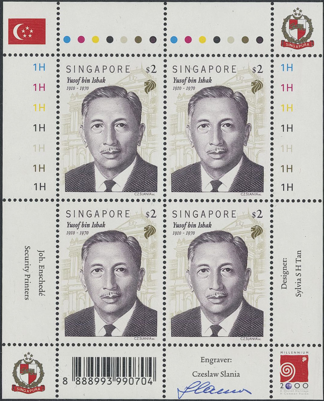 Thematics, Slania, Singapore. Michel 959. ★★. 1999 Y. bin Ishak $ 2 in minisheet with four stamps, signed "Slania".