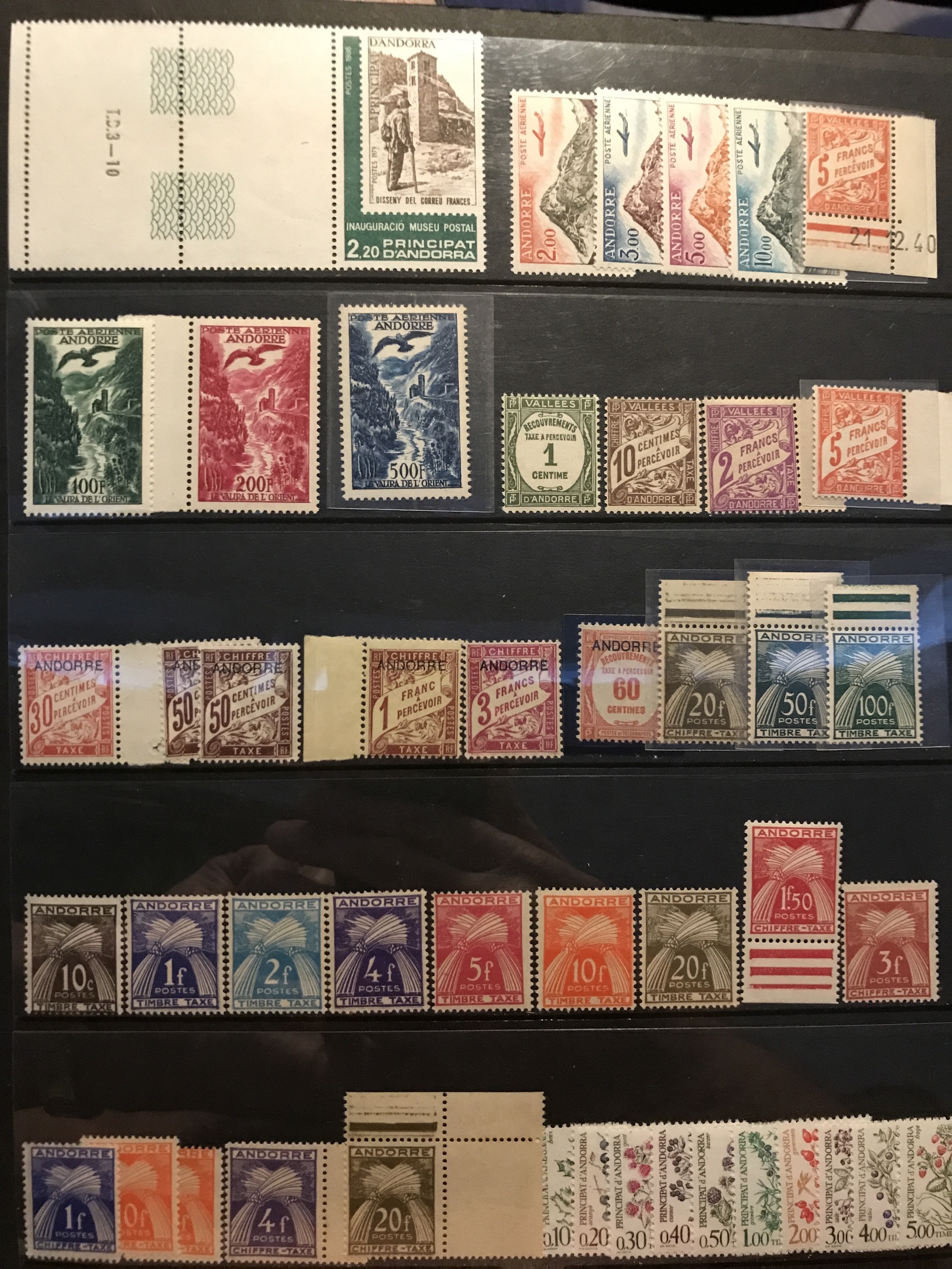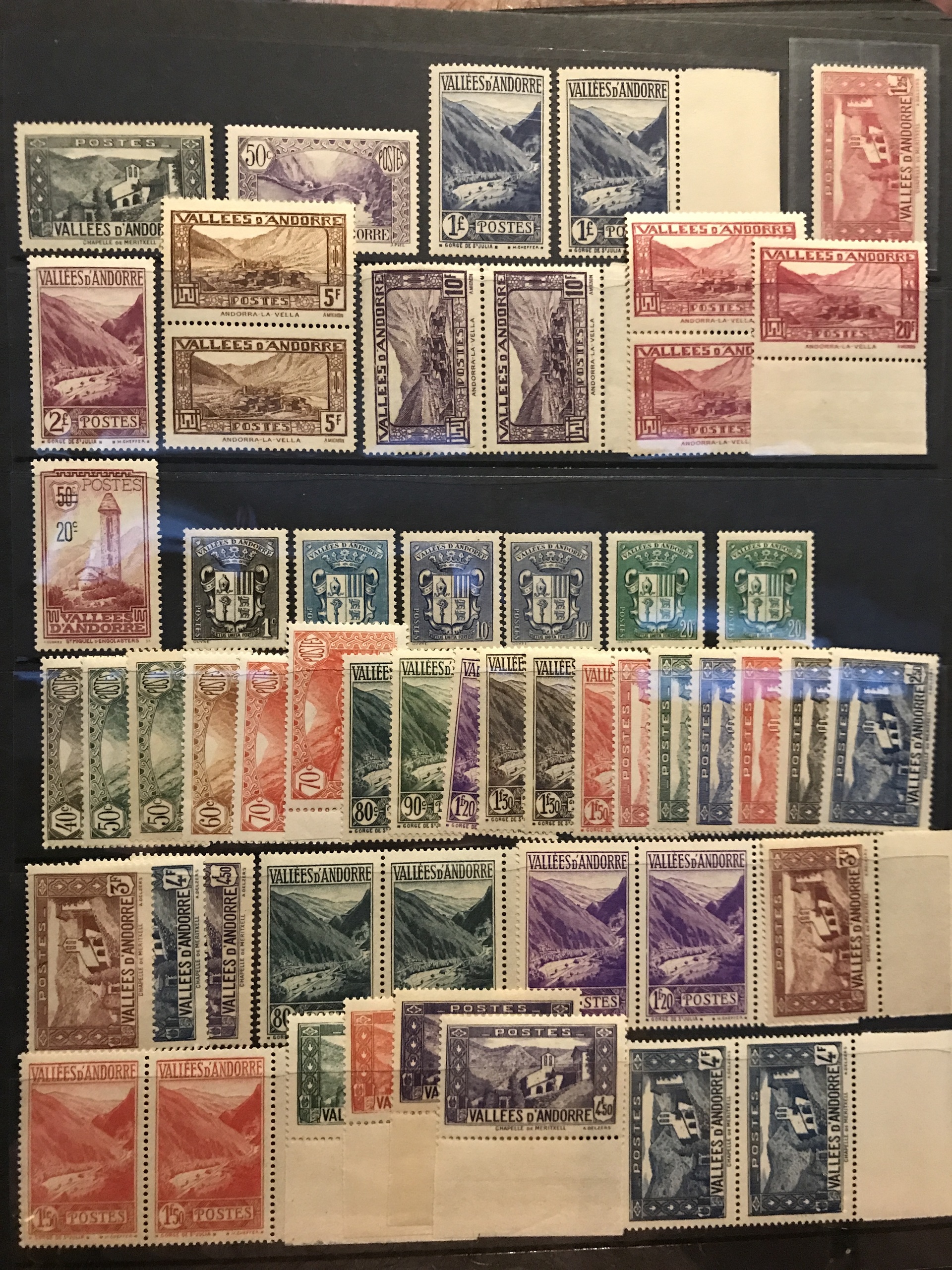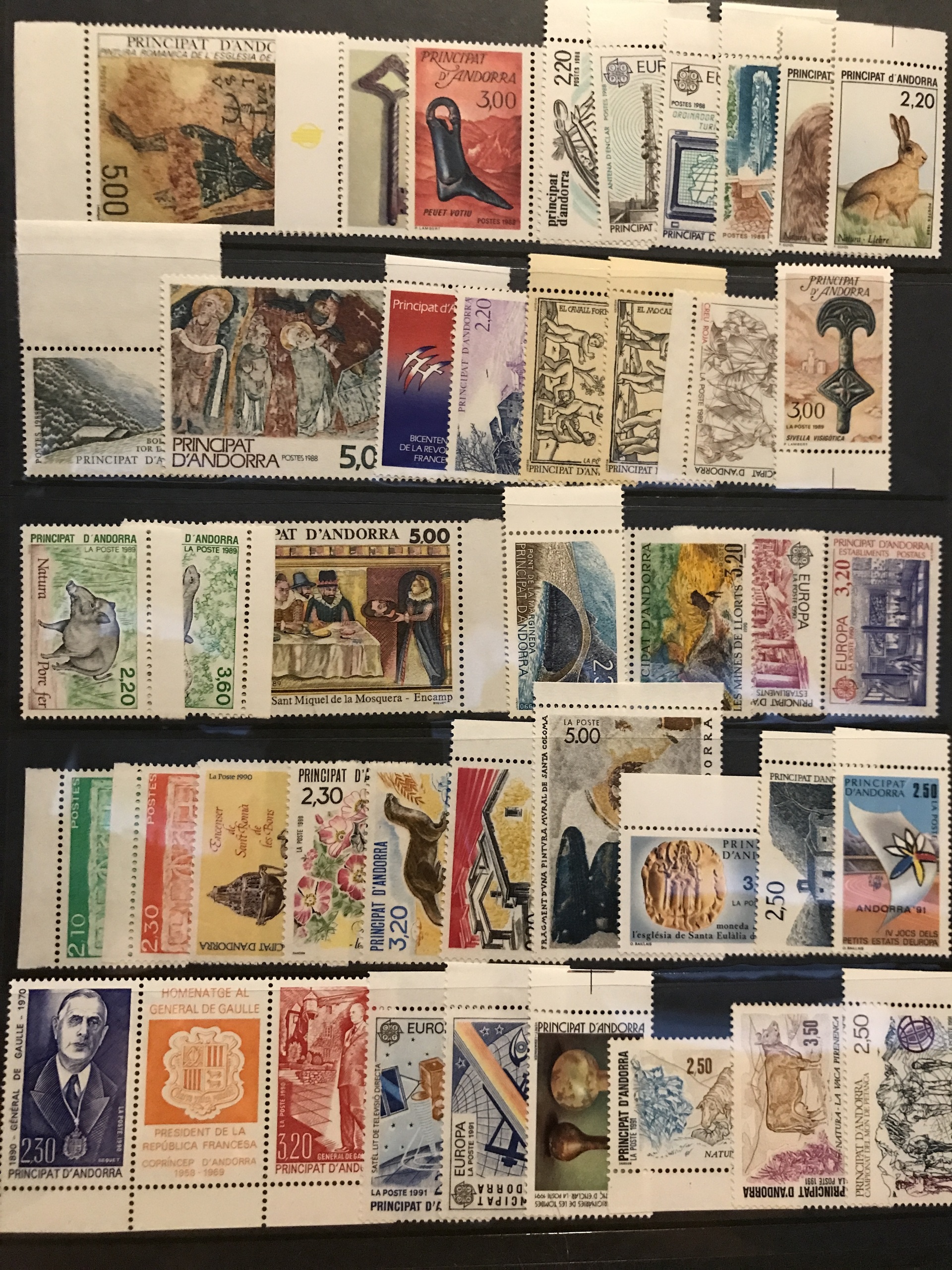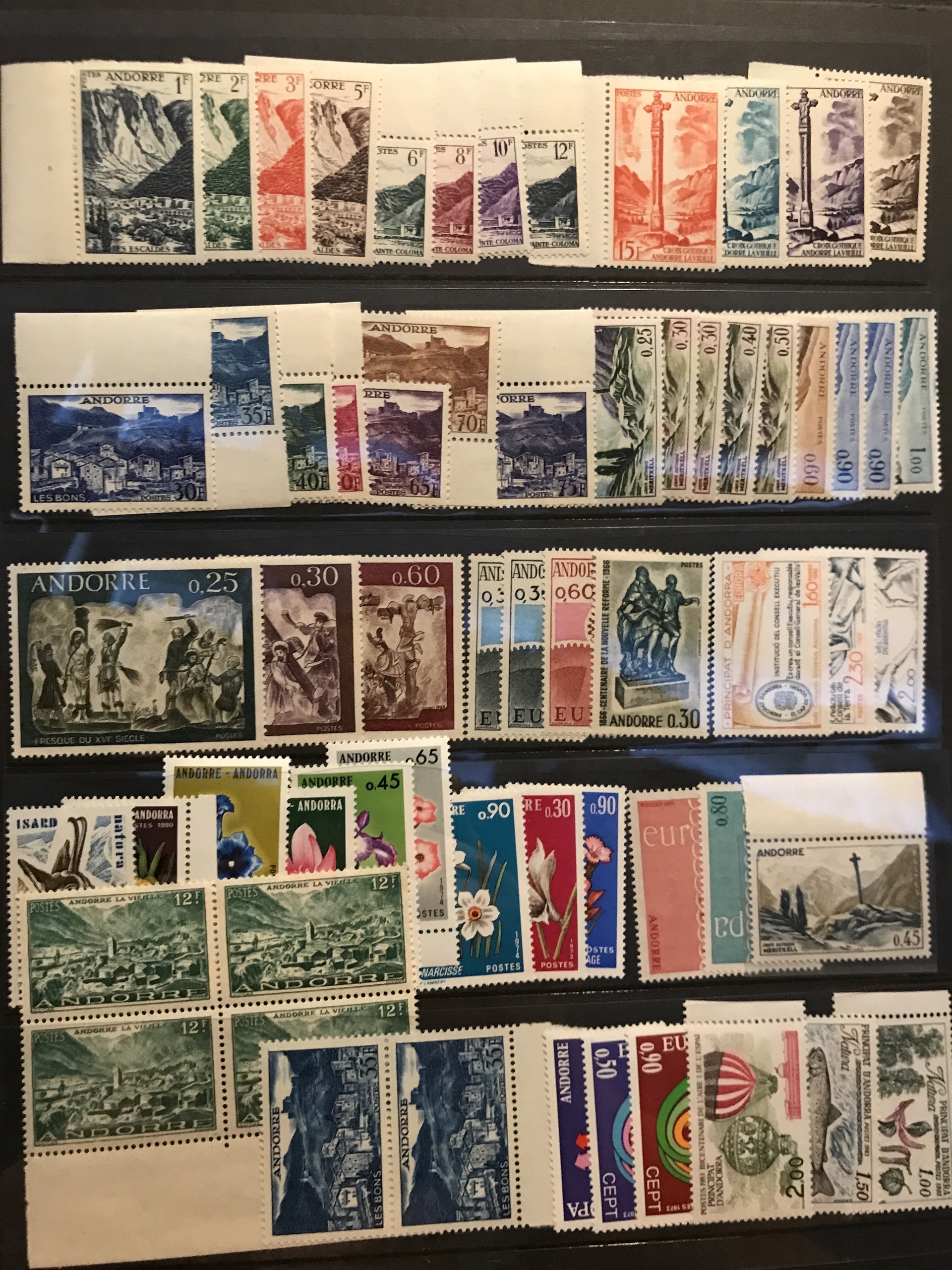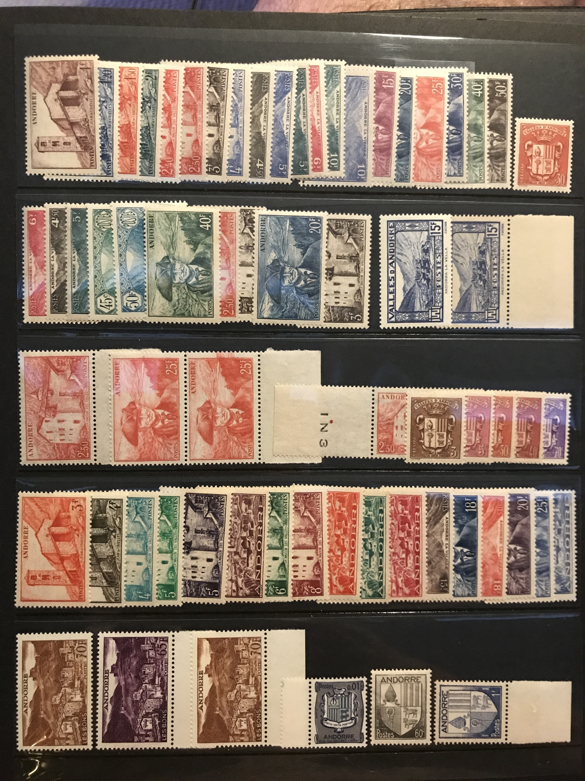Andorra (French post). ★★/★. Mainly ** lot 1932–1997 on nine visir leaves. Containing many sets incl. e.g. Mi142–60 cpl., some Back-of-the-book, etc. Mi 1435 Euro acc. to vendor. Please see a selection of scans at www.philea.se. (>400)