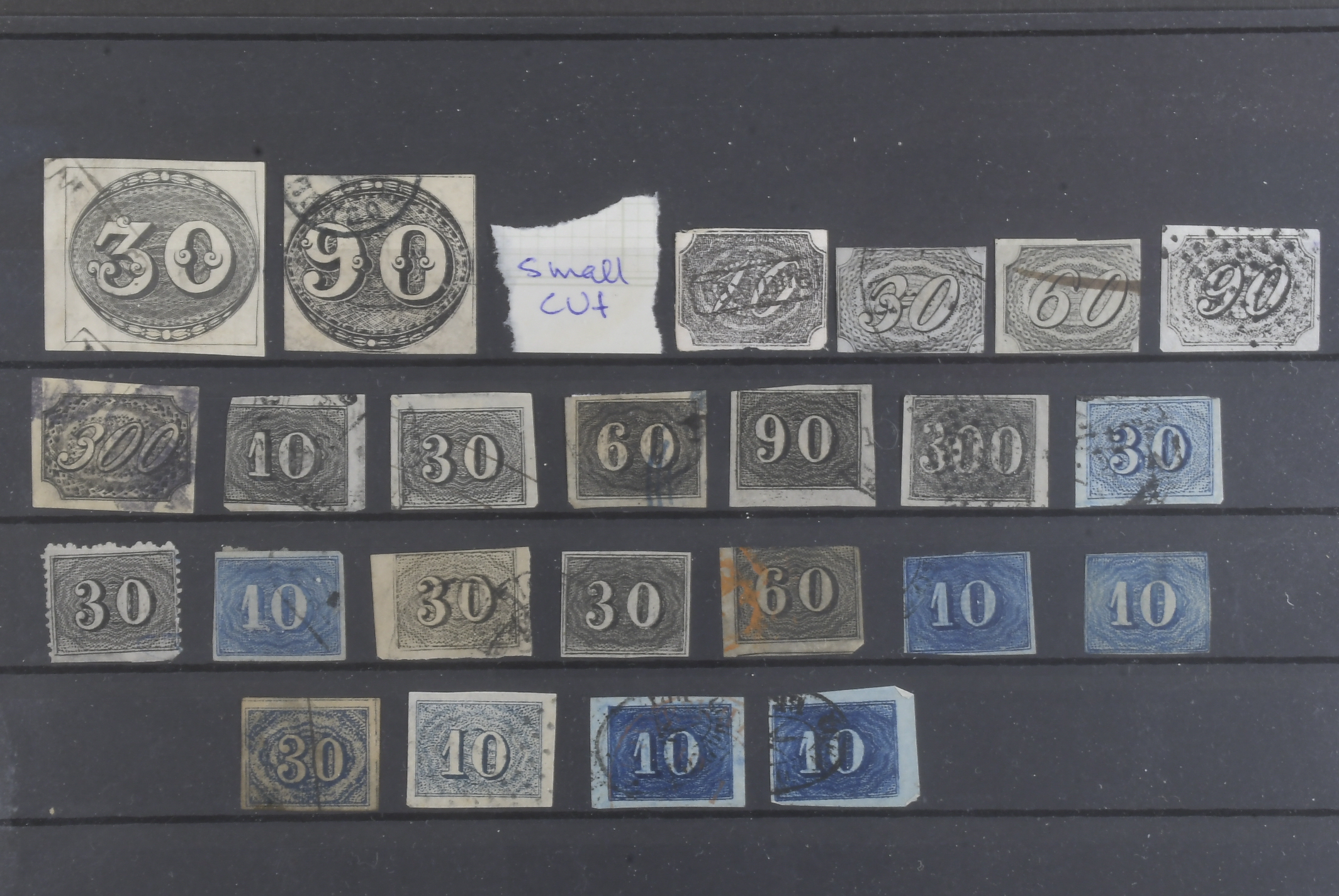 Brazil. Lot used 1843–1860 on stock card. Study lot with genuine, fakes and forgeries. The entire lot is presented at www.philea.se. Mixed quality. (24)