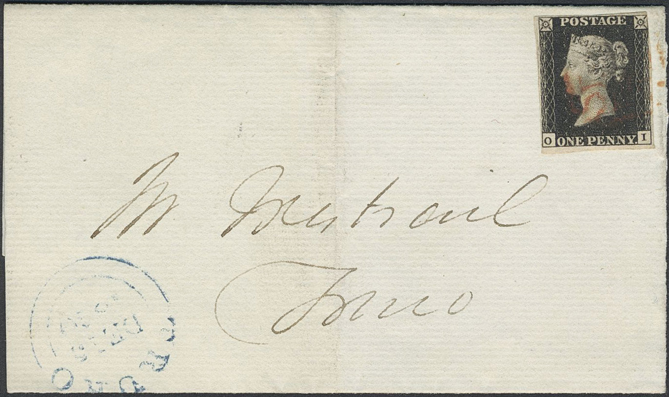 Britain. Michel SG2 on cover, One penny black (O I) local cover Truro with RED maltese cancel and blue Truro DE15 1840. Close cut on three margins. Pre usage fold.