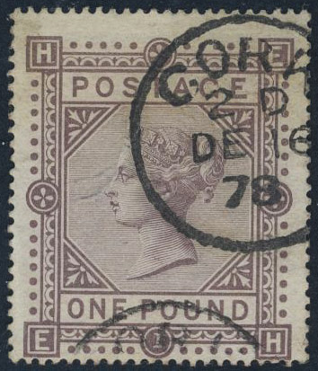 Britain. Michel 69x used, 1882 Queen Victoria wmk Large Anchor £1 brown lilac on white paper. Superb used £1 QV December 17th 1878 cds, wmk maltese cross SG #129 £4500. EUR 4800