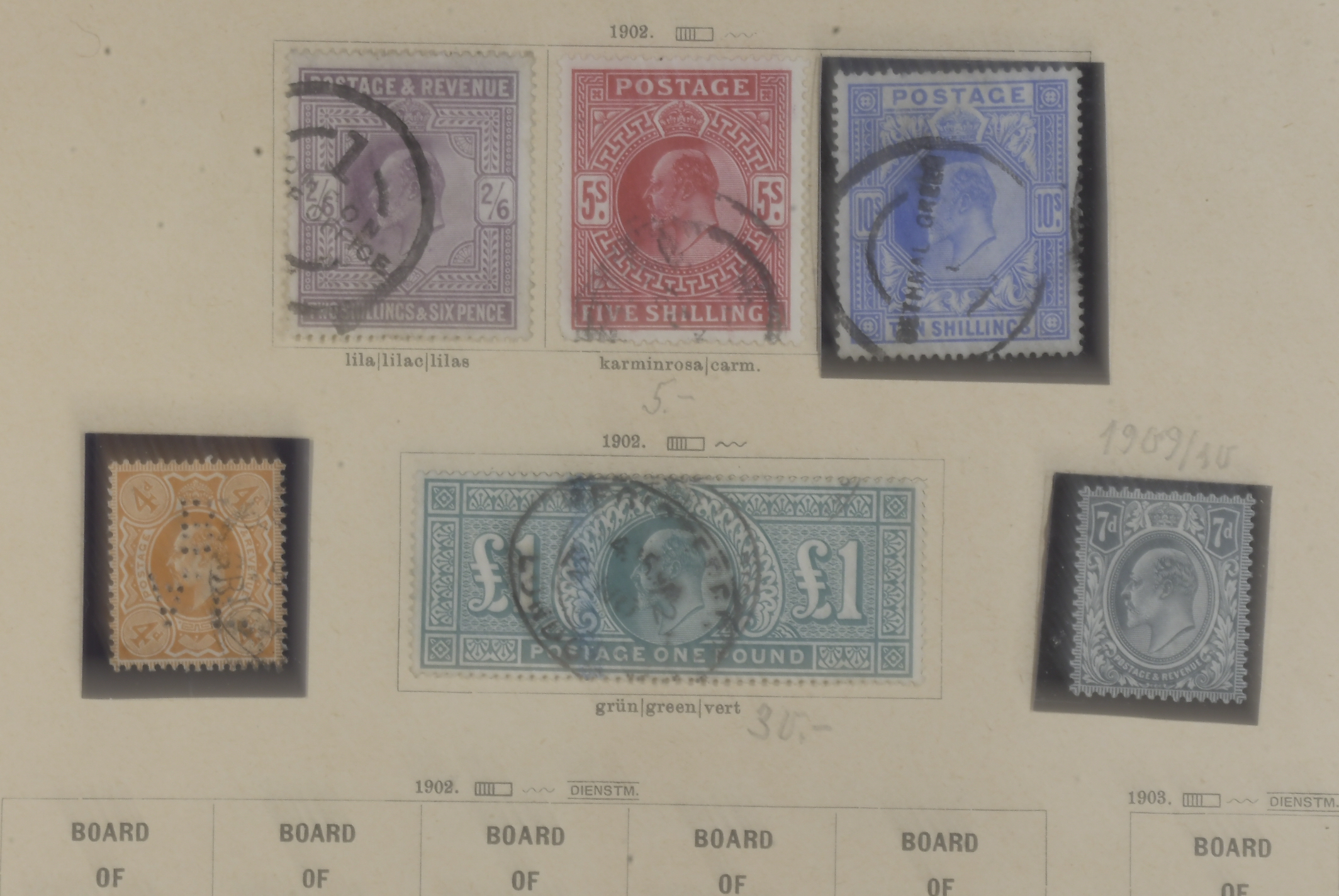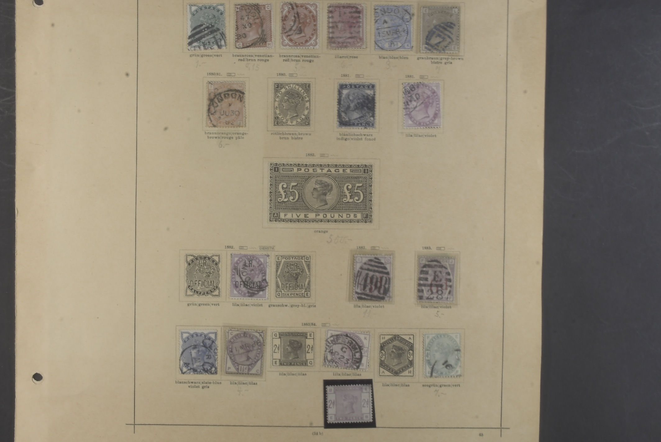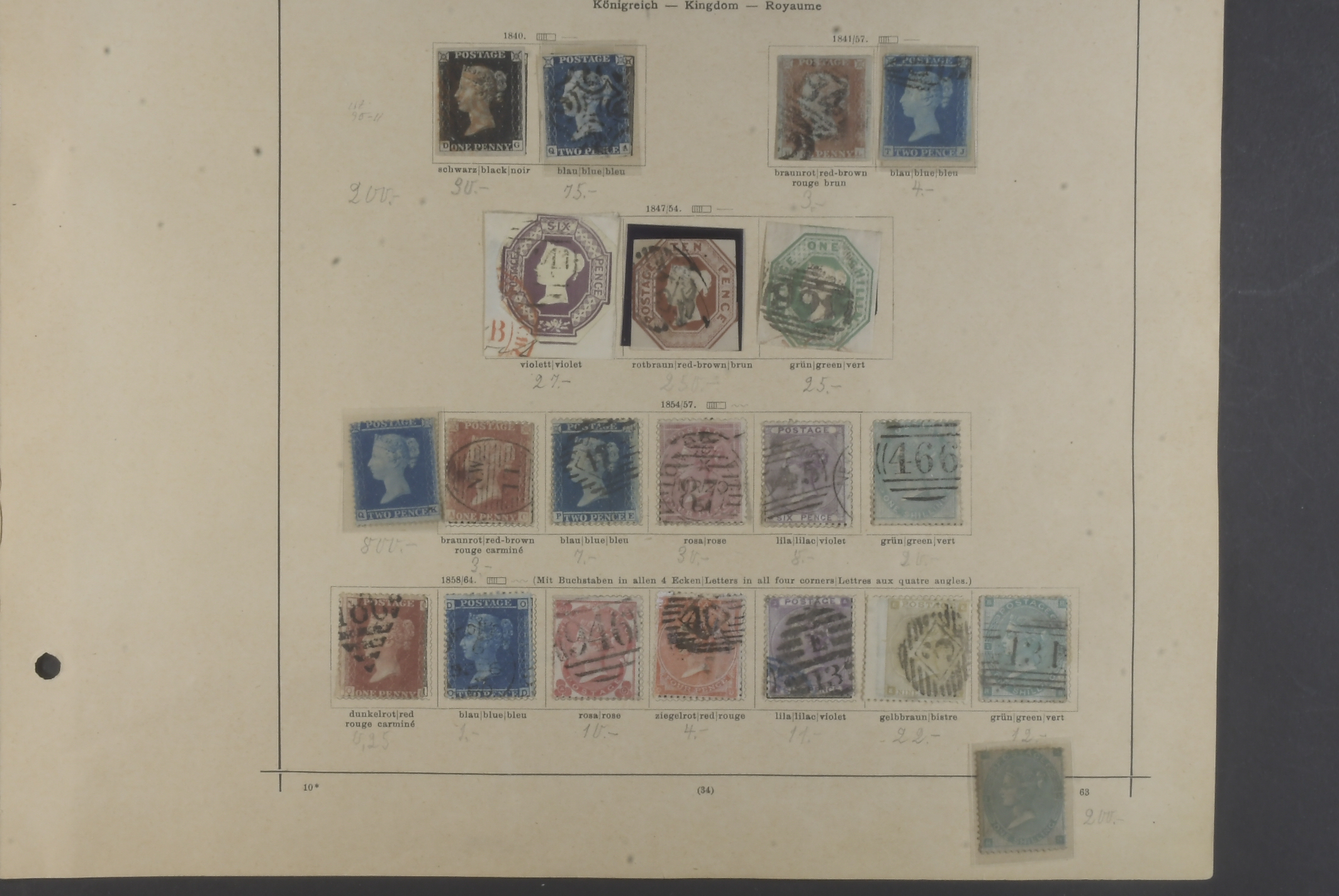 Britain. Collection ★/⊙ 1840–1911 on four album leaves. Old time collection with many better stamps but in mixed condition. incl. 10s 1878 (missing corner perf),10s and £1 1884, £1 1891, 10s and £1 1902. The entire lot is presented at www.philea.se. Mixed quality. (110+)