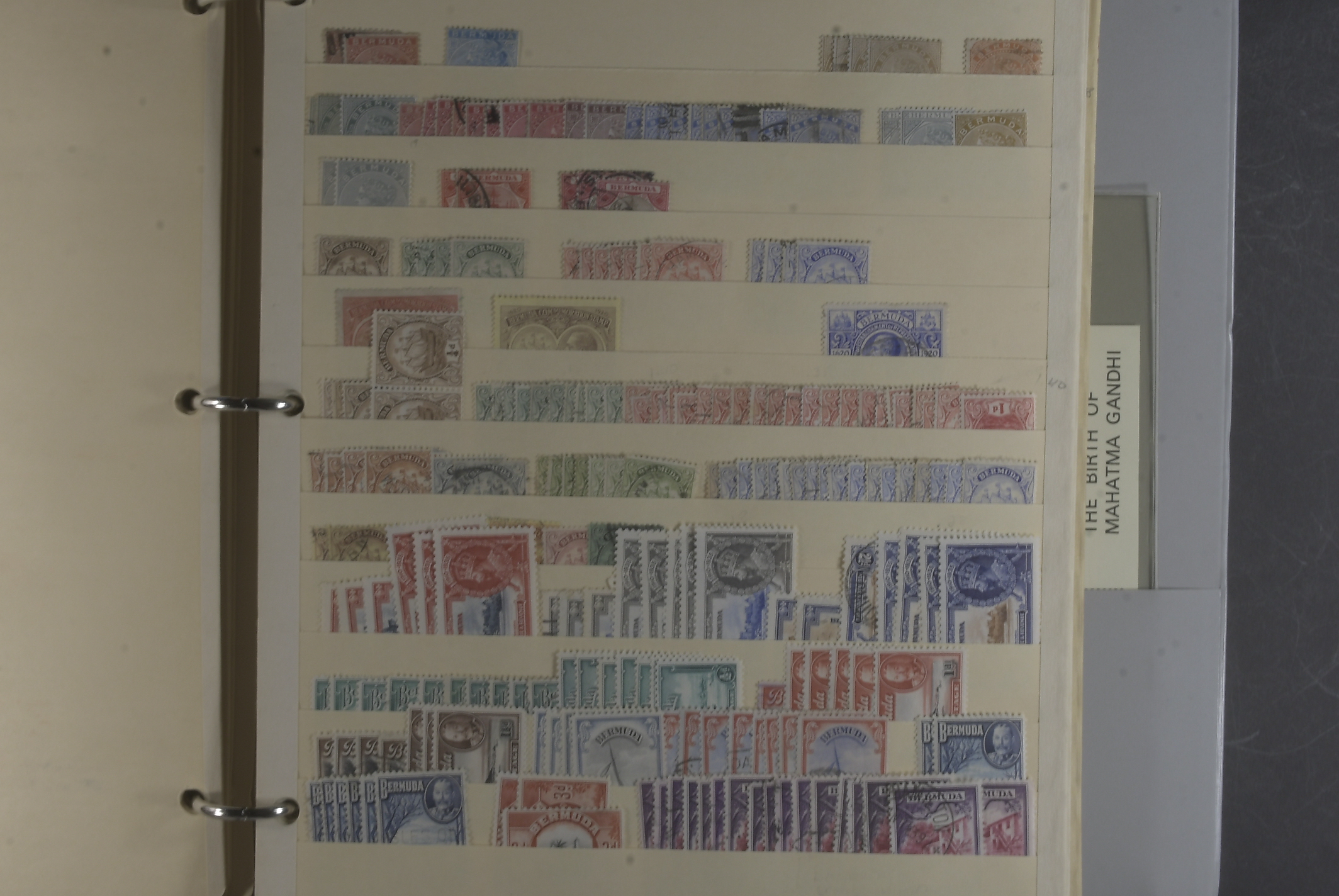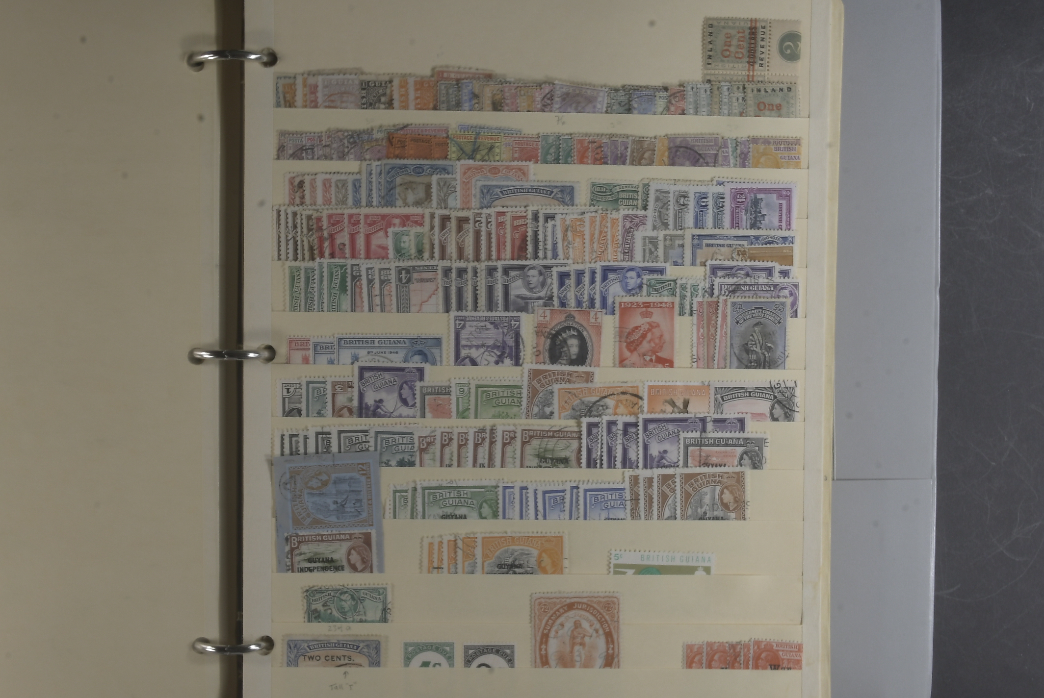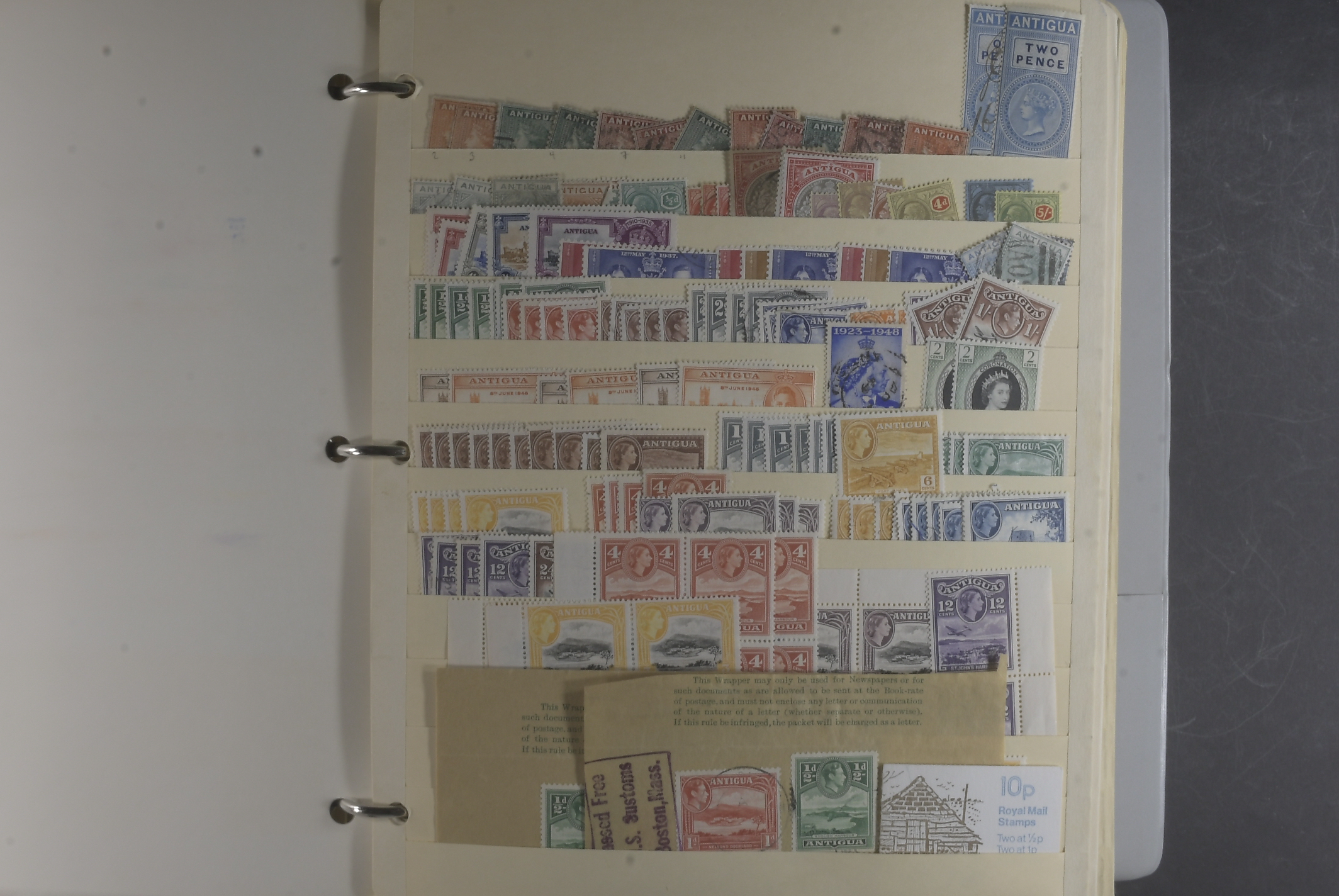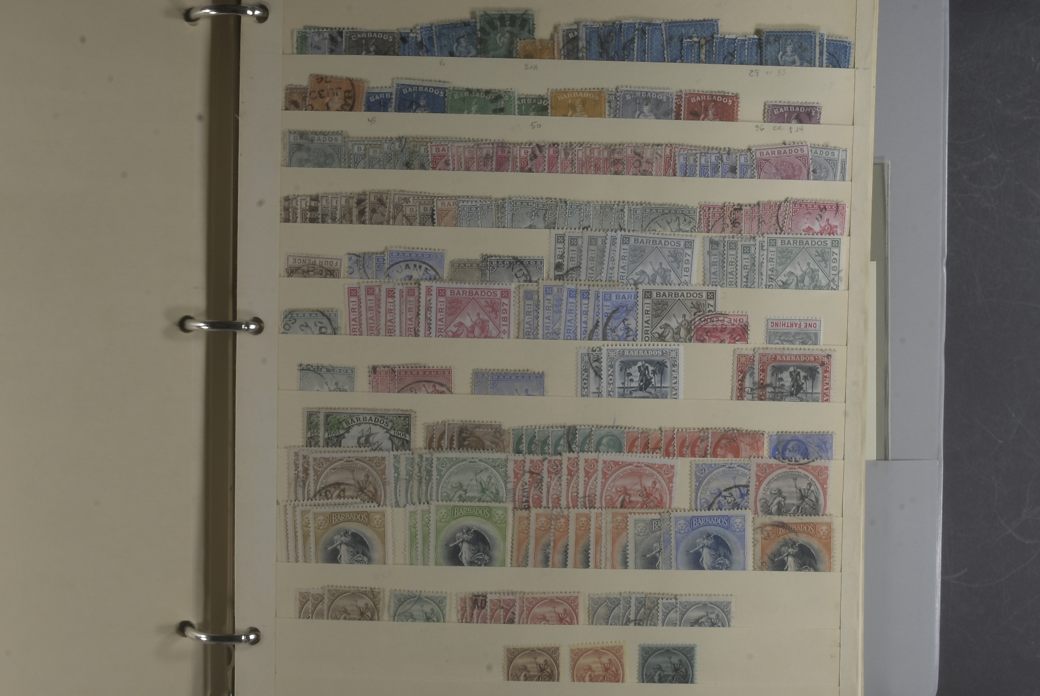 British commonwealth. Mostly used. British West Indies 1000s of stamps housed in one substantial volume, QV to QEII from Antigua onwards, primarily formed from stripping collections over many years and correspondingly loaded with value, presented stamp on stamp and of course a challenging viewing. Sets and high values all over the place, overall the accumulation will easily catalogue into 5 figures in SG. Check out Barbados to get an idea of how good this is.