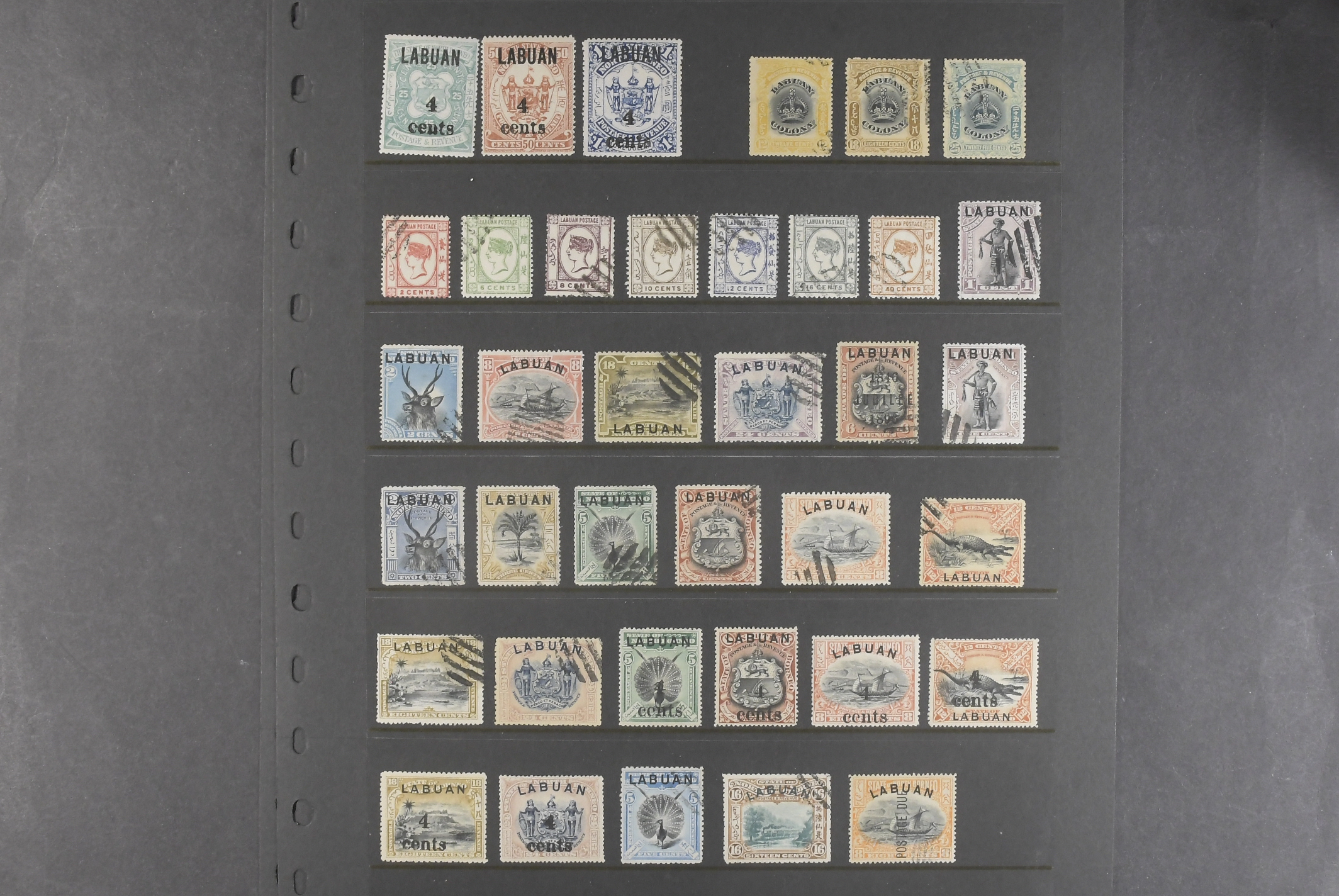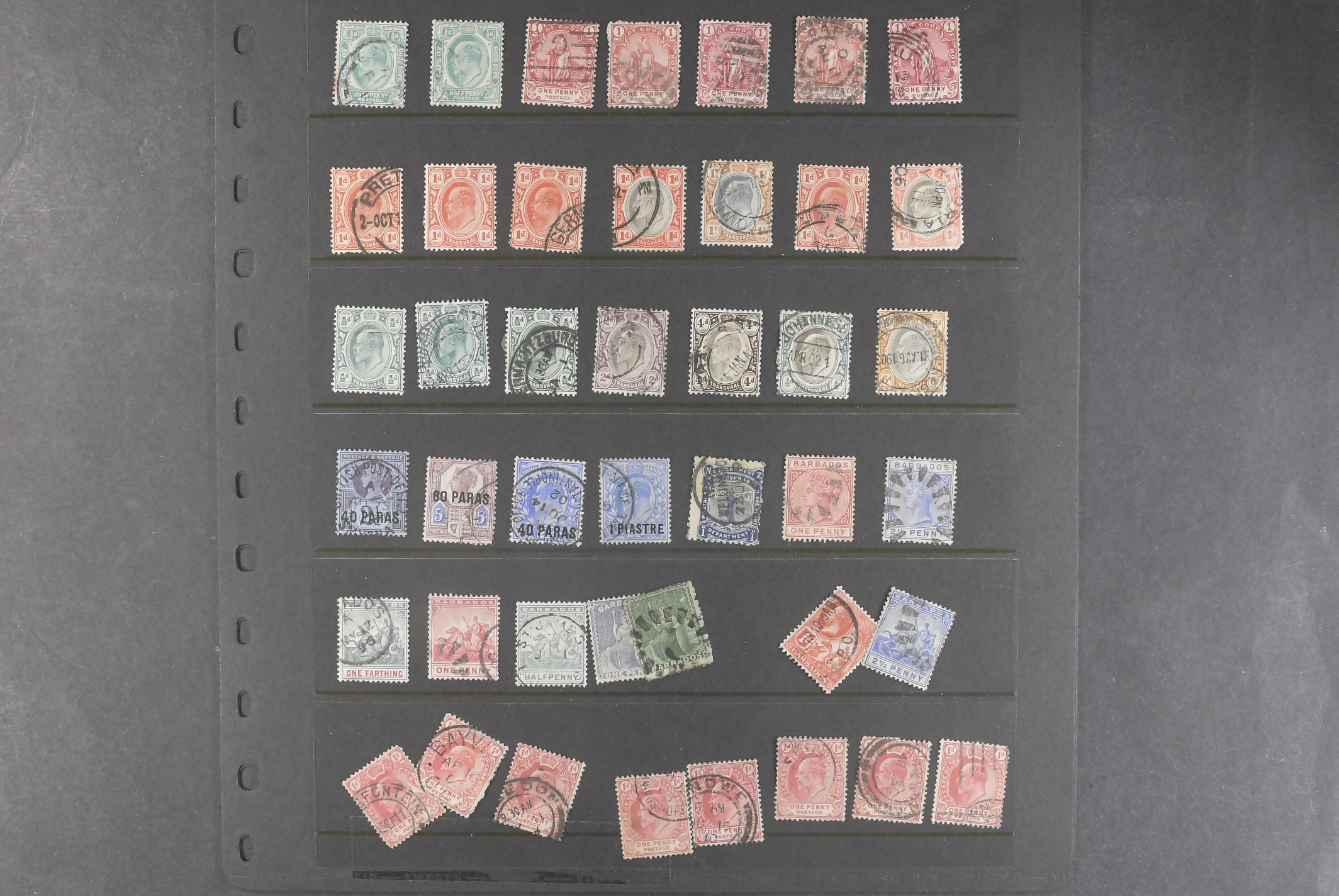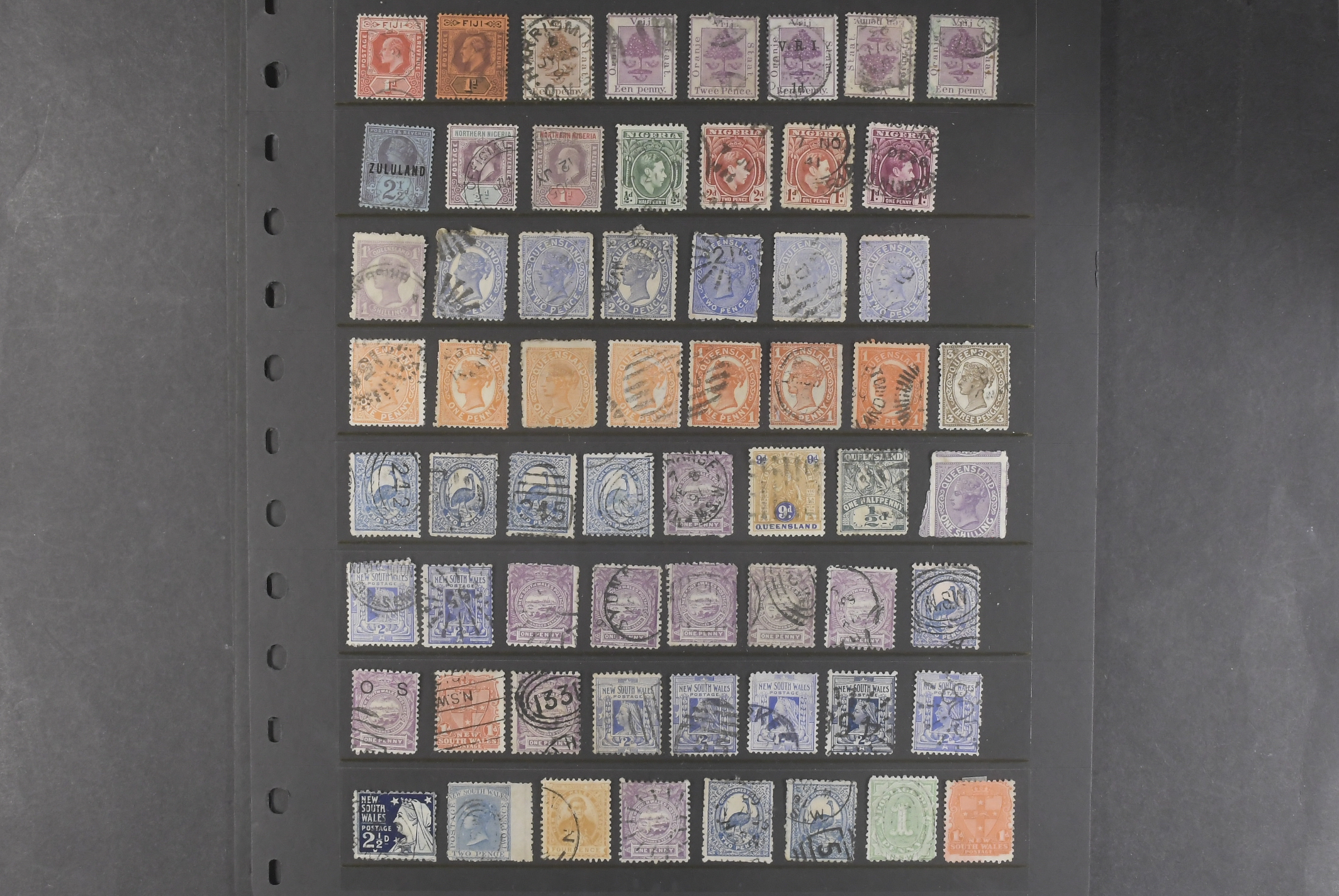British commonwealth. Accumulation mostly used 1880– on visir leaves. Twelve visir leaves with stamps from British Colonies, mainly in Asia (North Borneo, Labuan, Ceylon, Straits Settlements, Hongkong), Africa (Nigeria, South Africa, Zanzibar), Australian States and the Caribbean (Barbados, Trinidad, Bermuda). Additonally, three leaves with older stamps from the UK. Please see a selection of scans at www.philea.se. Somewhat mixed quality. (>600)