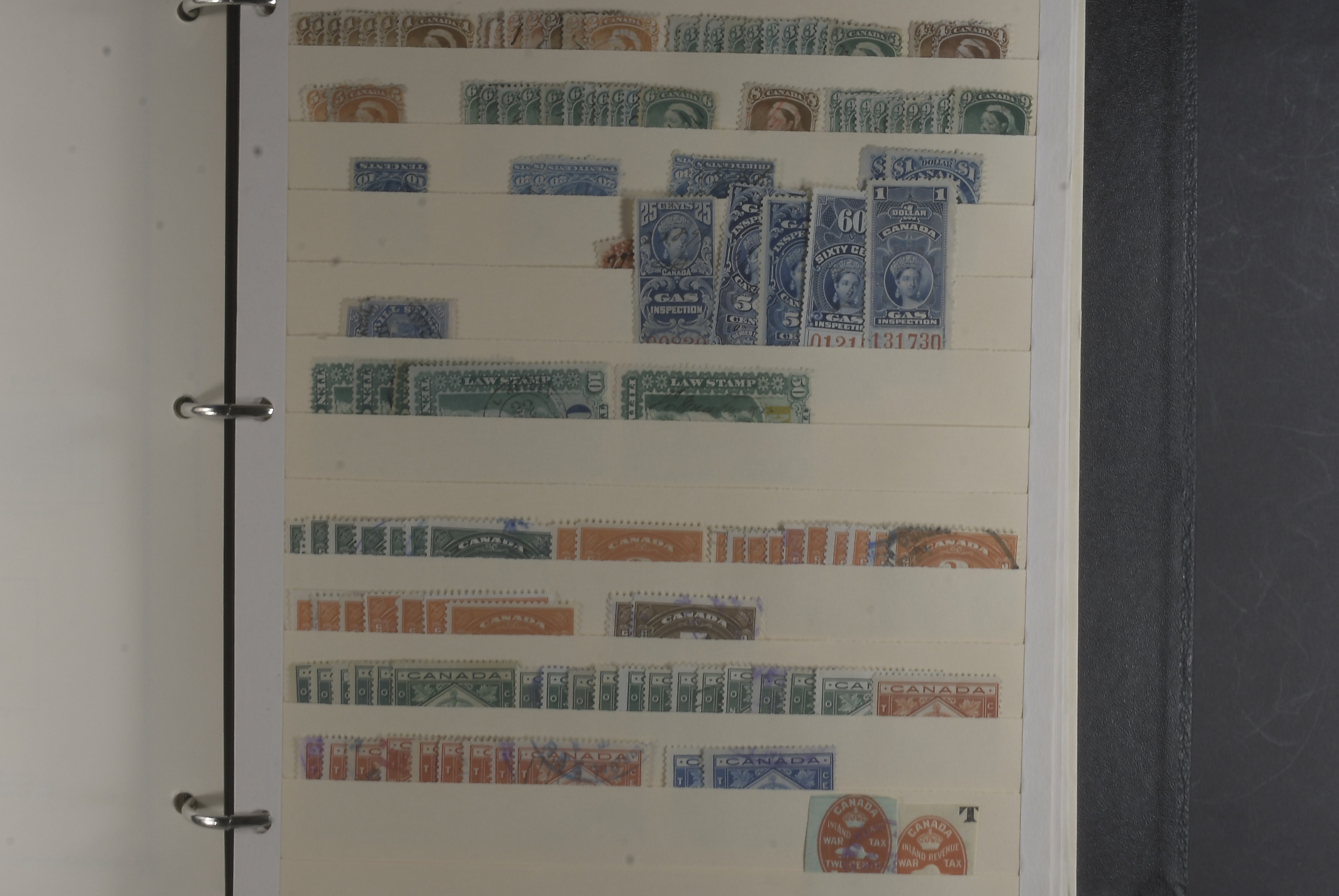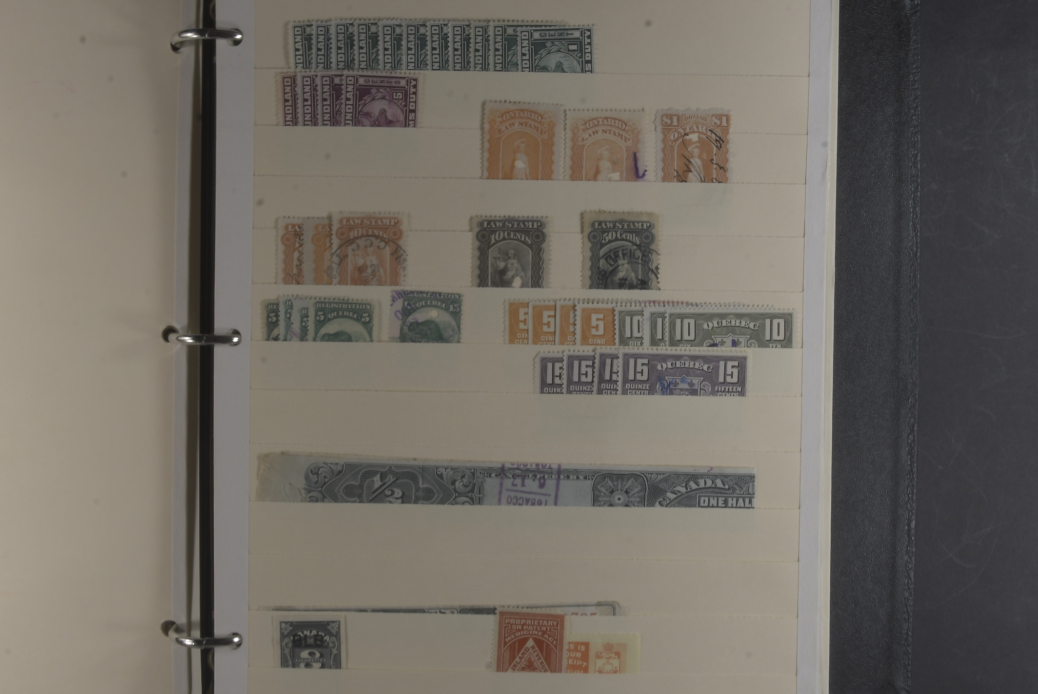 Canada. Mostly used. 1000s of stamps housed in one substantial volume, mint and used, including strong back of the book with pre-cancels from QV onwards, as well as perf-ins (with some literature). The best is probably the revenues, with QV by the dozens, as well as Newfoundland, Quebec and Ontario and other Provinces. Great fun for the Canadian specialist, as much more here than this outline description.
