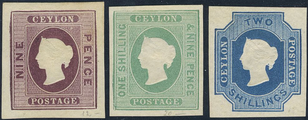 Ceylon. Military postal stationery (★), 2s blue, 9p maroon and 1s9p green proofs or trials for postal stationary (3).