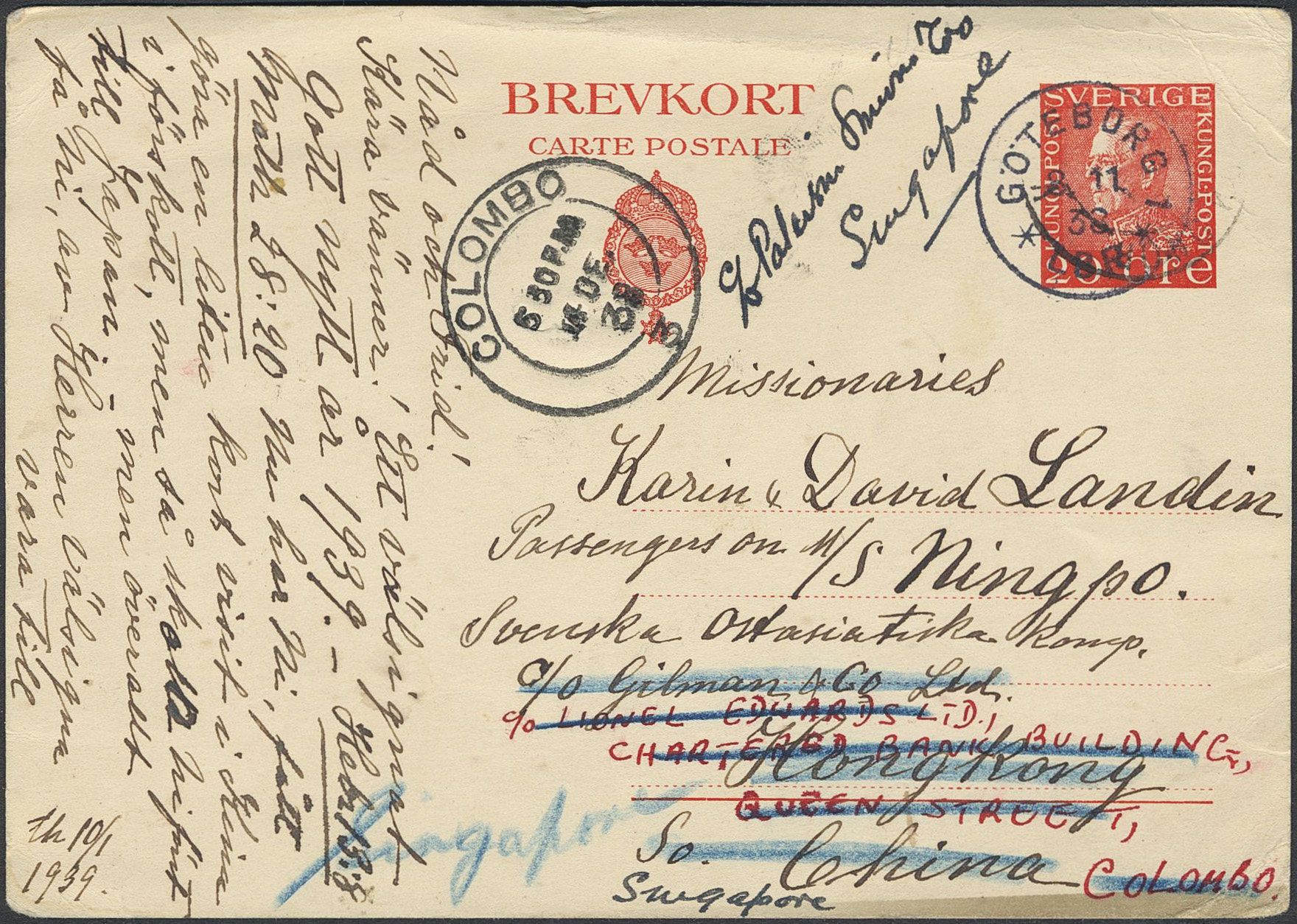 China, Incoming mail. Michel bKe34 on cover, Sweden. Postal card 20 öre sent from GÖTEBORG 1 2.11.38 to Hong Kong, then forwarded to Ceylon with arrival pmk COLOMBO 14.DE.38, then finally forwarded to Singapore. Nice item.