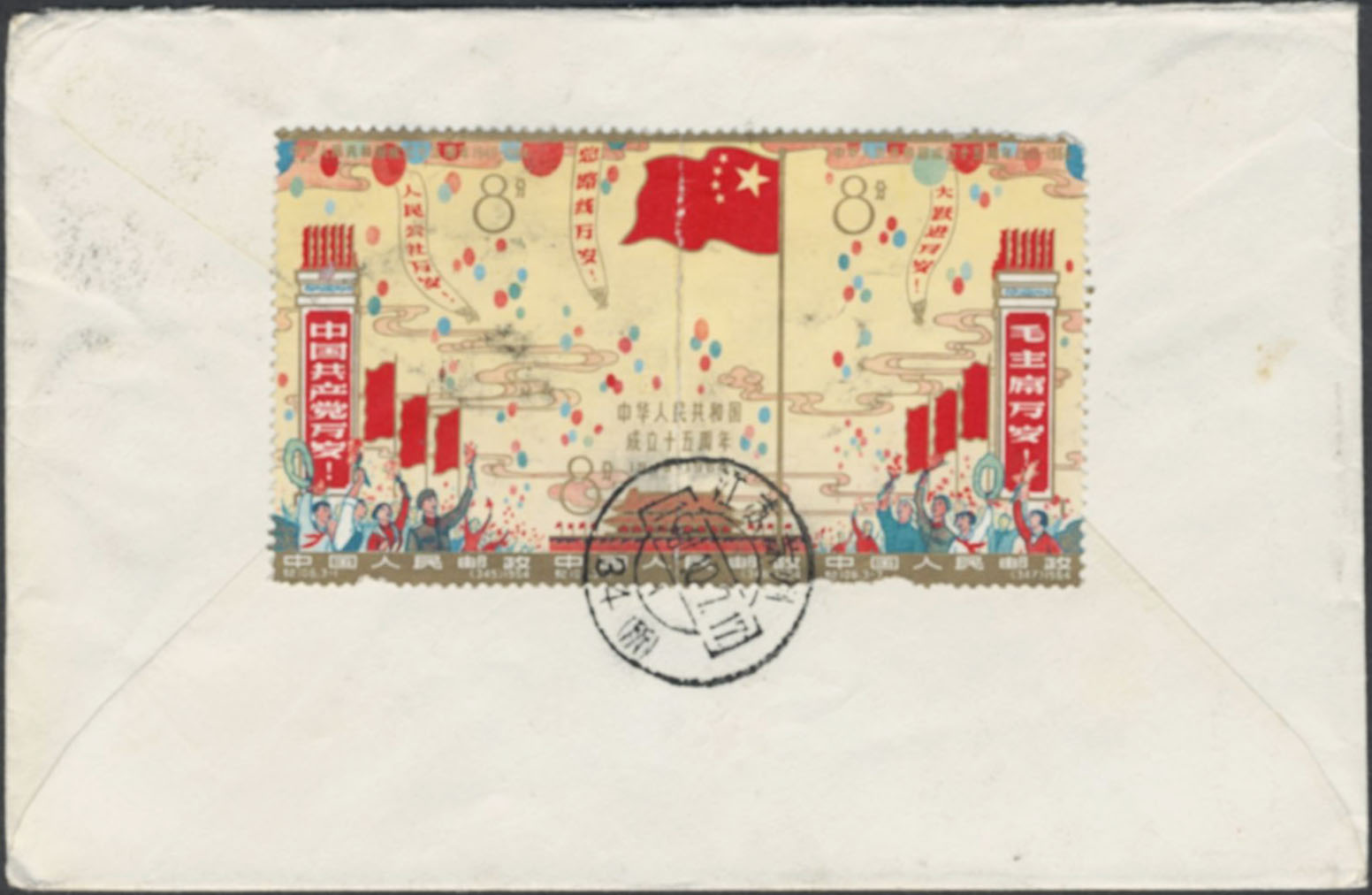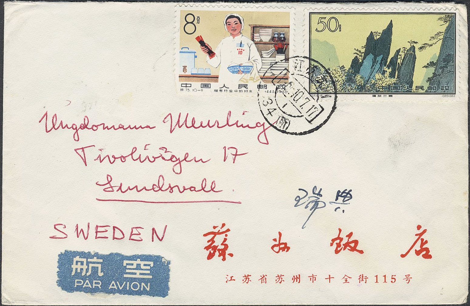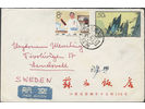 China, People’s Republic. Michel 824C–6C on cover, PRC 15 years stamp from Sheet, Landscape of Hwang-Shun 50 f, Women in Public Service 8 f (443) on scarce cover to Sweden 1966. The 15 Years stamps with several (small) faults but very scarce on cover. Woman in public service stamp is faulty lower left and 50f landscape have ingsignificant creas upper right.