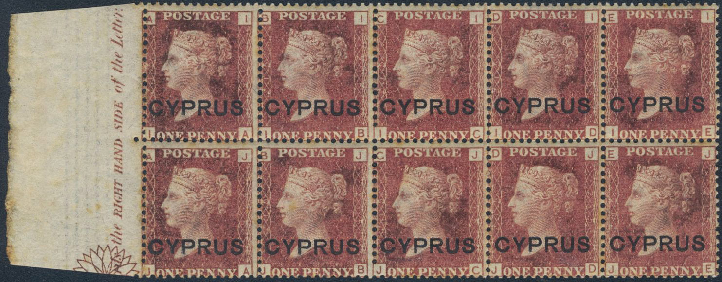 Cyprus. Michel 2 ★★, 1880 Overprint on Queen Victoria 1 d brown-rose. Red superb MNH block of 10 imprint plate 215 SG #2, cat as hinged singles £250, almost irrelevant in this superb condition.