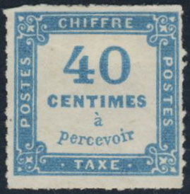 France. Postage due Michel 6a ★, 1871 40 c blue. Signed Brun with roulette perforation. EUR 350