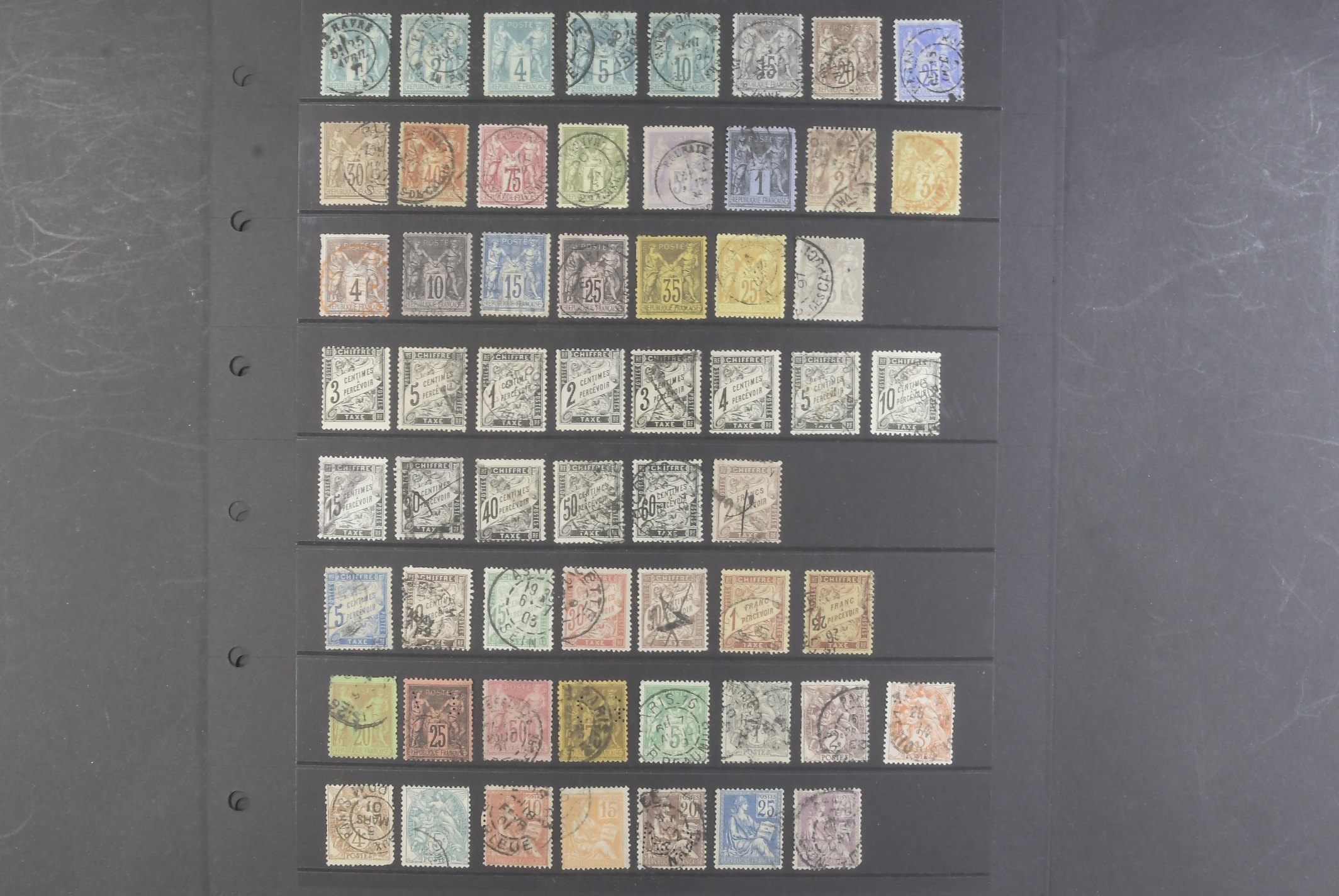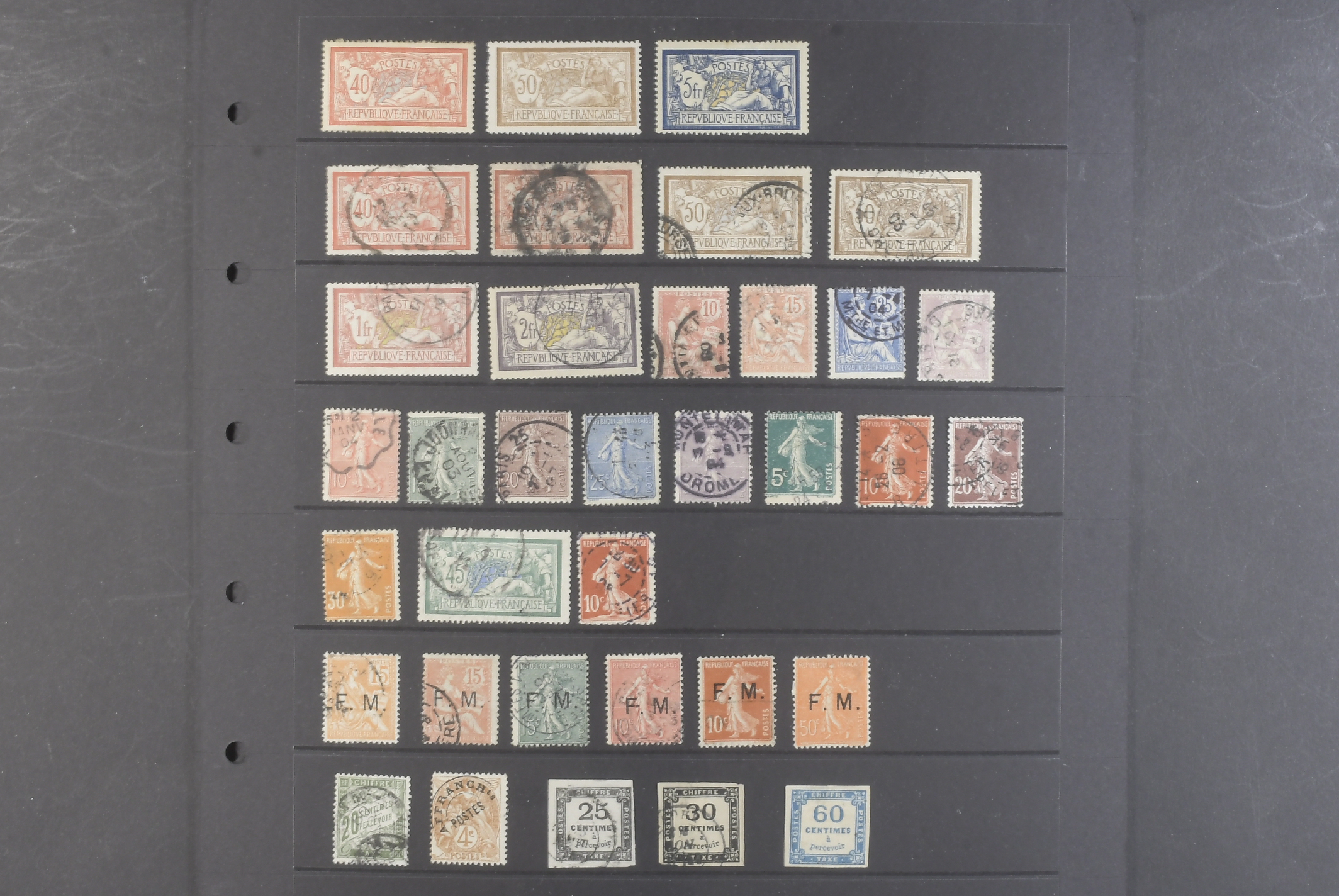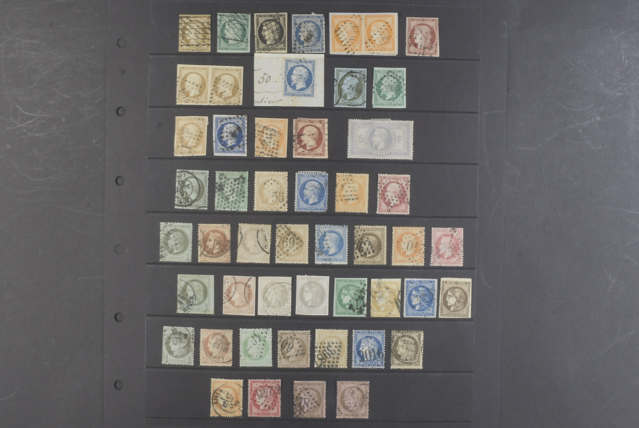 France. Lot ★/⊙ 1849–1910 on three visir leaves. Good selection of stamps with Ceres and Napoleon III 1fr, both with small faults. 5fr 1869 and Bordeaux up to 30c. Better Postage due stamps etc. The entire lot is presented at www.philea.se. Somewhat mixed quality. (c150)