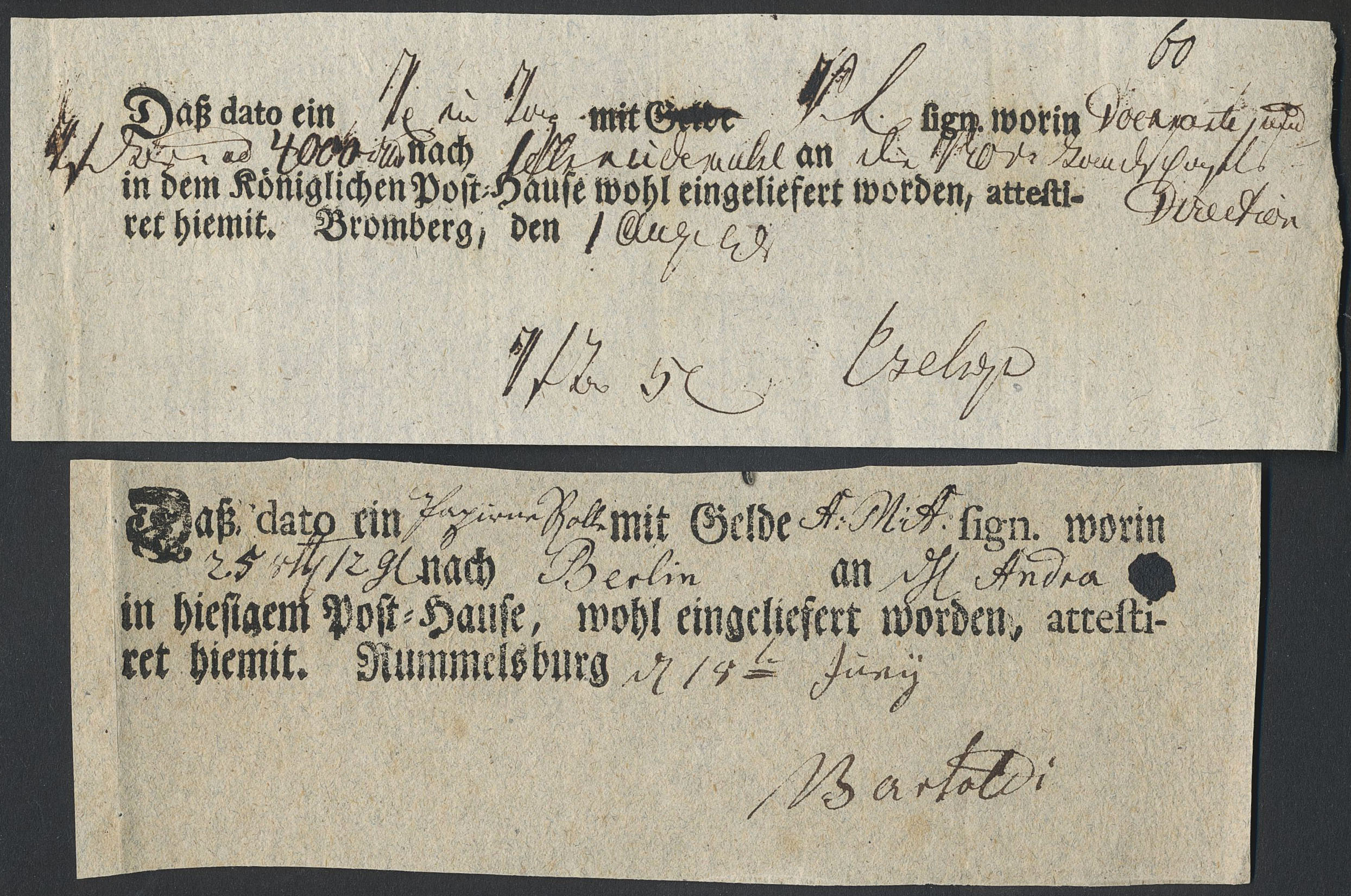 Germany, Prussia. Postal form. Two receipts for Registred postal items 1769, 1780 from Hummelsburg and Bromberg, both in Western Prussia.