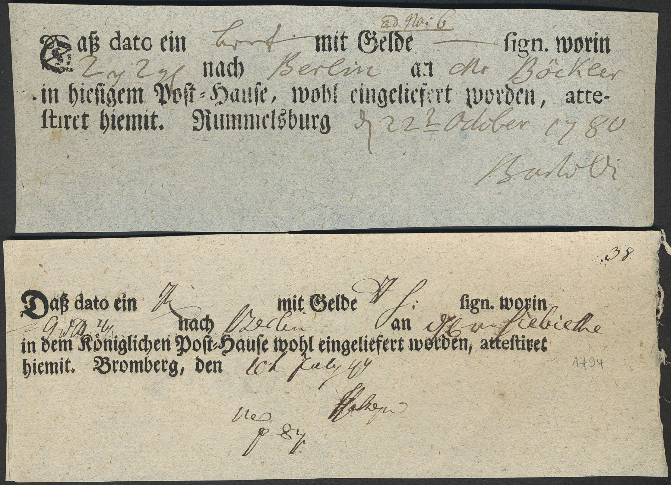 Germany, Prussia. Postal form. Two receipts for registred postal items from 1780 and 1794 from Hummelsburg and Bromberg, Western Prussia.