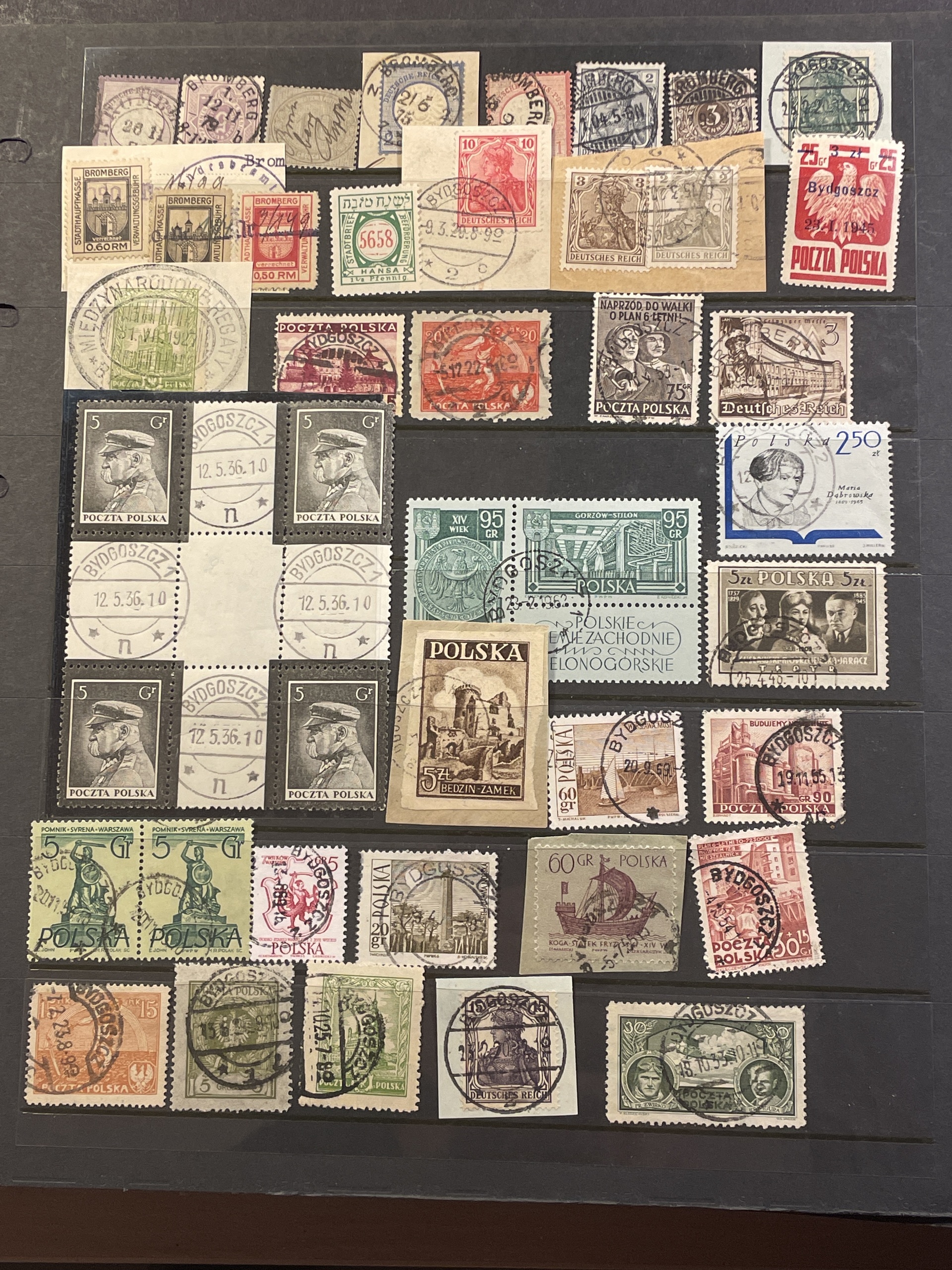 Germany, Prussia. Lot used 1872–1955 on visir leaves. City cancellations BROMBERG or BYDGOSZCZ (Western Prussia, which was a part of Germany from 1708 to 1919 and from 1939 to 1945. In between and afterwards Western Prussia belonged to Poland. Also incl. some local fiscal stamps, hand written cancellation and some more. Se images on the website. Somewhat mixed quality. (58)