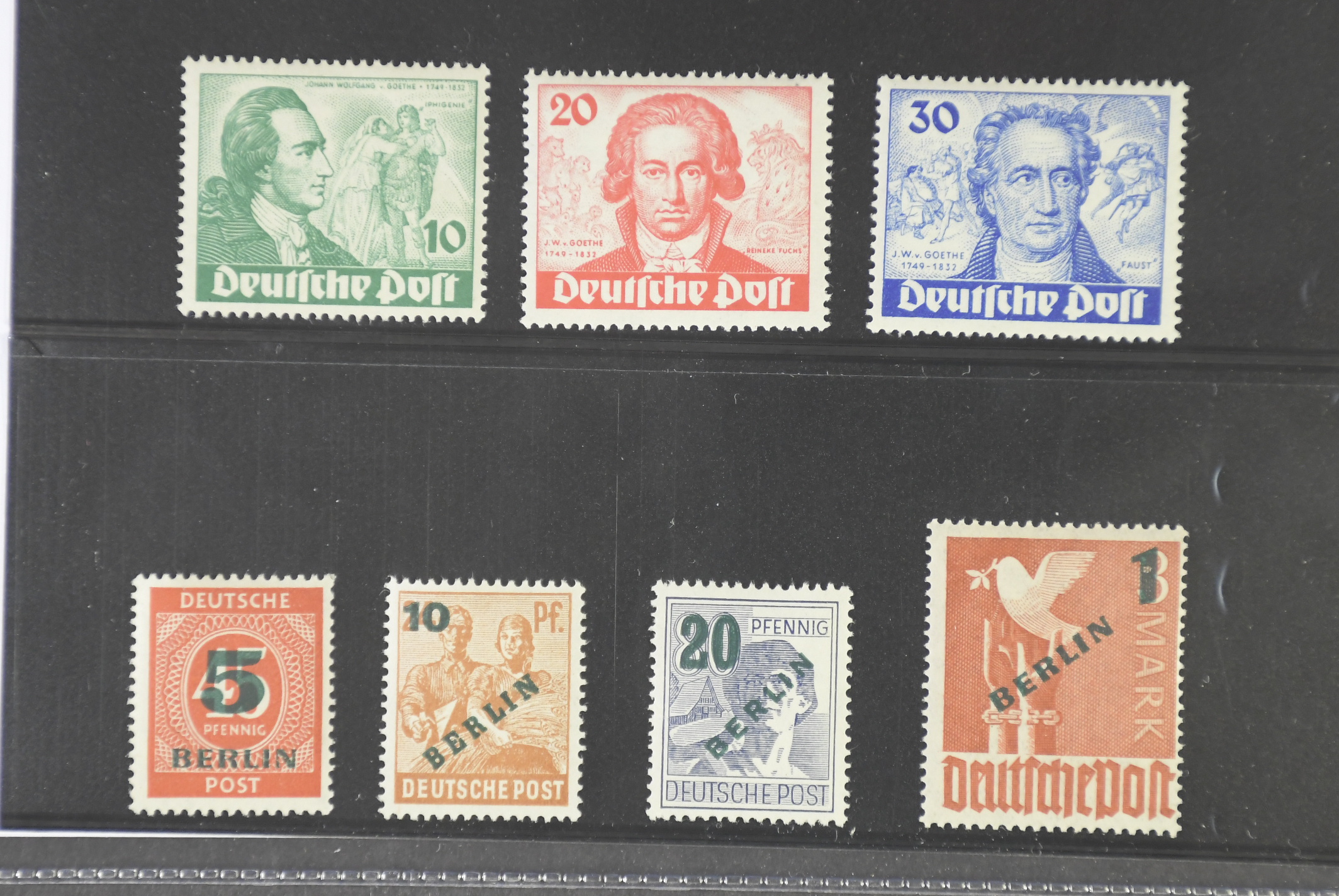 Germany, Berlin. Lot ★★ 1949. Goethe set Mi 61–63 and Green Berlin overprint set Mi 64–67. cat. val. €580
