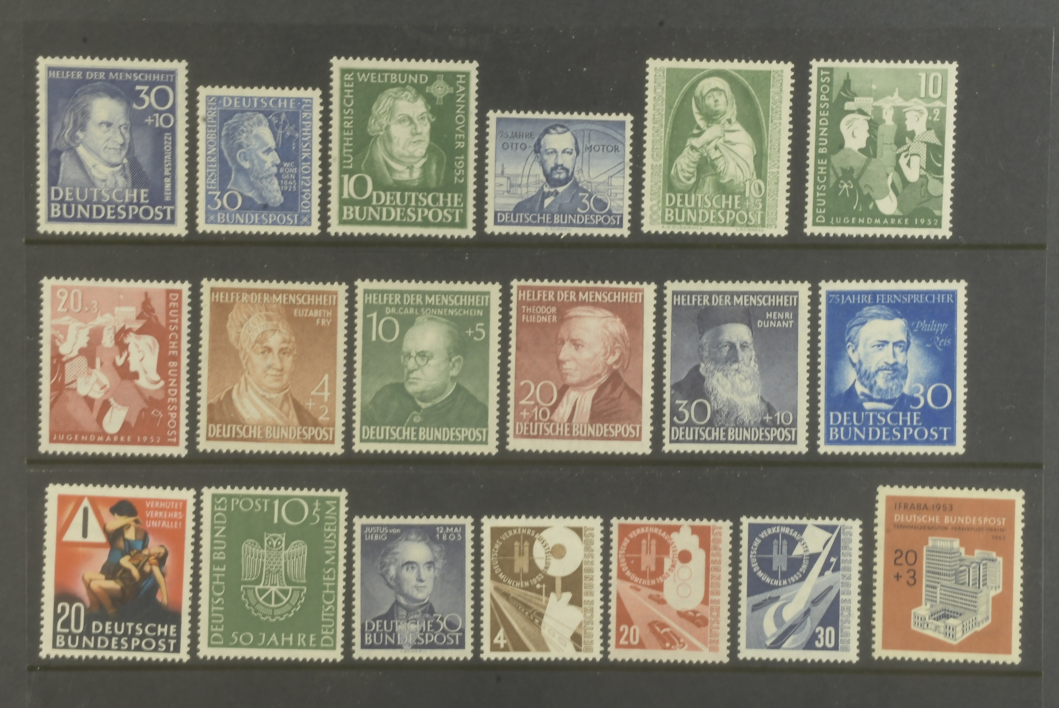 Germany, GFR (BRD). ★★. Very fine selection 1949–54 incl. Mi111–20, 139–40, 143–51 and 189, etc. Mi-2021 approx. 1760 Euro. The entire lot is presented at www.philea.se. (49)