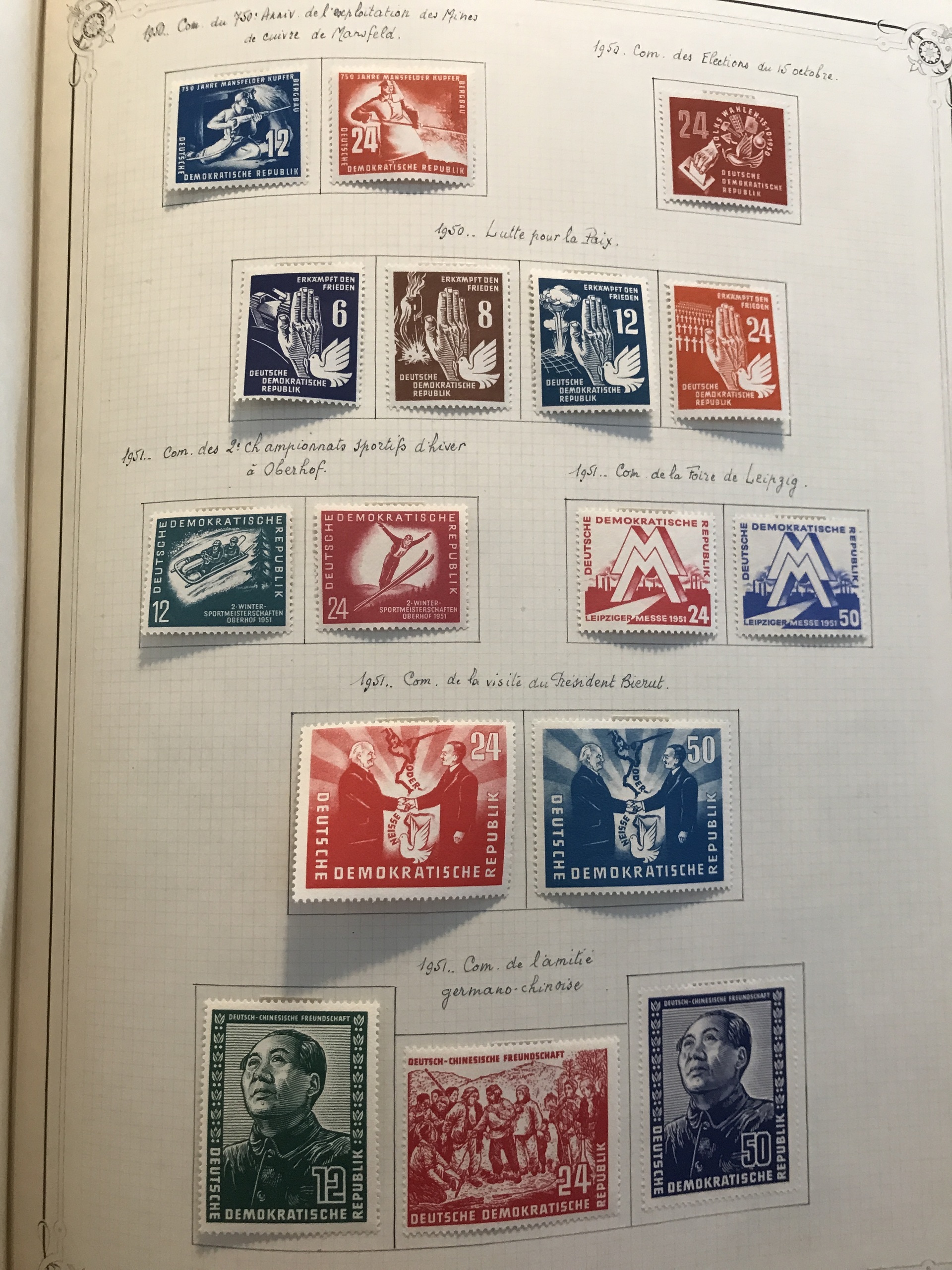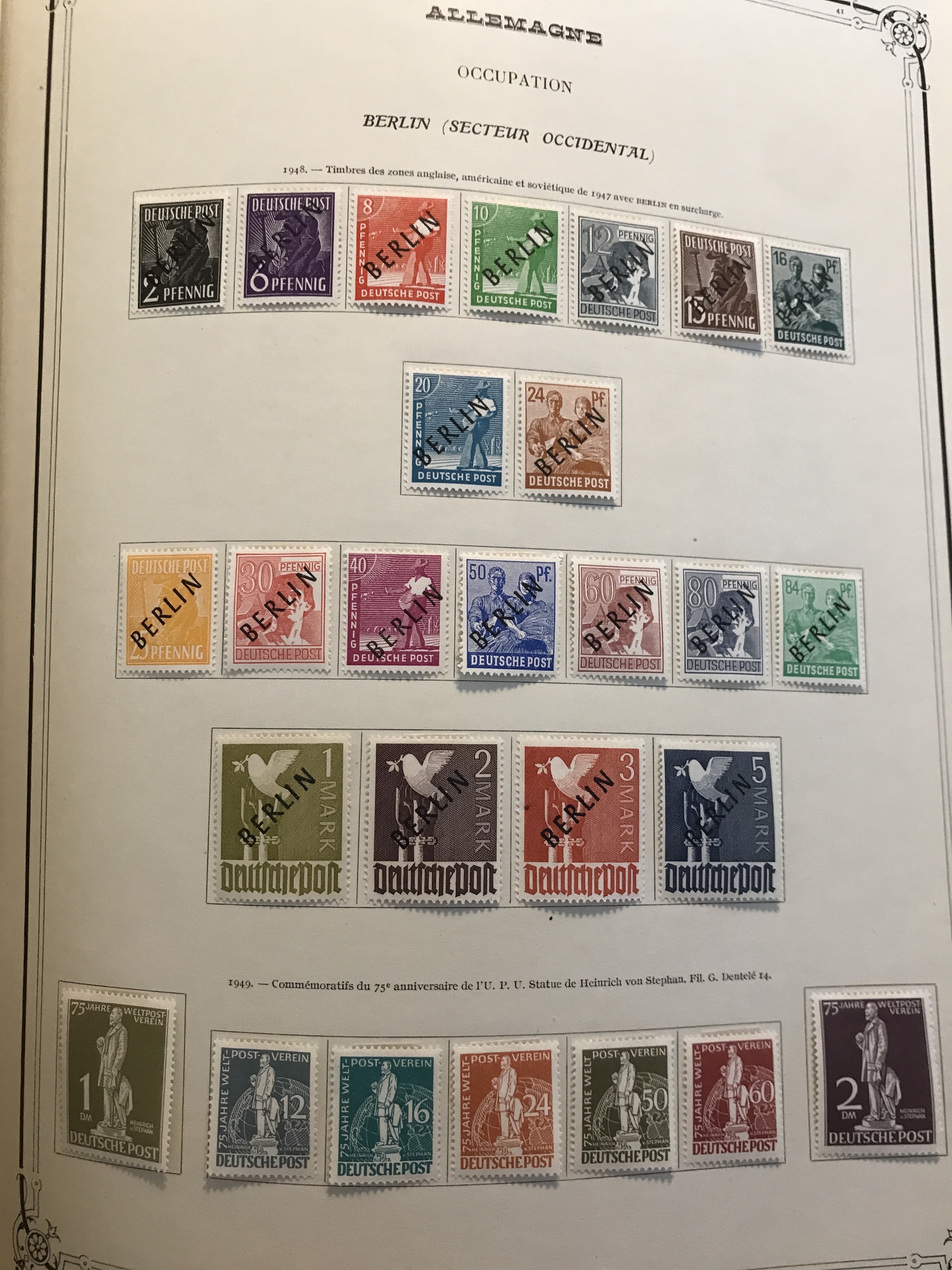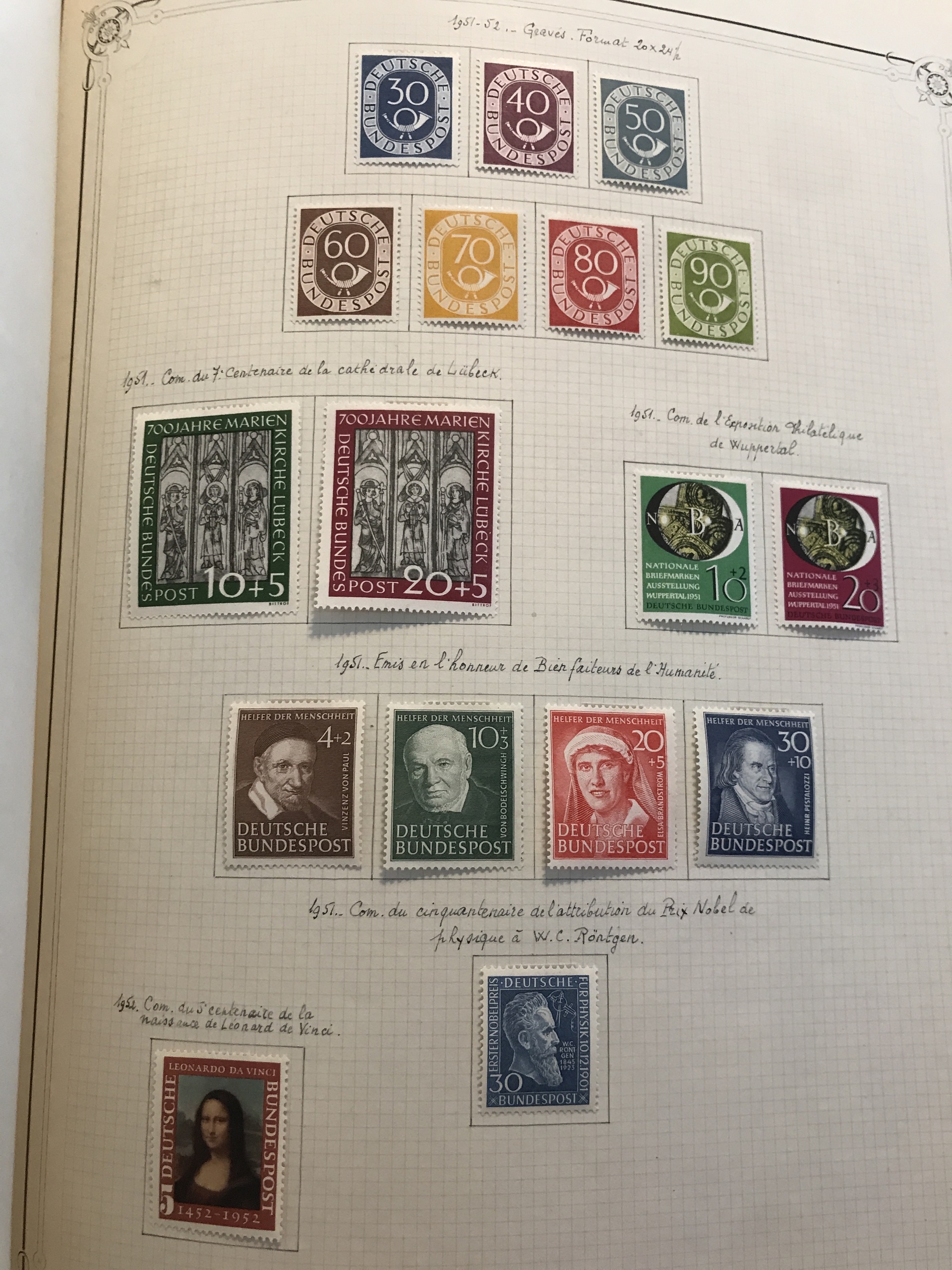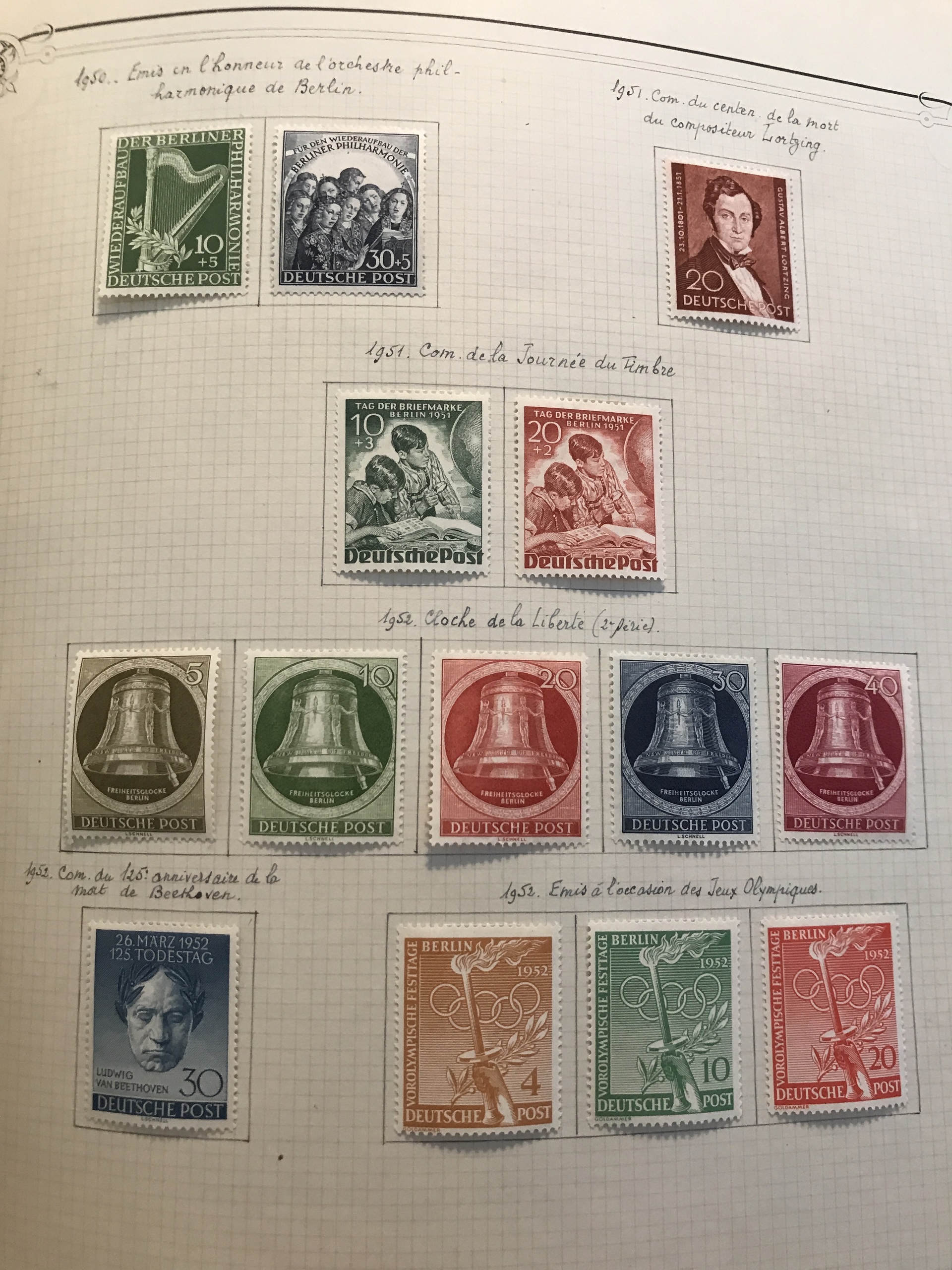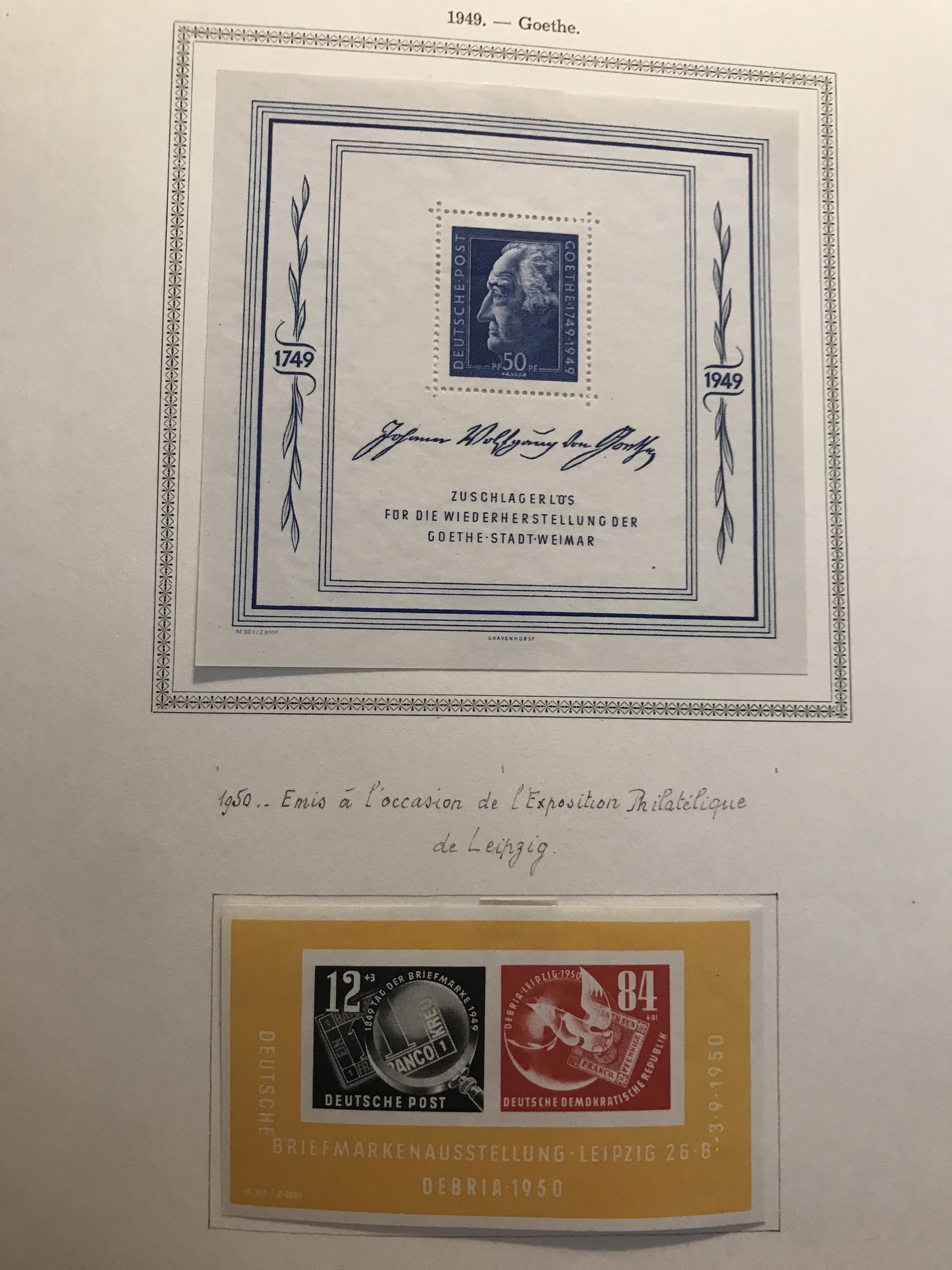 Germany, mixed. ★★/★/⊙. Collection 1872–1952 in Yvert album incl. e.g. Berlin Mi1–90 cpl. * and s/s1, BRD Mi111–47, Reich incl. e.g. Mi695–97 used and six souvenir sheets, Allied occupation, DDR and Soviet zone incl. souvenir sheet Goethe, etc. Please see a selection of scans at www.philea.se. Approx. 10 kg. (1600)