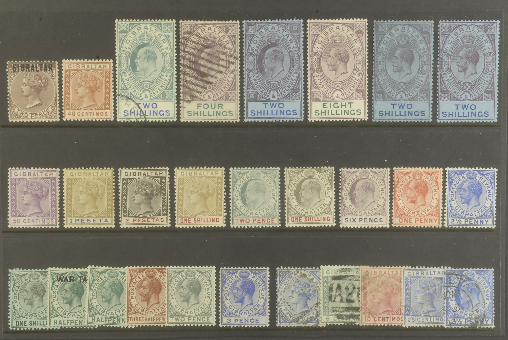 Gibraltar. Mostly ★. Nice lot 28 different 1868–1927 incl. Mi53–54 used, Mi3, 62 and 73 *, etc. Mi ca 1040 Euro. The entire lot is presented at www.philea.se.