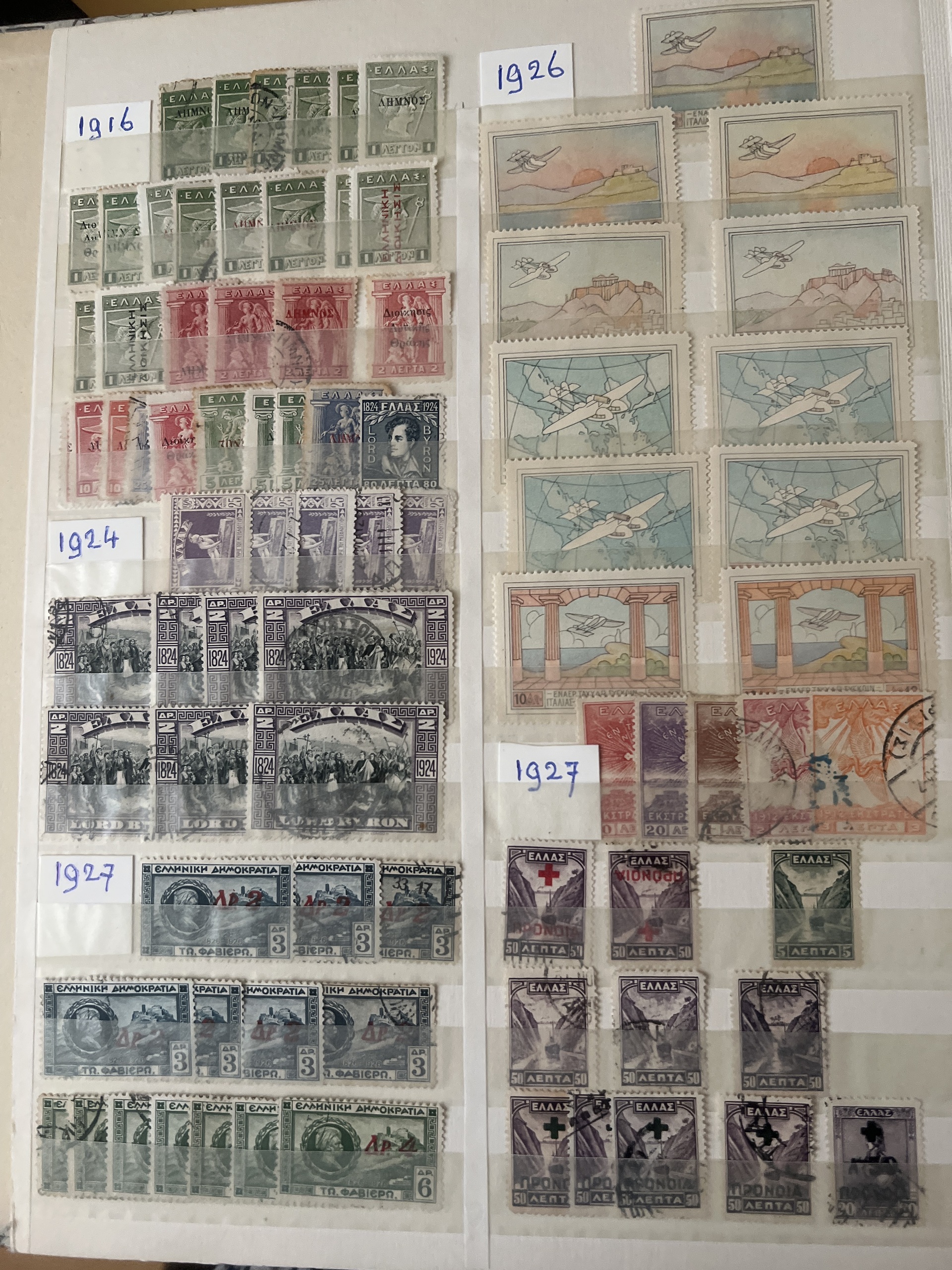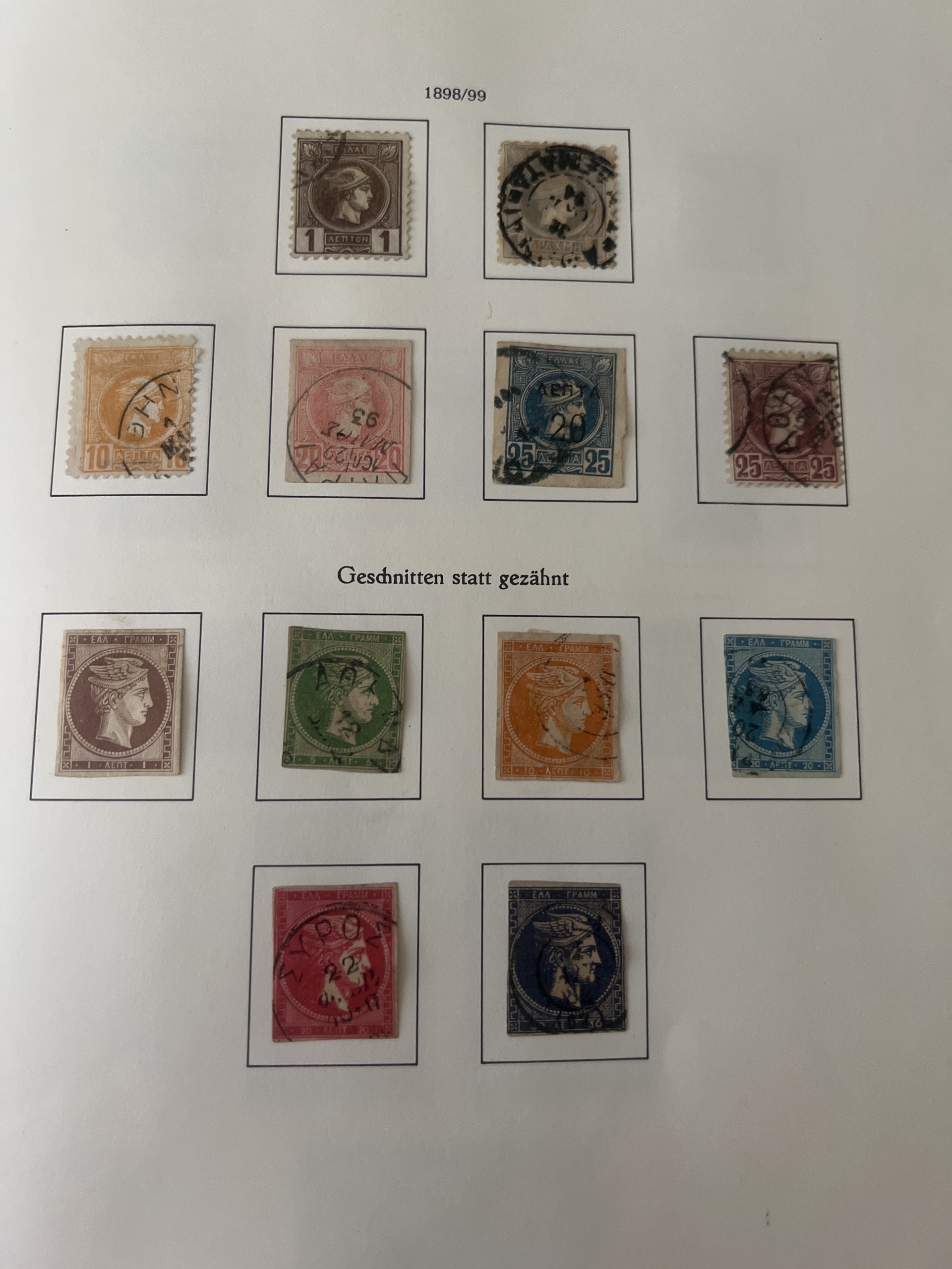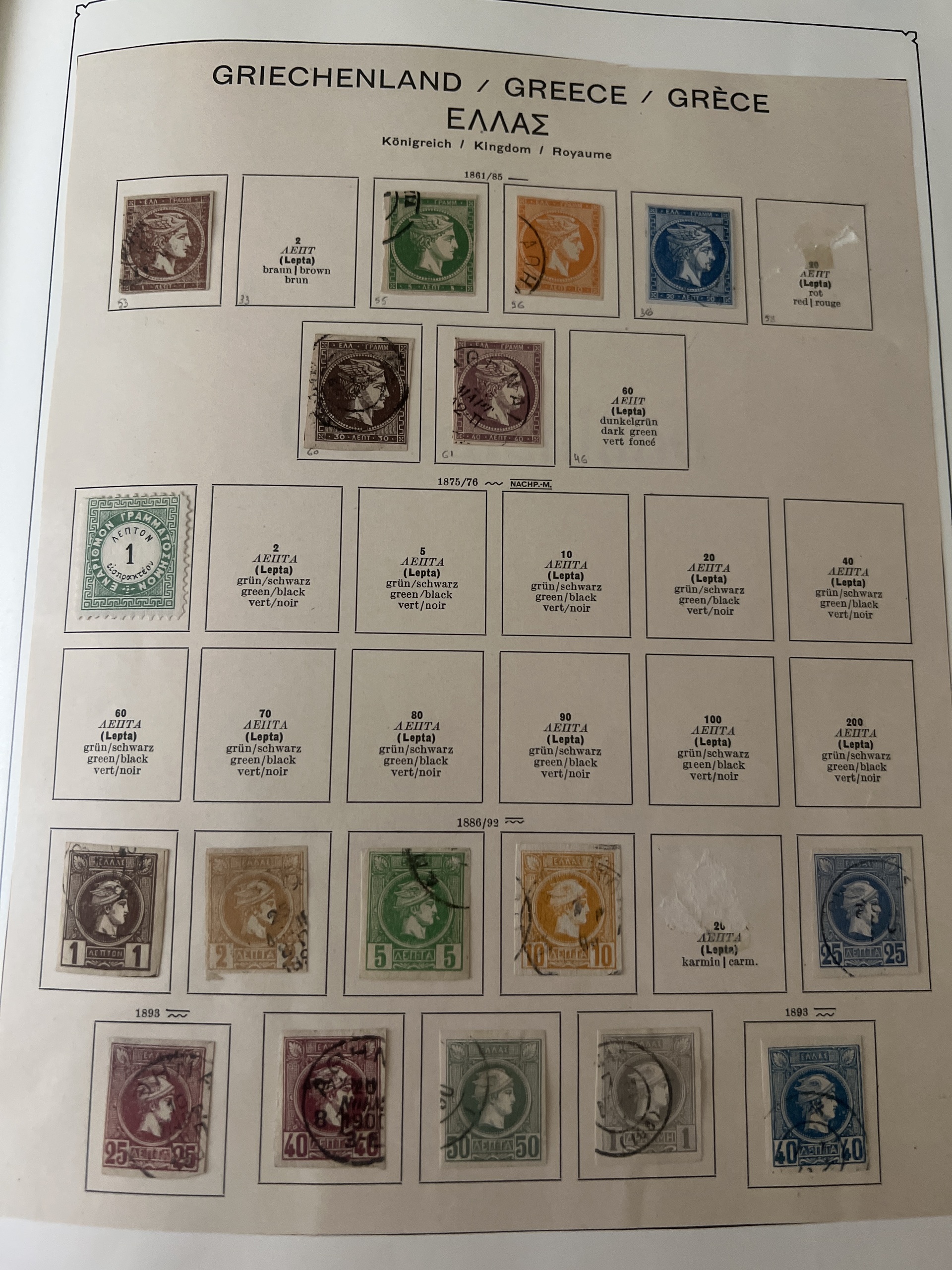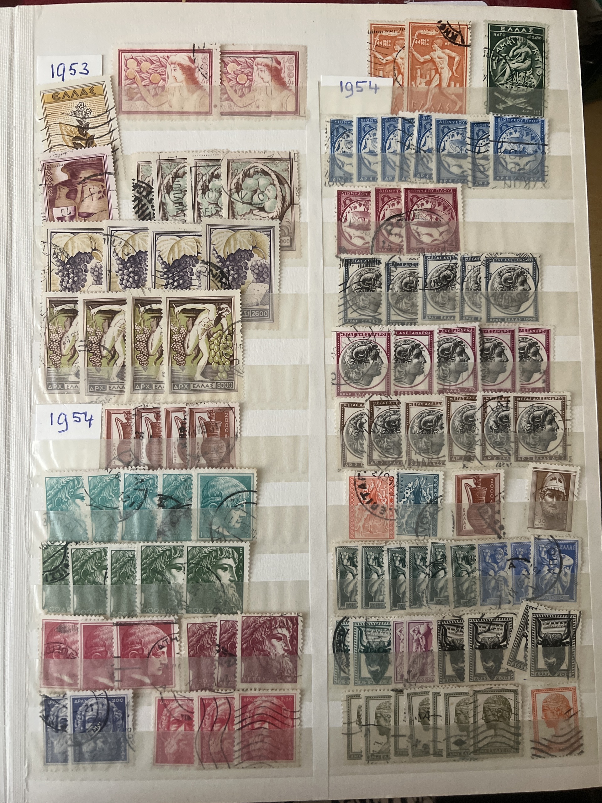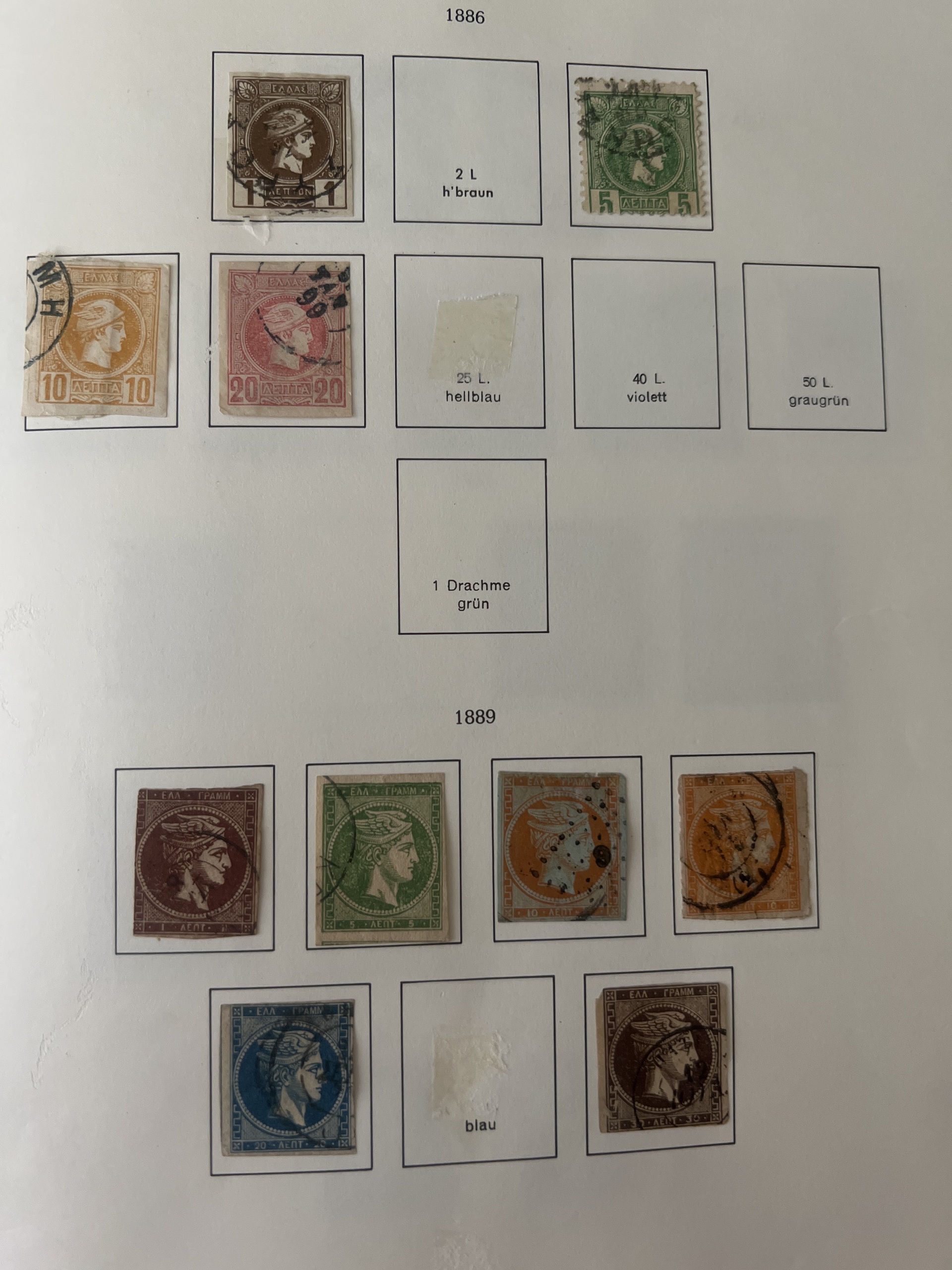 Greece. Collection/accumulation mostly used 1861–2004 in two albums. Collection in Ka-Be album 1861–1977 with some better stamps e.g. Mi 106* (round corner) and Mi 107 used. Second album is a stockbook filled to the brim with duplicates. Please see a selection of scans at www.philea.se. Mostly good quality. (1000s)