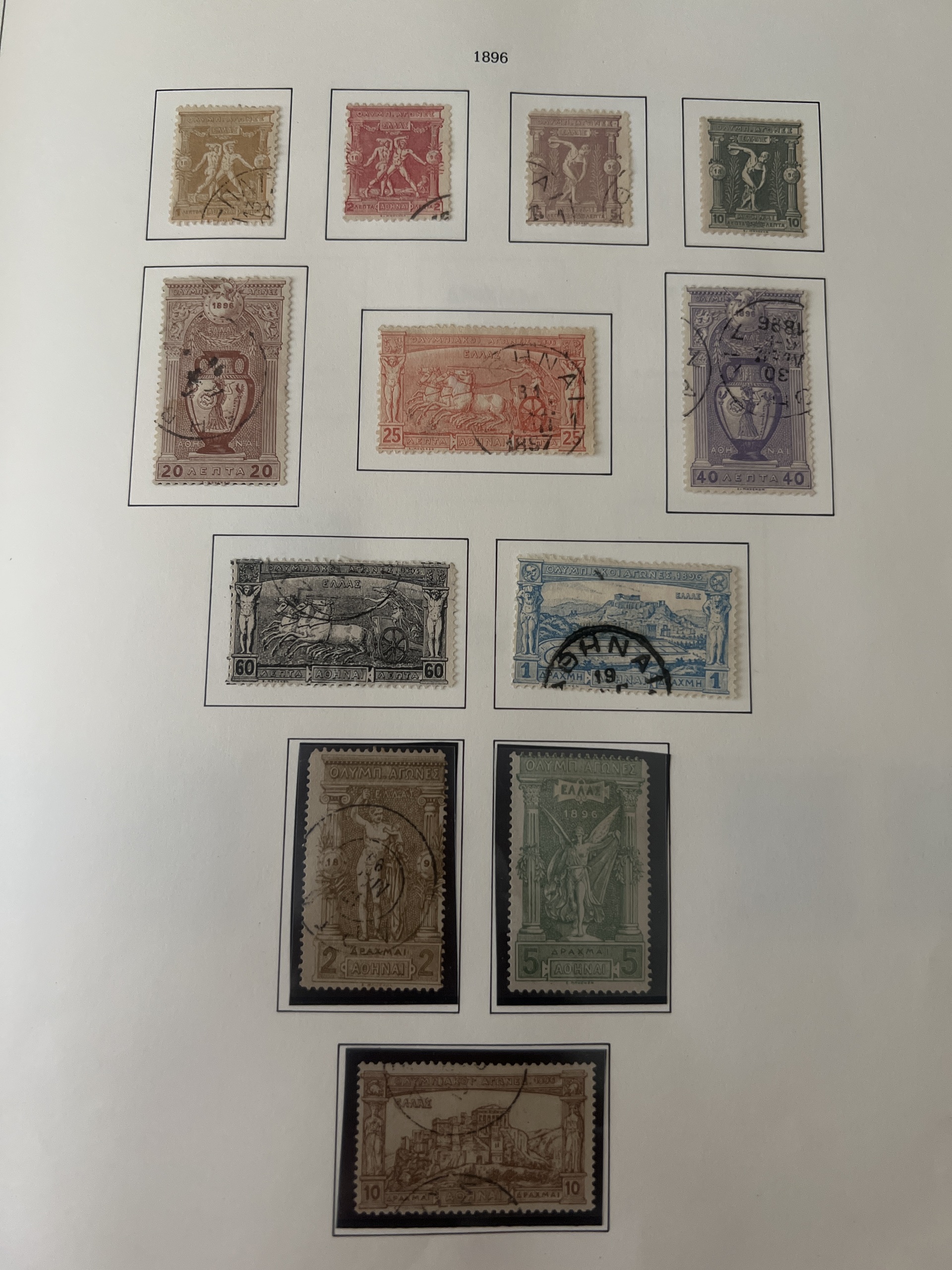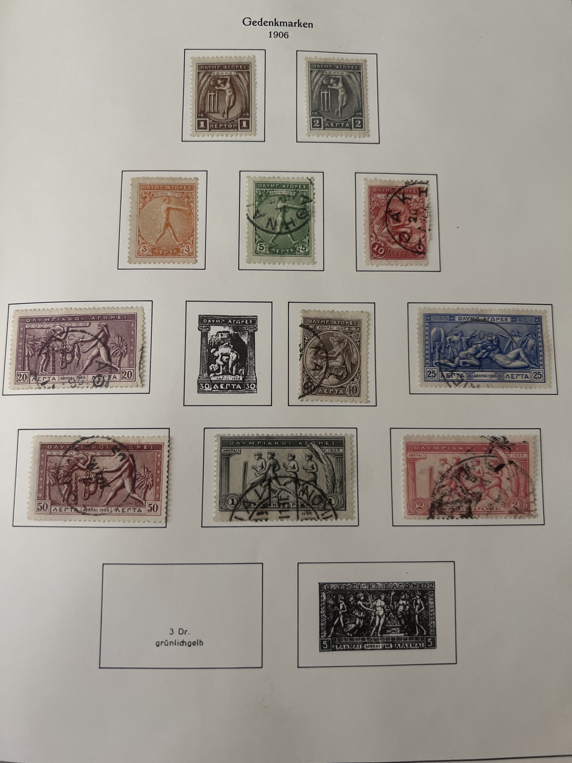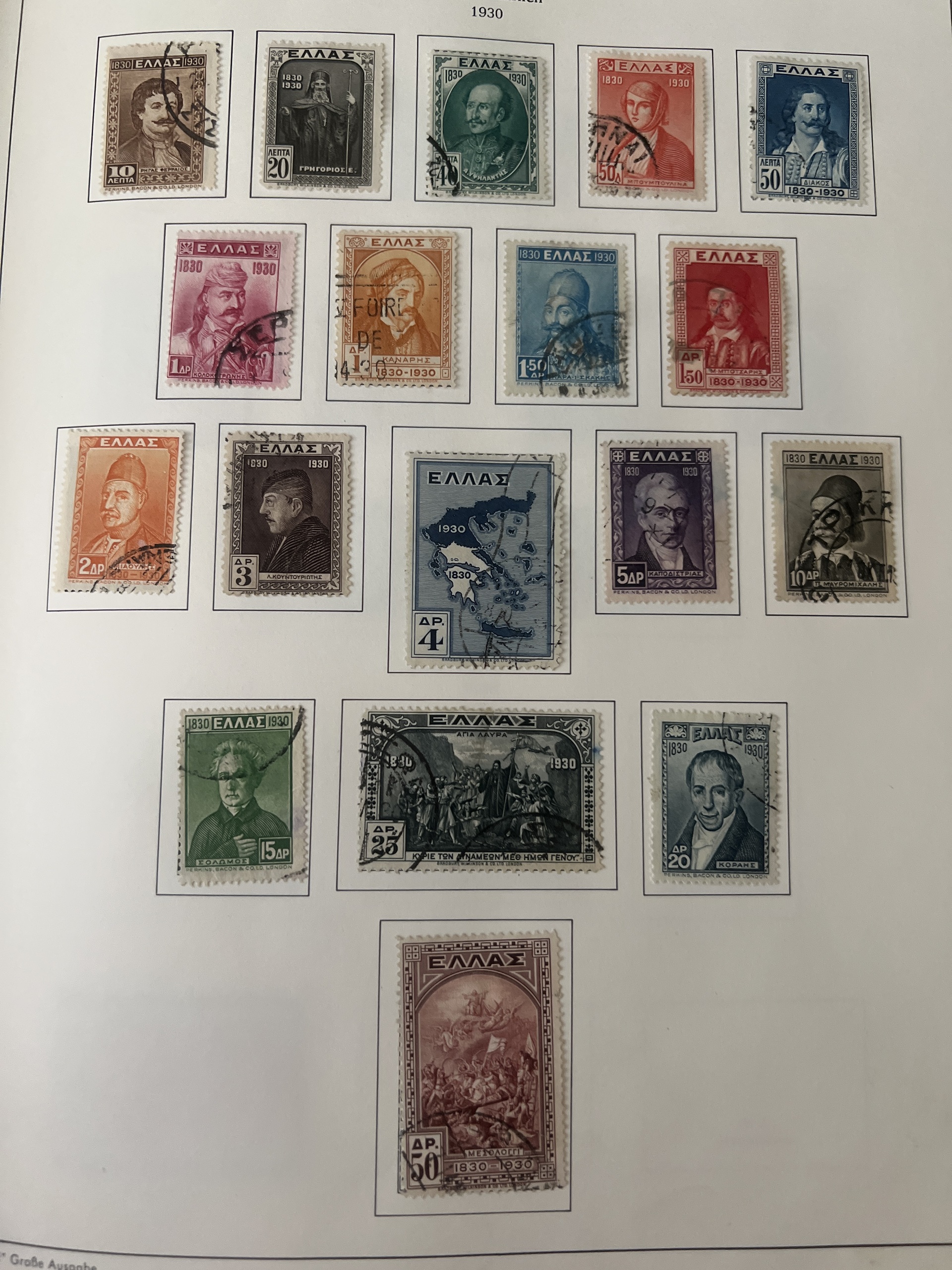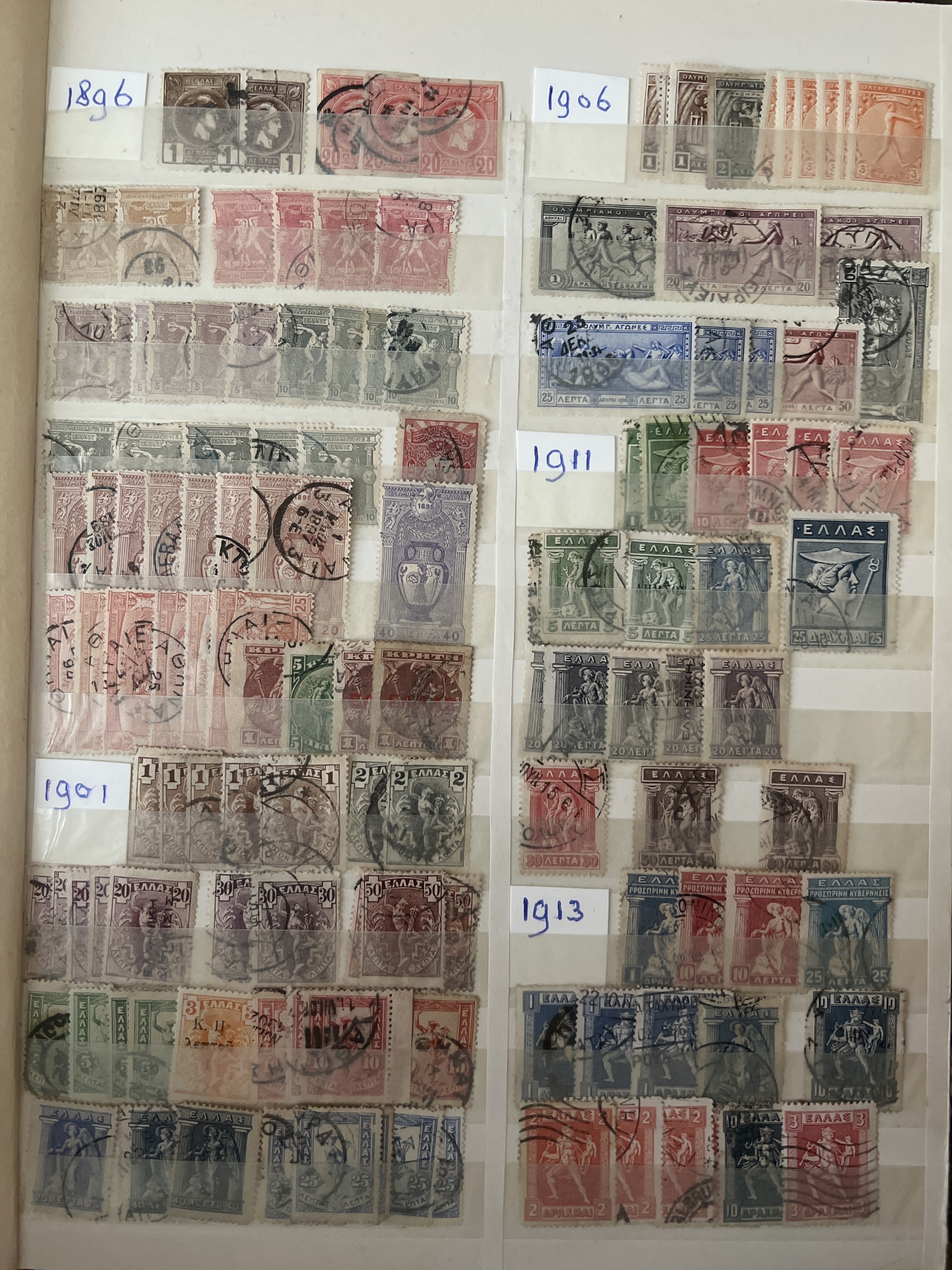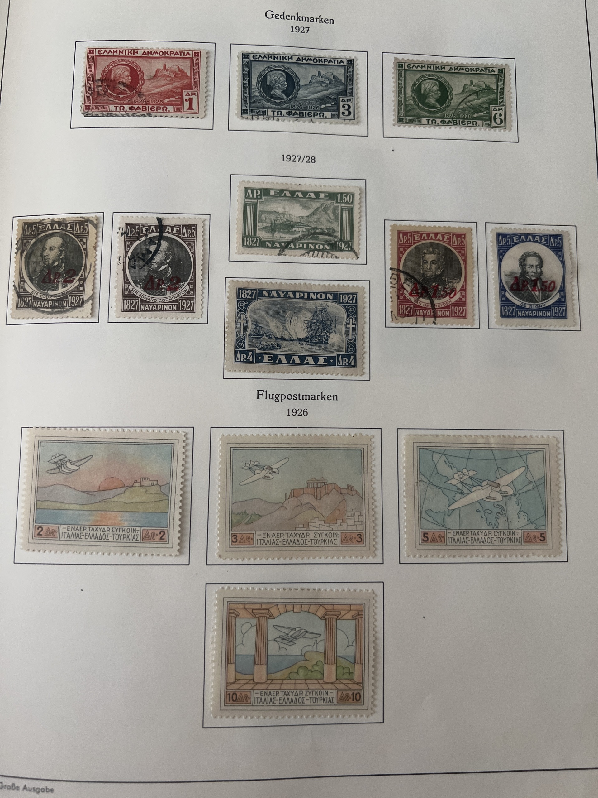 Greece. Collection/accumulation mostly used 1861–2004 in two albums. Collection in Ka-Be album 1861–1977 with some better stamps e.g. Mi 106* (round corner) and Mi 107 used. Second album is a stockbook filled to the brim with duplicates. Please see a selection of scans at www.philea.se. Mostly good quality. (1000s)