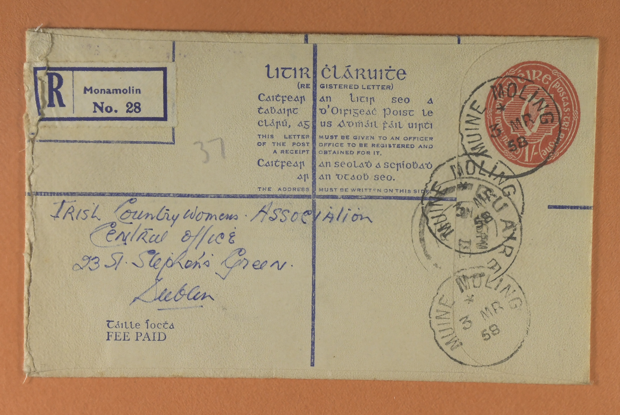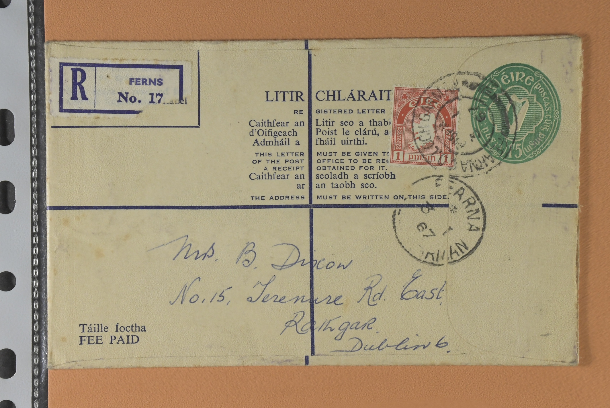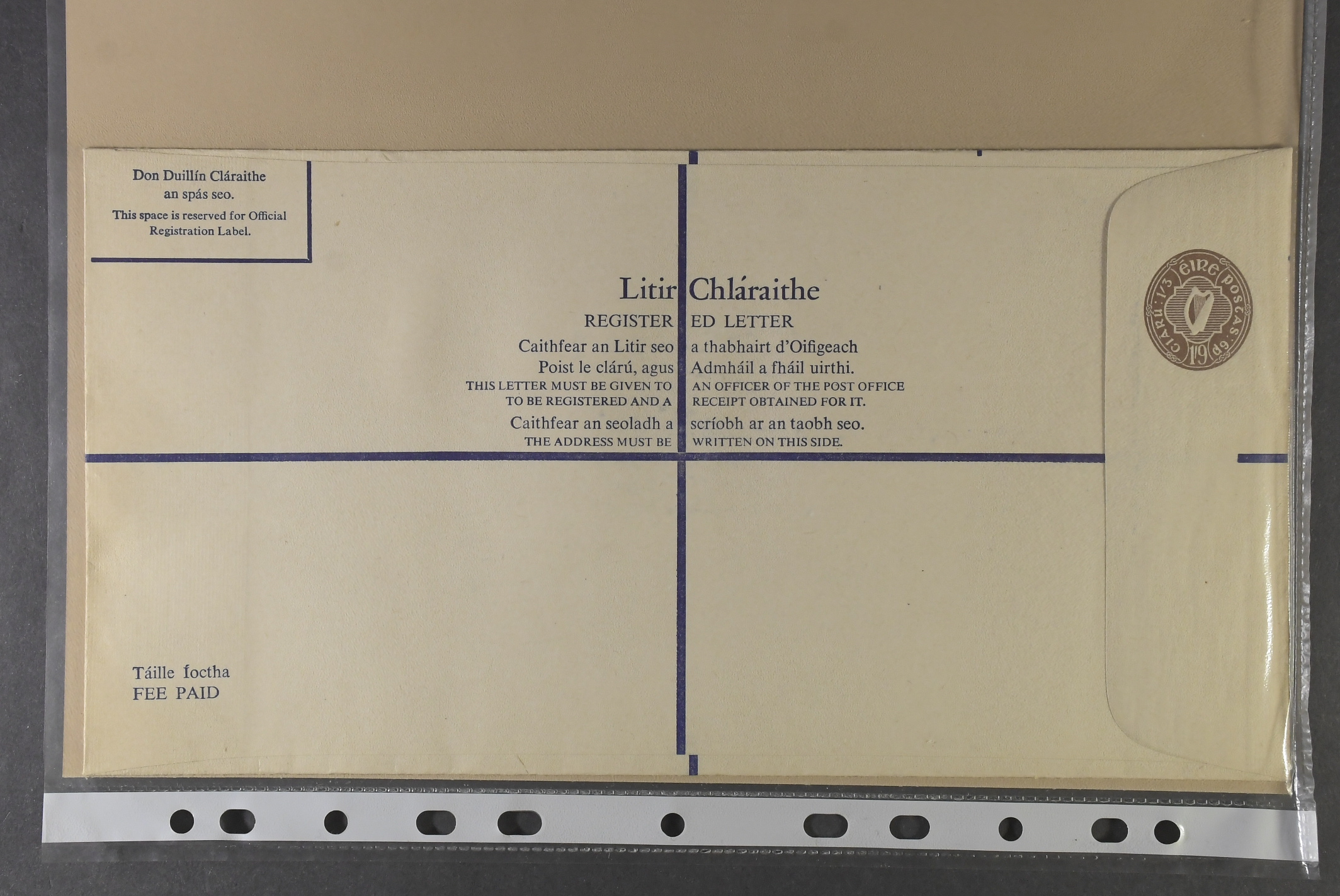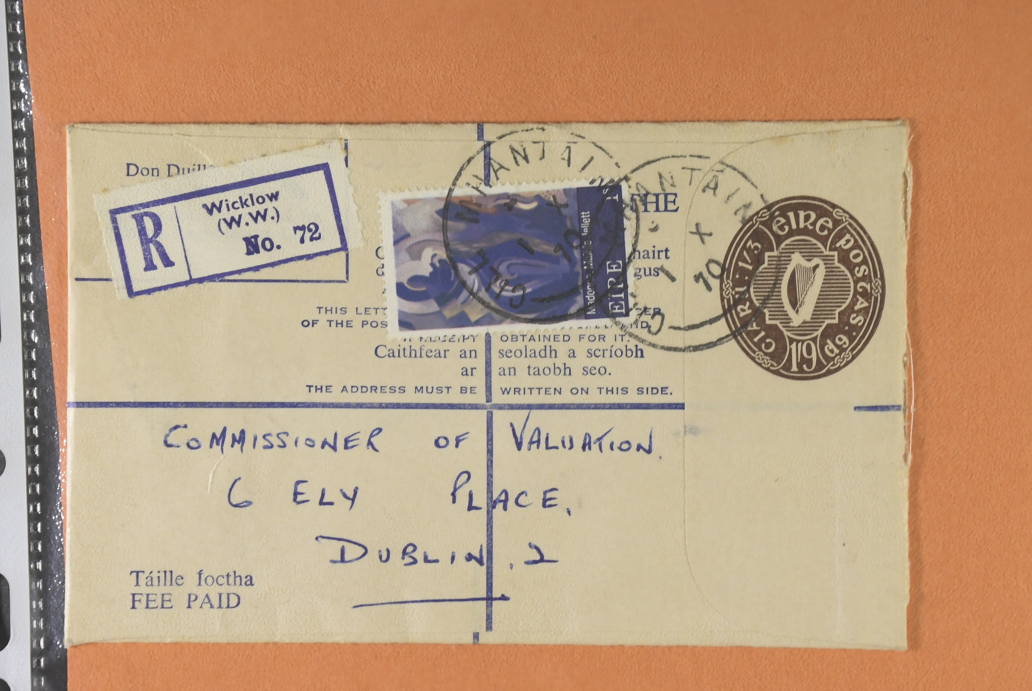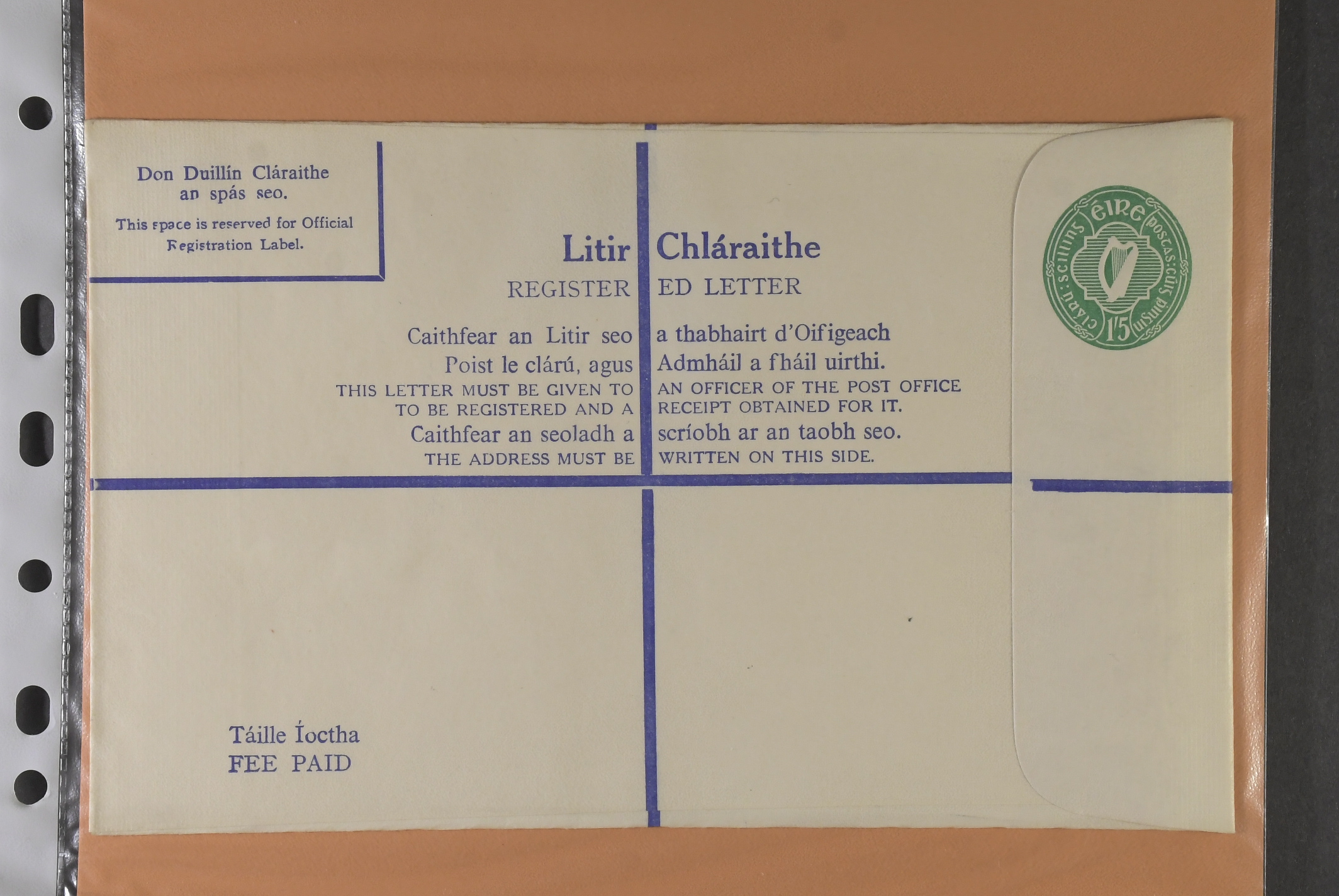 Ireland. Postal stationery. A comprehensive collection, more often than not used of elusive postal stationery from early issues, including the Harp registered different values such as 9d, 1/-onwards in 2 volumes. Many of these were bought as individual items in auction. All in all there are 130 items, many of which are extremely scarce with low printing numbers.