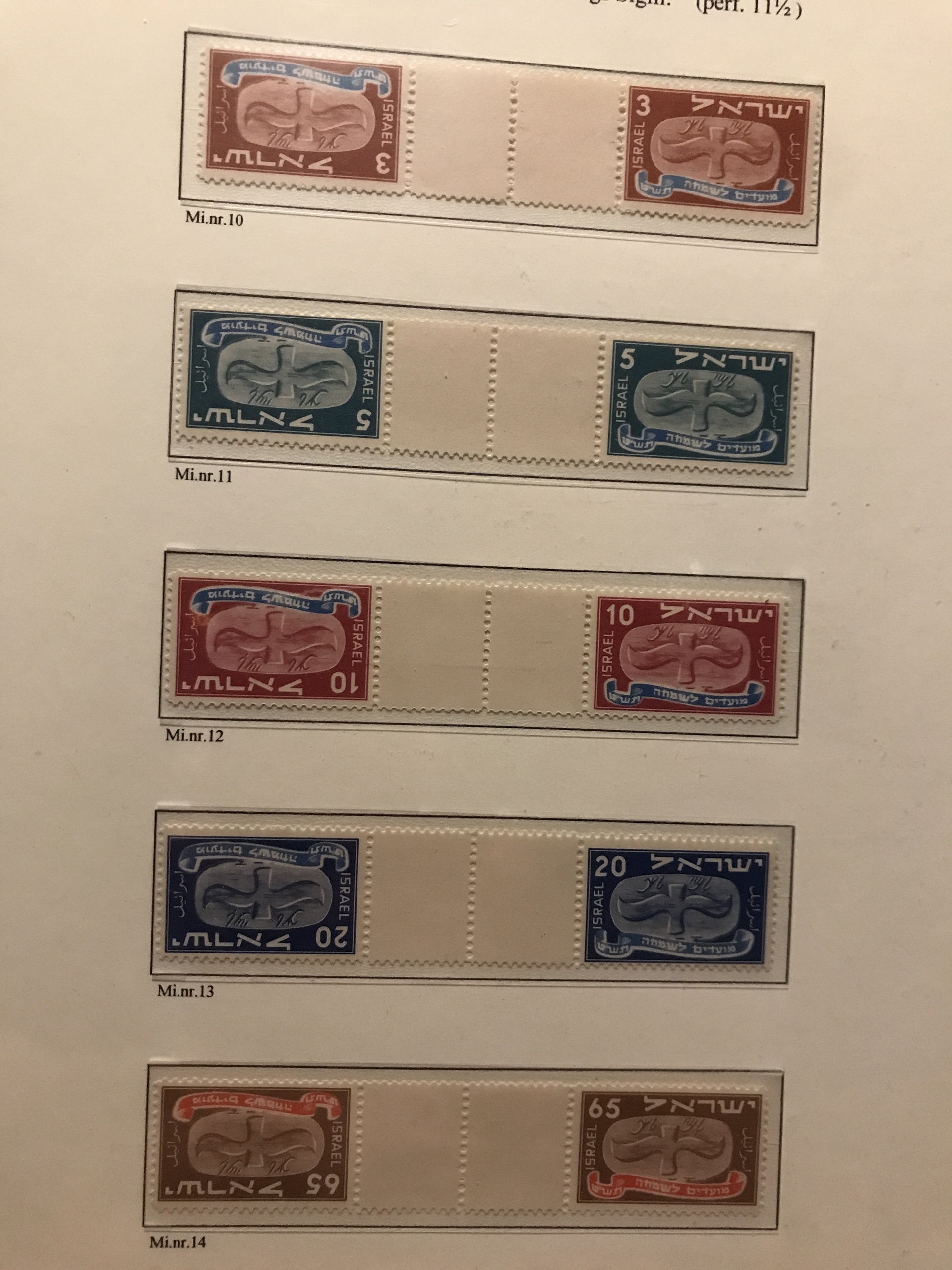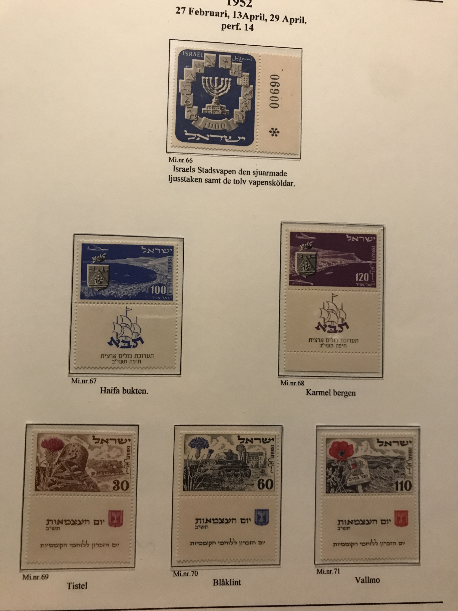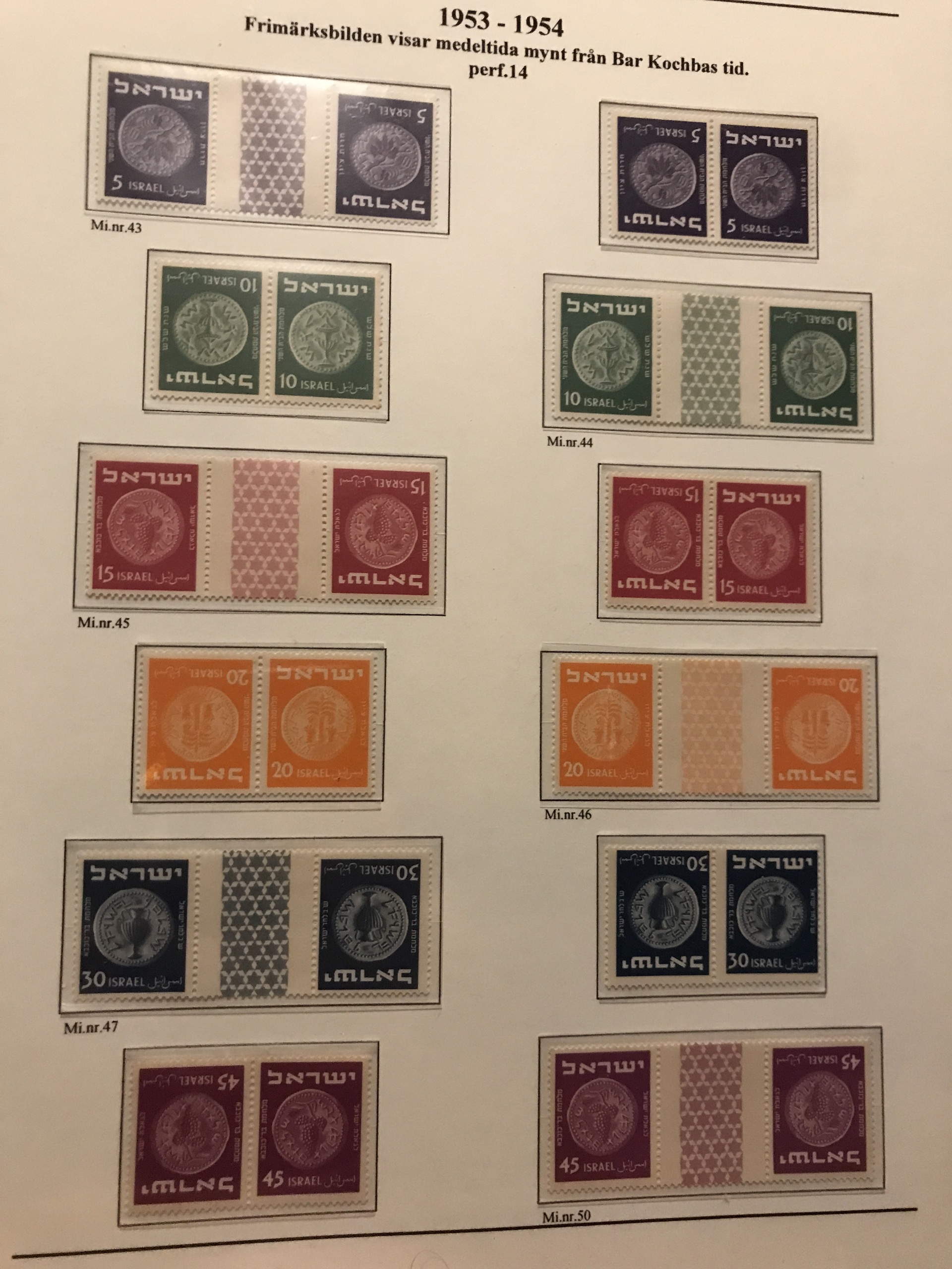 Israel. ★★. Apparently complete collection 1948–1980. Mi1–9 used, otherwise ** incl. many early issues with half tabs and some full tabs, se-tenant gutter pairs, two s/s1 incl. one used. Please see a selection of scans at www.philea.se.