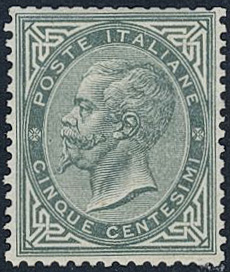 Italy. Michel 16 ★, 1863 Viktor Emanuel II 5 c grey-olive. Short perfs in top. EUR 1600