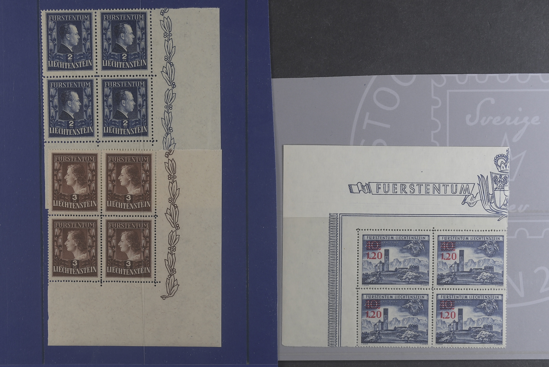 Liechtenstein. Michel 304–05, 310 ★★, Fürst Franz Josef II 2Fr P12½:12, Fürstin Gina 3Fr P14¼ and Church in Bendern Surcharge all 3 in very nice blocks of 4. EUR 880
