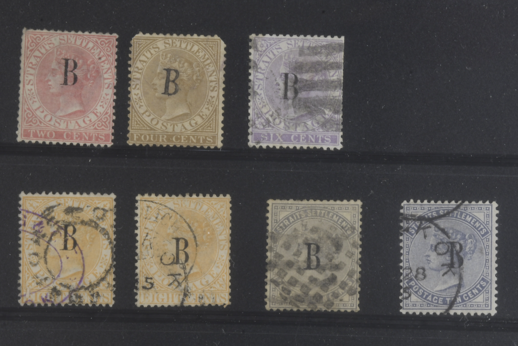 Malay states, Straits Settlements, post in Bangkok. Lot ★/⊙. Seven stamps in mixed condition. No gurantee. The entire lot is presented at www.philea.se.