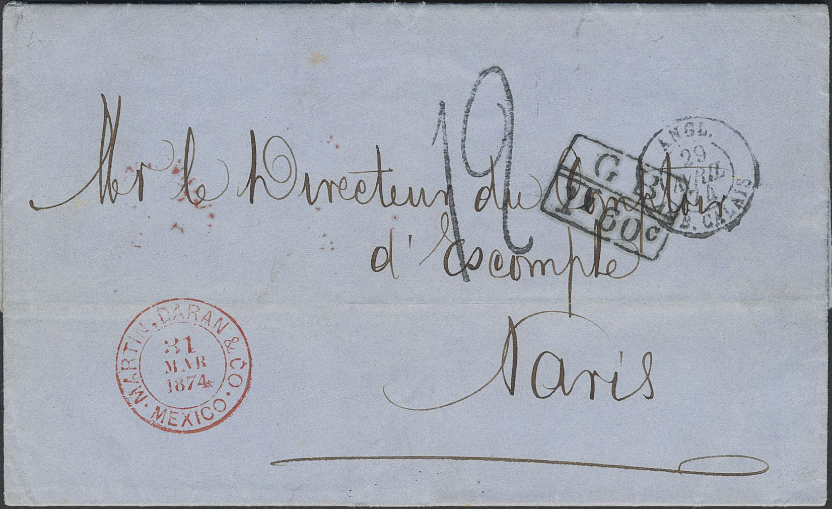 Mexico. Prephilately. Letter dated 'Mexico 31 Mars 1874' sent via LONDON 29.AP.74 to France. Accountancy mark GB 1F60c.