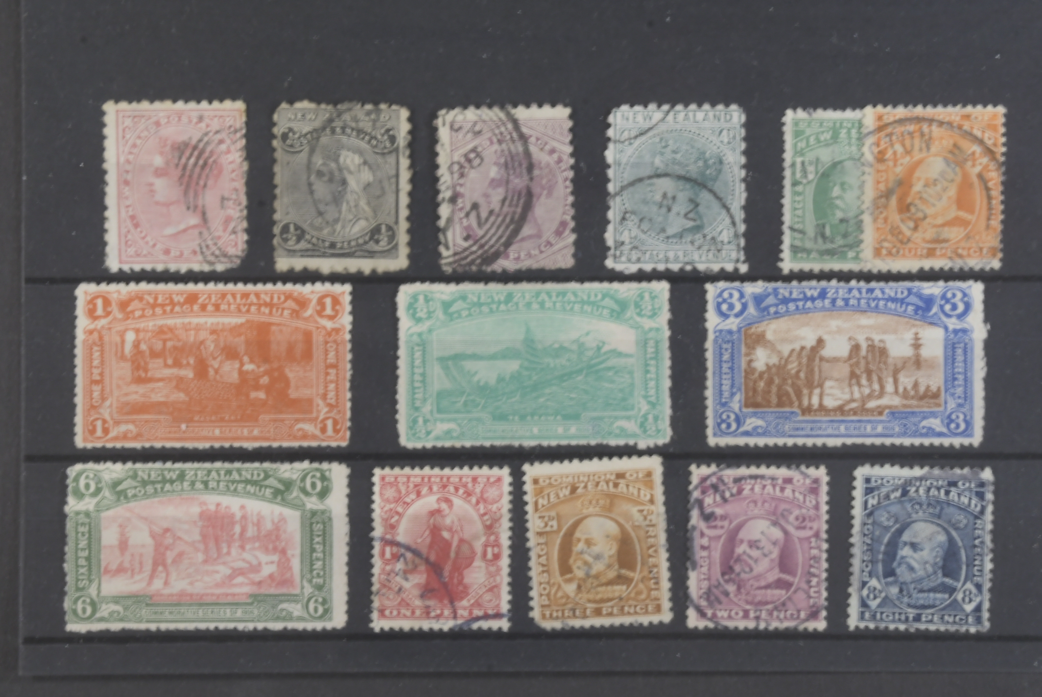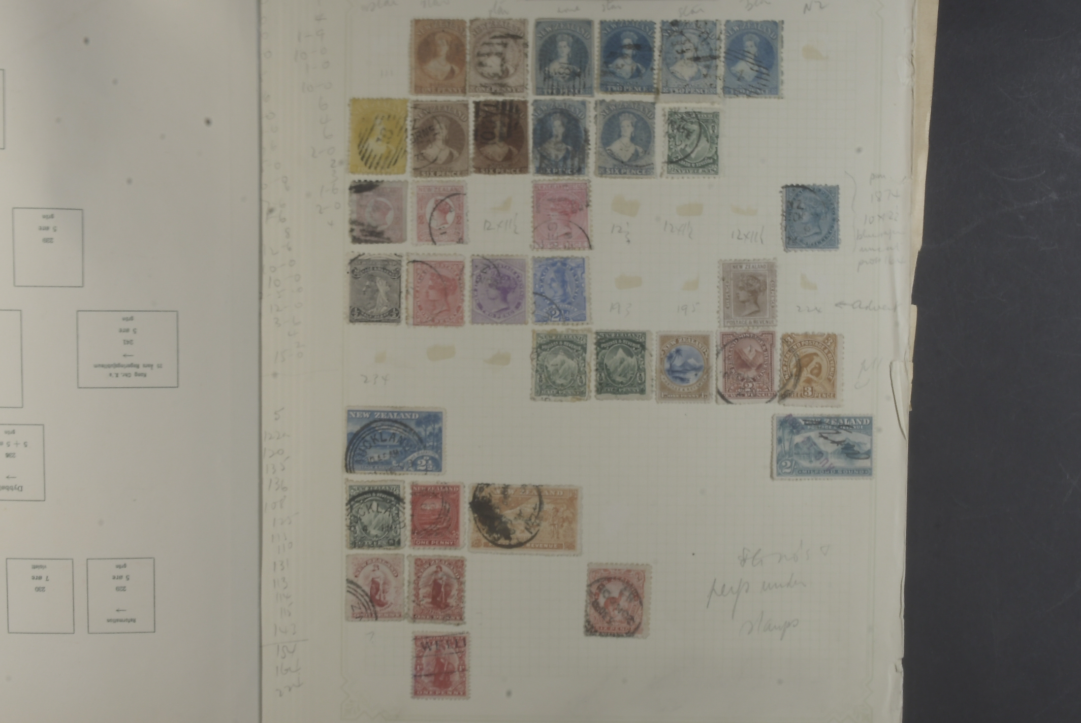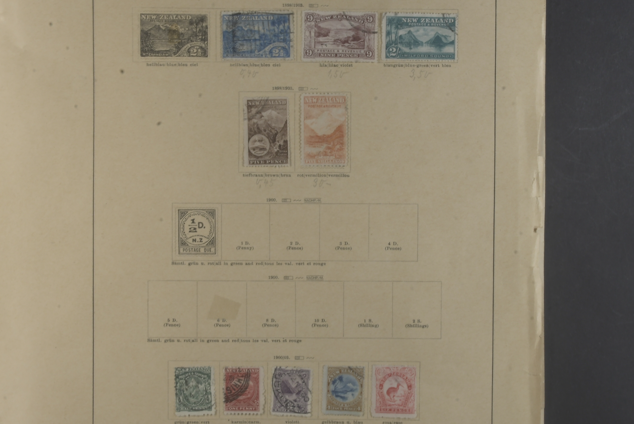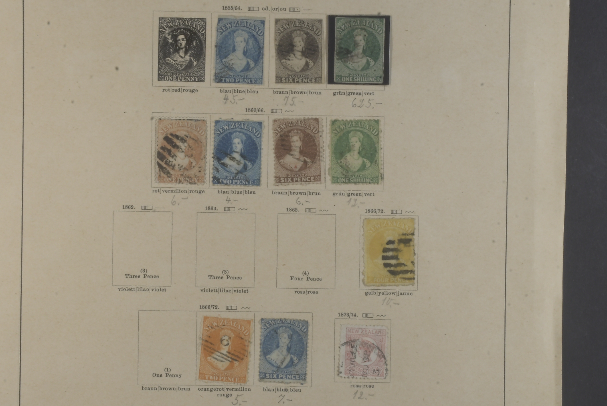 New Zealand. Collection ★/⊙ 1855–1920 on leaves. With 21 Chalon heads unchecked, 5s Mount Cook with faults and Christchurch exhibition set (no gum) and some other interesting stamps. Mixed quality.