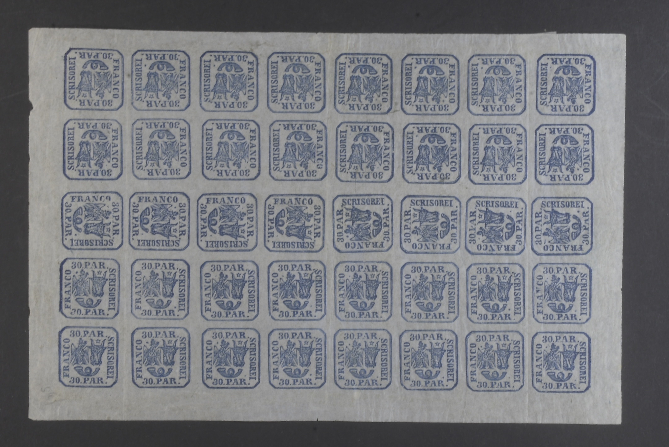 Romania. Michel 10 II ★★, 1864 Coat-of-Arms 30 Par in complete sheet of 40 stamps including several téte-béche. Minor gum toning on part reverse as is the case. Rare.