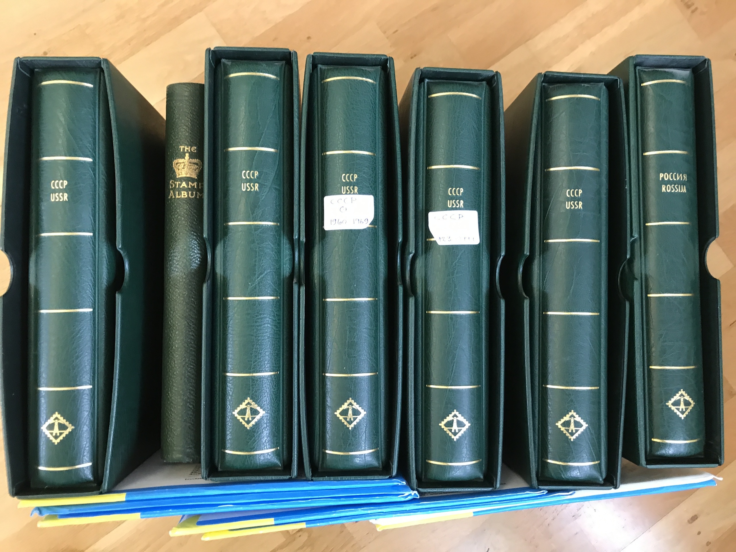 Soviet Union. Mostly used. Collection 1924–1991 in five Leuchtturm album with slip cases + one minor album incl. some better mini sheets, e.g. BL6–8 used and BL10 **. Apparently cpl. used 1960–1990 except two mini sheets. Also one empty Leuchtturm with slip case + various supplement. Approx. 25 kg.