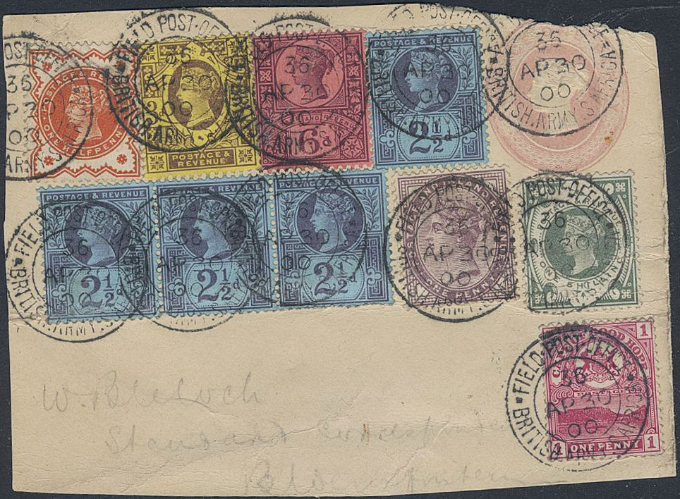 South Africa, Cape of Good Hope. SG GB211 on piece, Boer war mixed franking on large part of stamped envelope with CoGH SG69 and GB SG 172, 197, 201×4, 202, 208 and 211. Adressed to Bluefontain (faint) all stampes cancelled with ARMY FIELD POST OFFICE, BRITISH ARMY S. AFRICA 36. Interesting and rare.