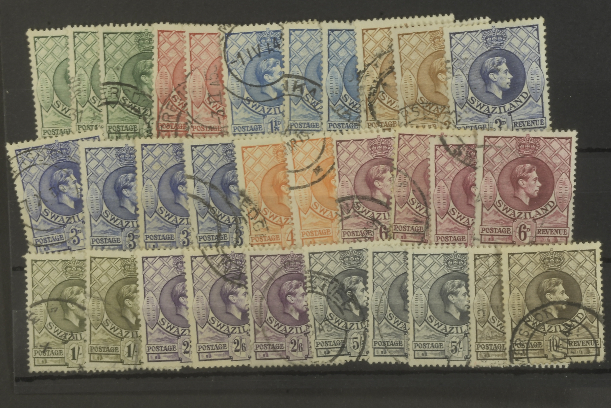 Swaziland. SG 28–38a used, 1938 set to 10s. 31 stamps alltogether, e.g. two copies of 10s. GBP 270+