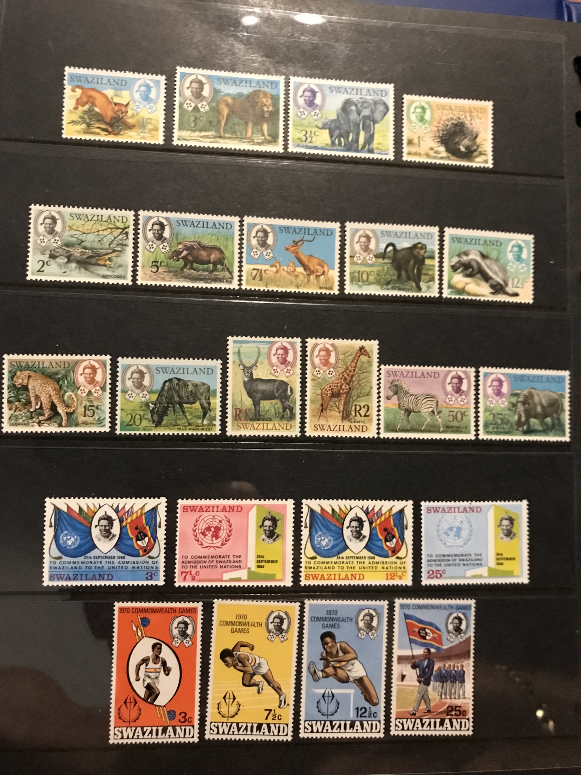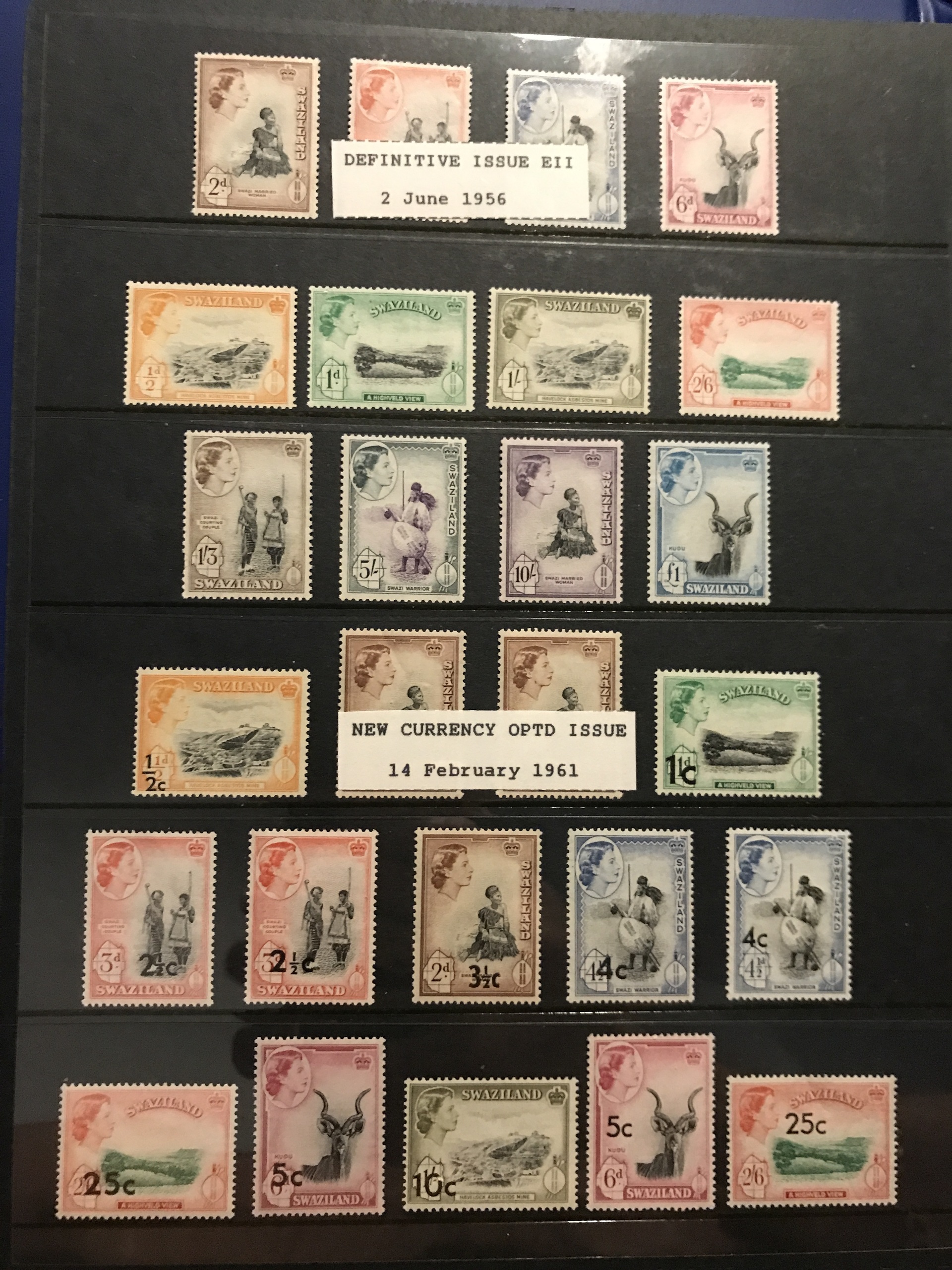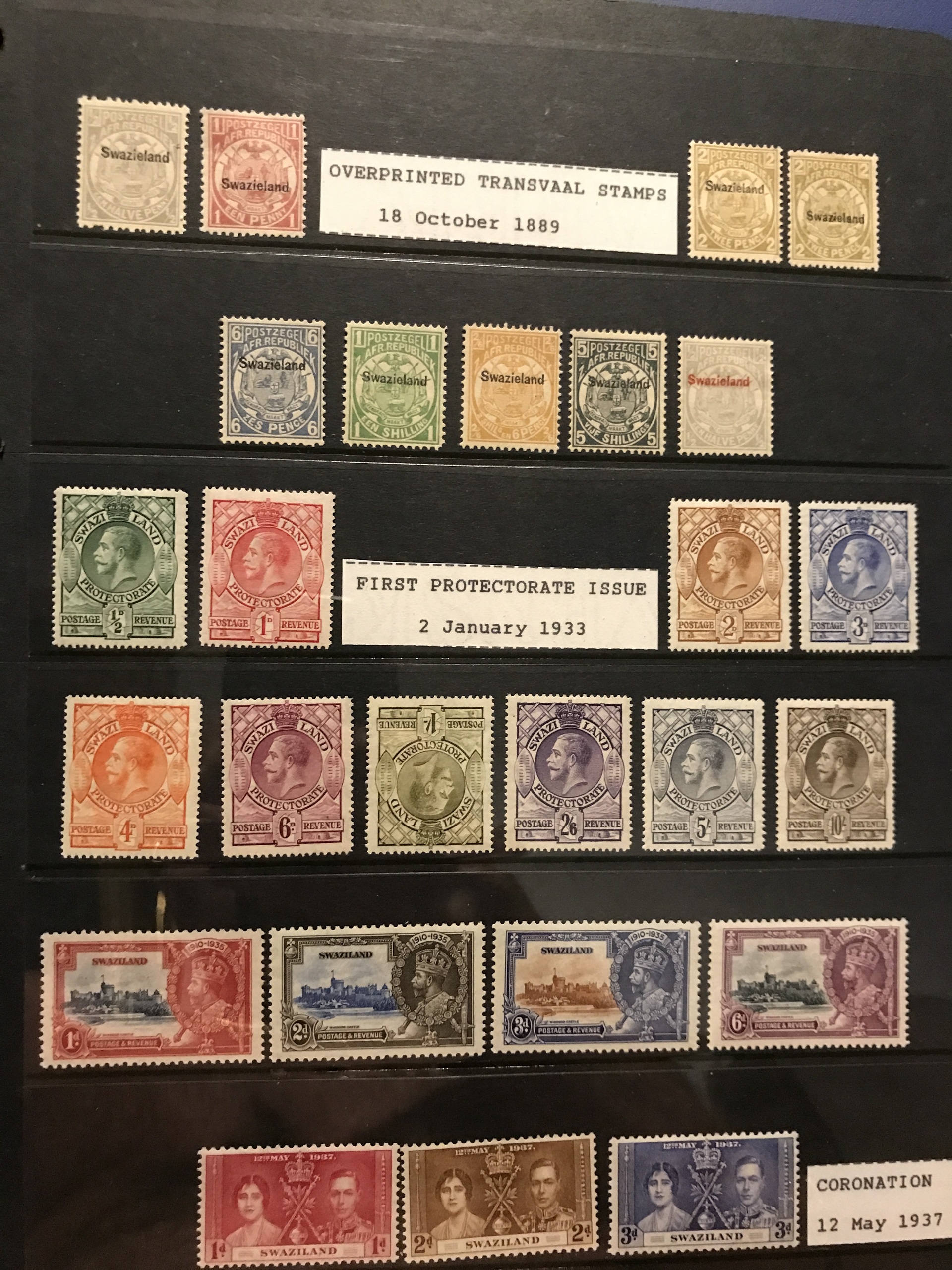 Swaziland. Mostly ★★. Collection 1889–1987 in Leuchtturm binder. Containing nice overprints 1889 (some reprints), Mi17–19, 55–66 and 80–107 **, different perforations, etc. Also some used blocks of four.
