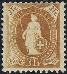 Switzerland. Michel 64D ★, 1882 Standing Helvetia 3 Fr olive-brown perf 11½ × 12. EUR 220