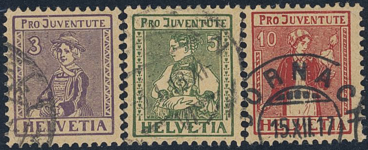 Switzerland. Michel 133–35 used, 1917 Pro Juventute SET (3). Complete cancelled set in very fine condition. EUR 110