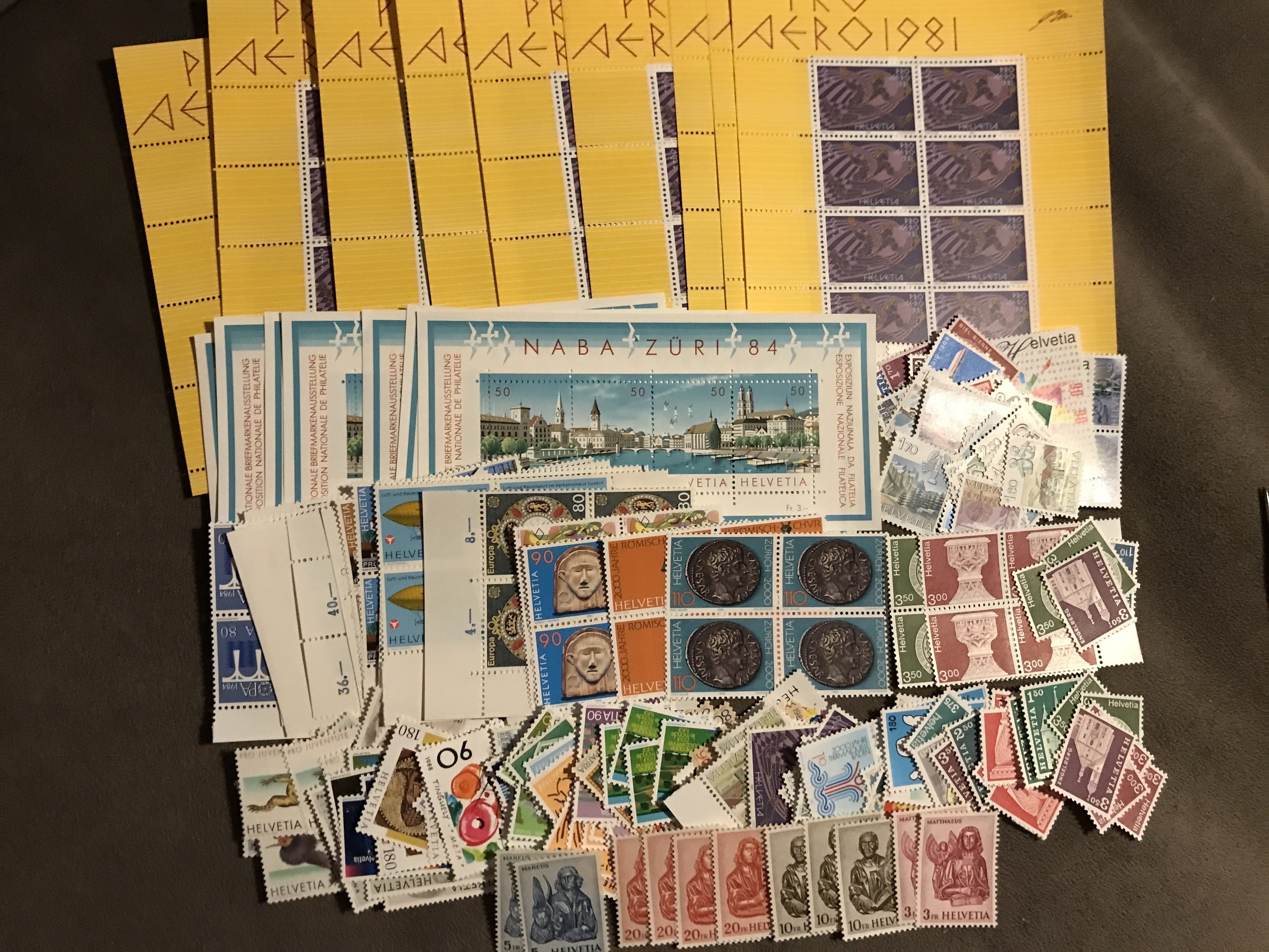Switzerland. Face value. Lot with e.g. high values, blocks-of four and some mini sheets etc. Face value approx. CHF 670.-.