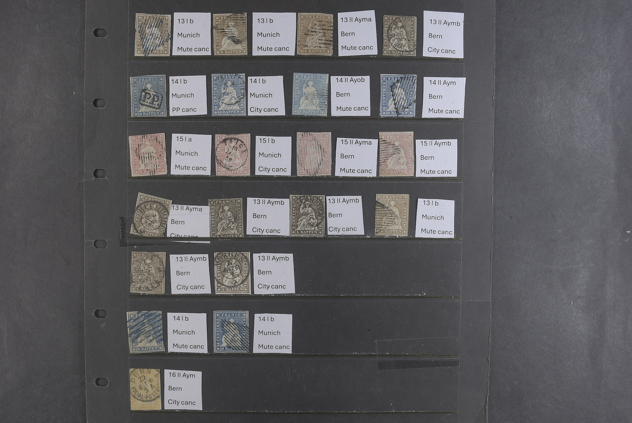 Switzerland. Collection/accumulation used 1854–1860 on visir leaves. Specialized lot Sitting Helvetia, imperforated. Every single stamp deescribed according to Michel Spezial Schweiz. Silk thread in the paper checked. Mostly good quality. >3500 € (21)