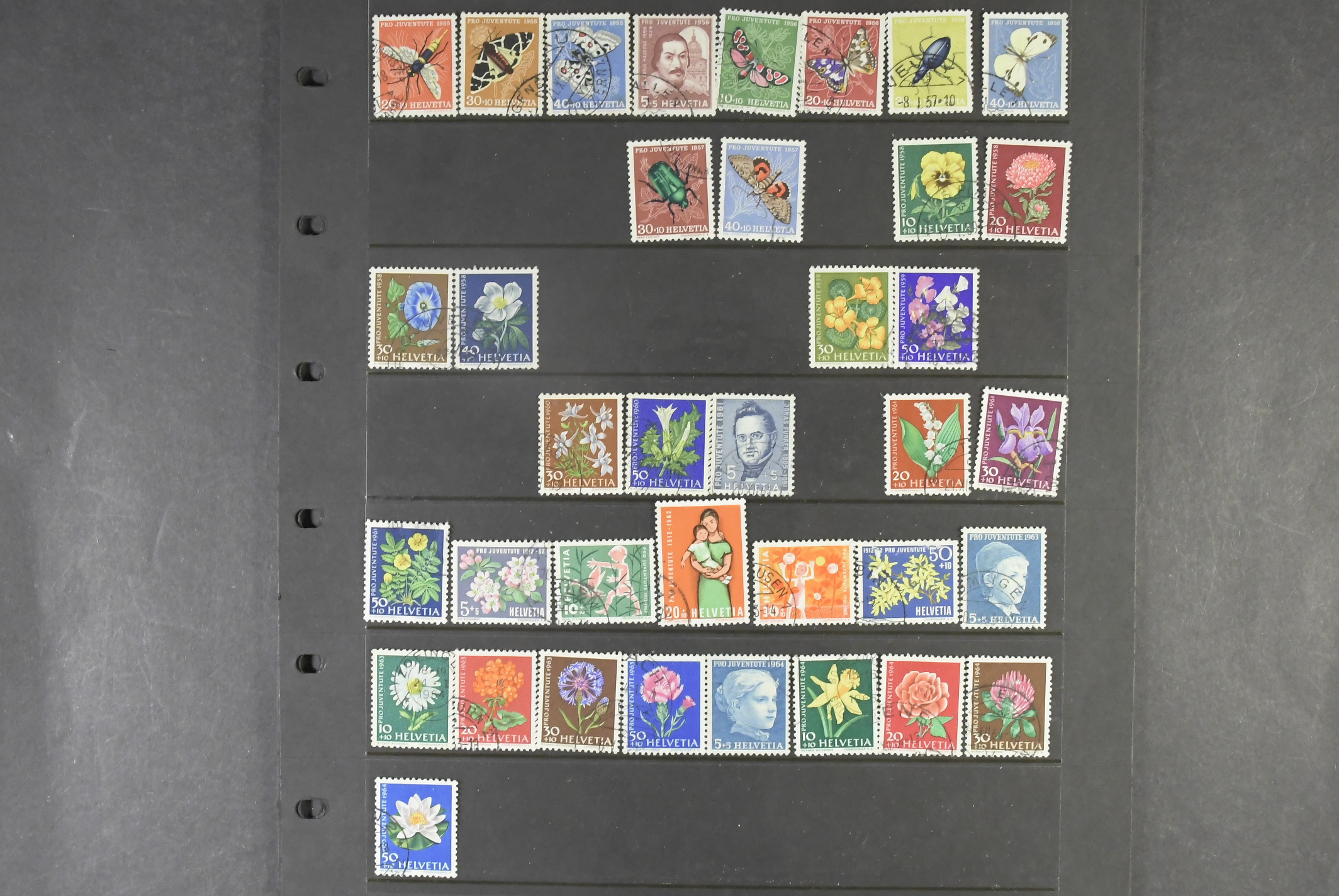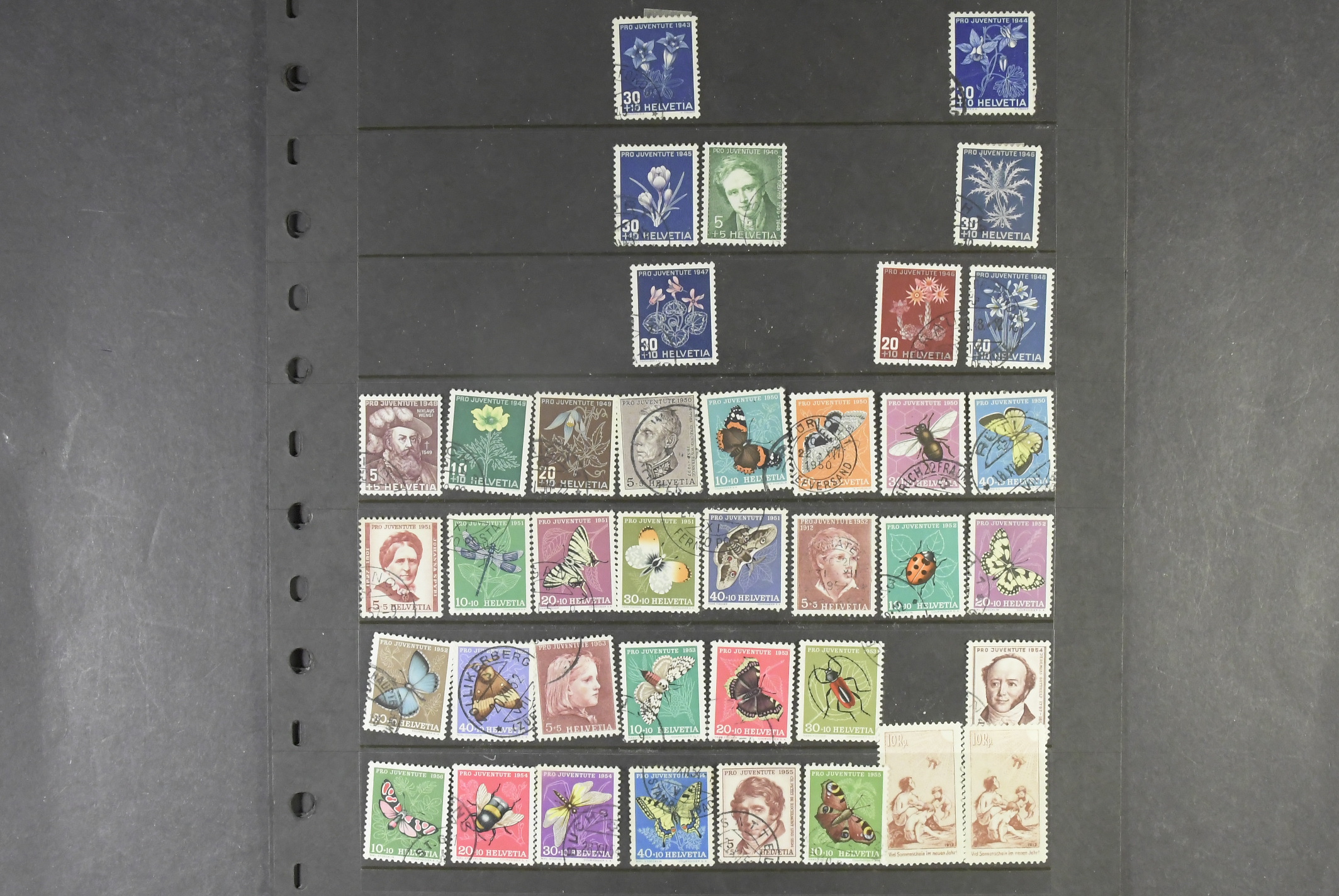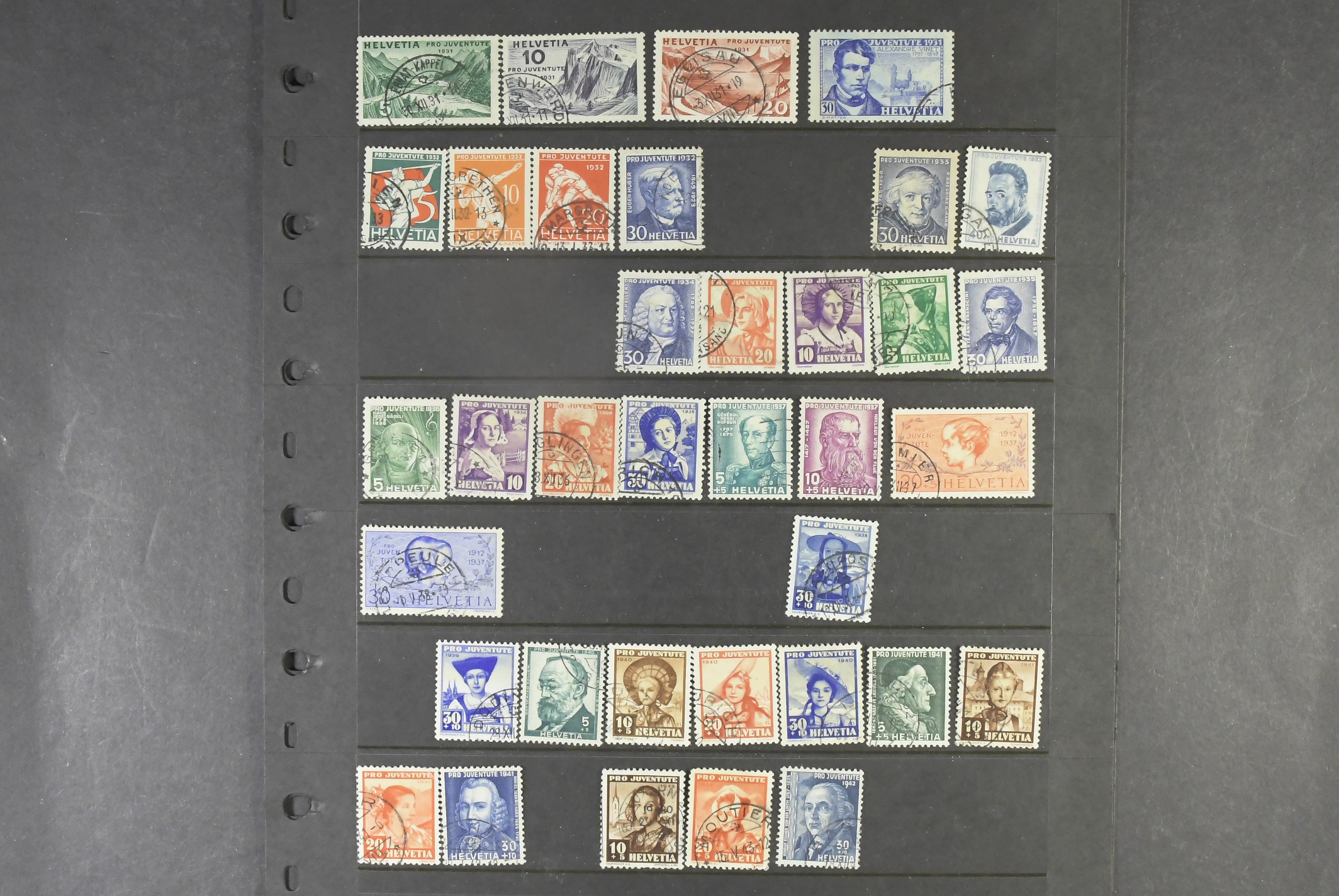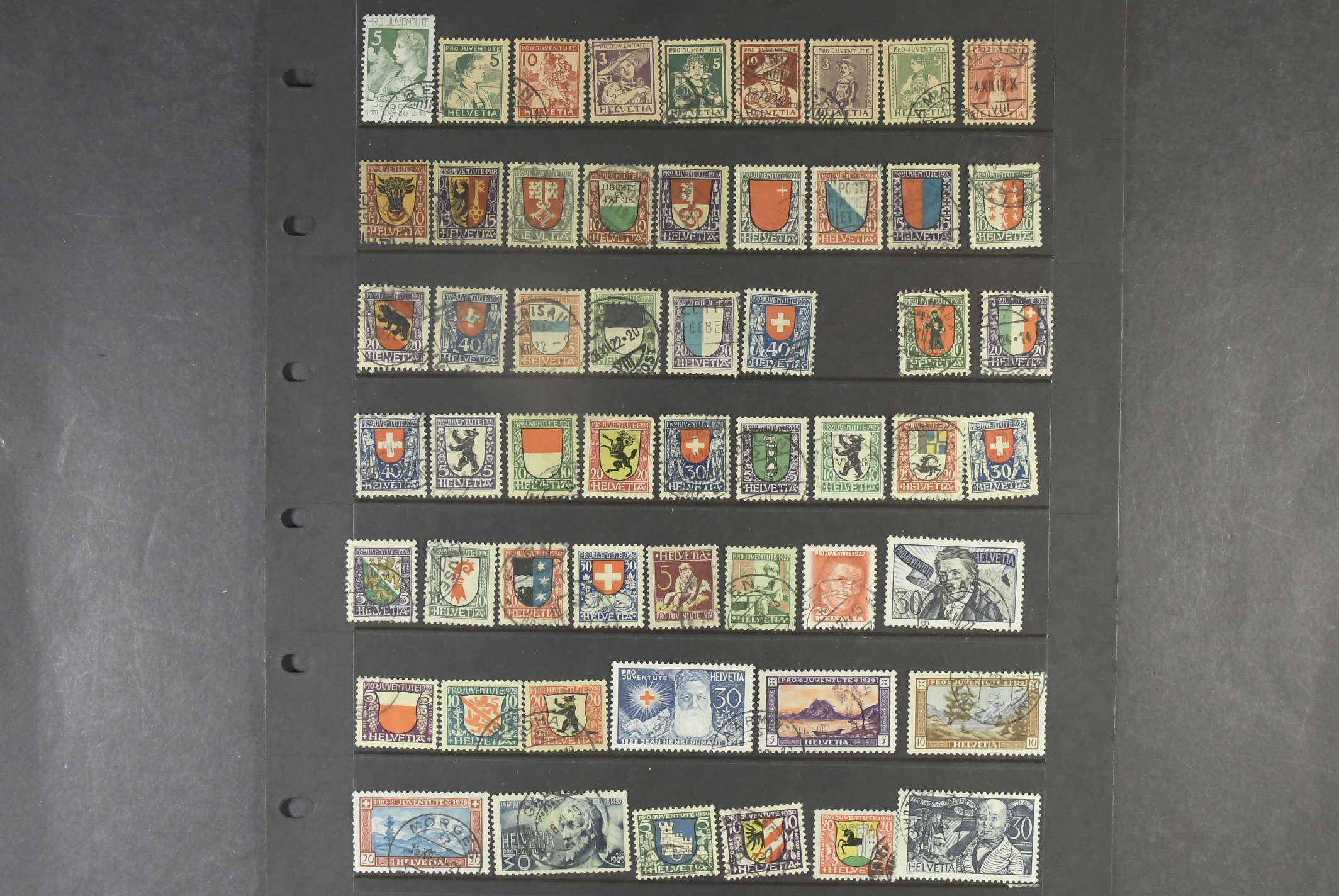 Switzerland. Collection/accumulation mostly used 1913–1965 on visir leaves. "Pro Juventute" – 1913 to 1985, almost complete up to 1932. Also forerunners from 1912 (mint) in the material. Please see a selection of scans at www.philea.se. Mostly fine quality.