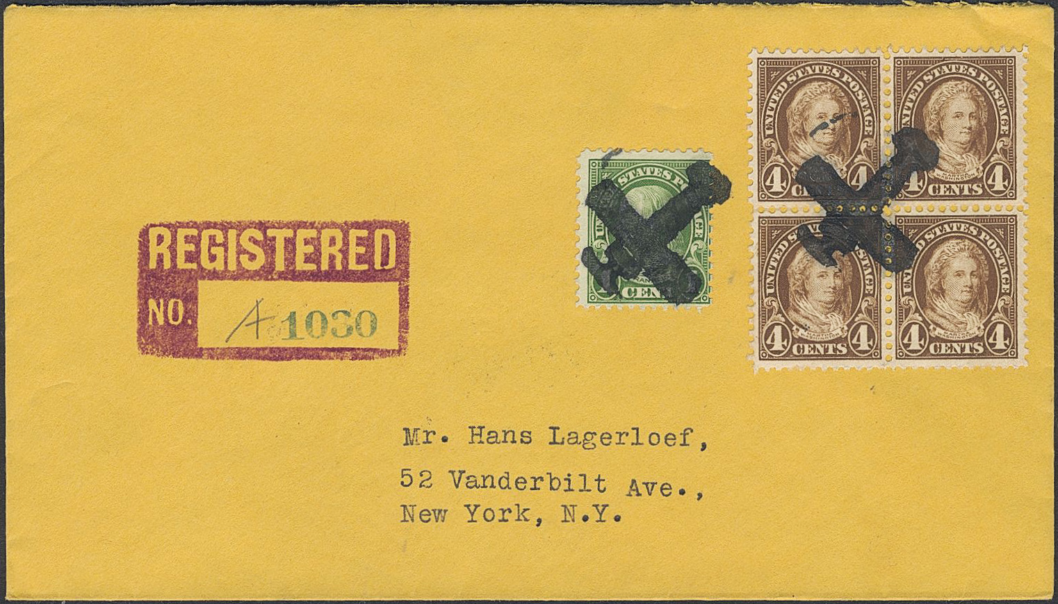 U.S.A. Sc 552, 556 on cover, Franklin 1 c, Martha Washington in block of 4 on reg. cover cancelled with Pacific Air Transport air plane cancel, Oakland Airport JUN 6 1930, sent to Hans Lagerlöf.