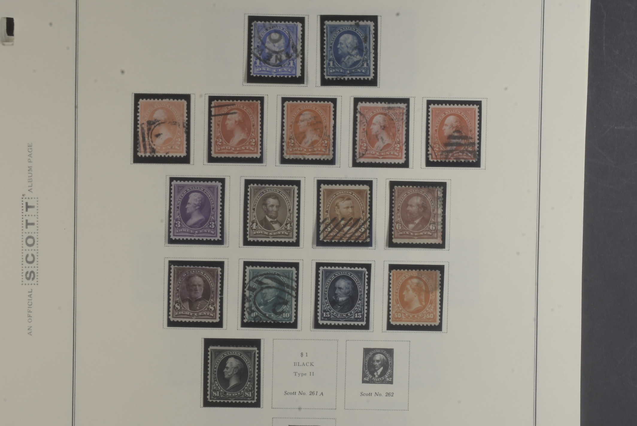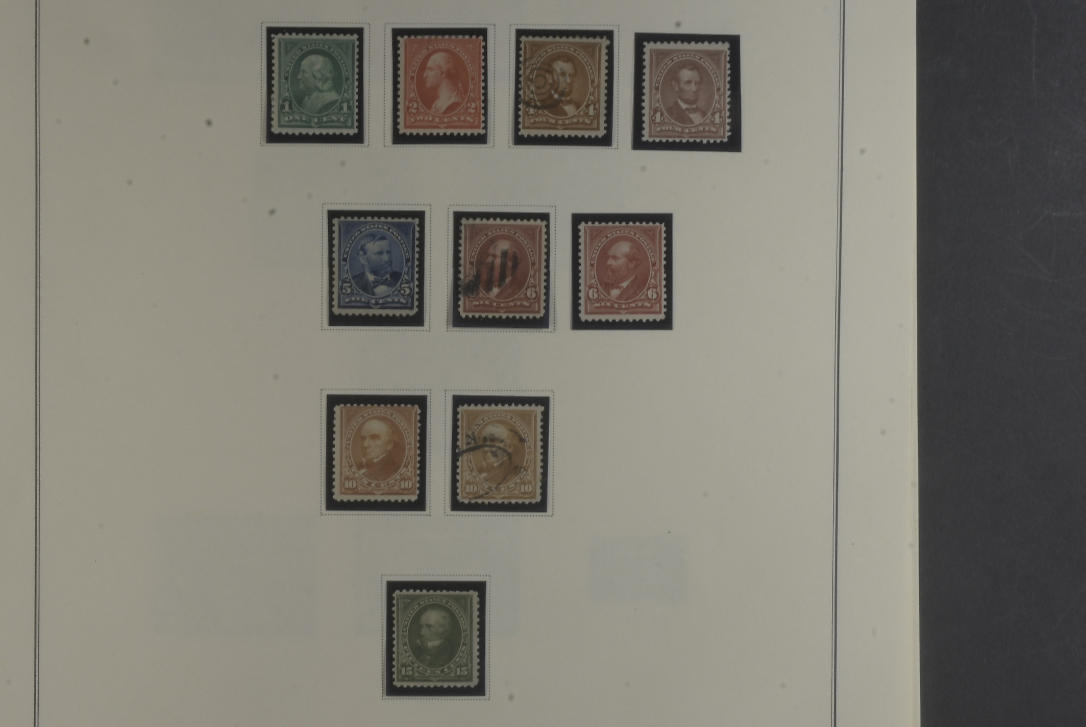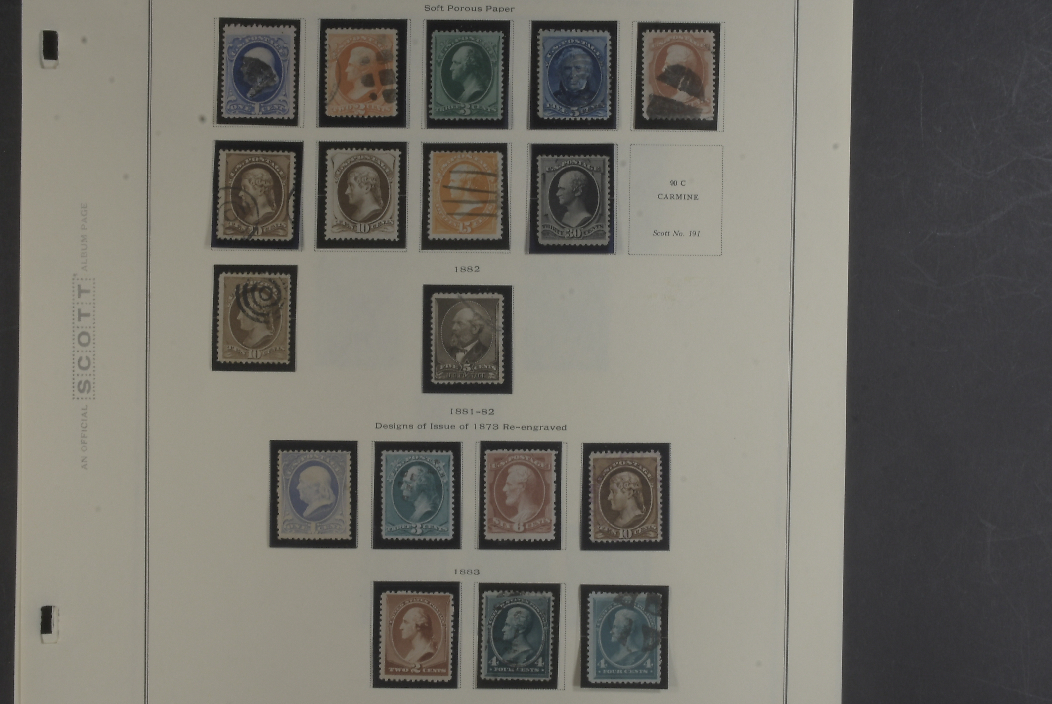U.S.A. Mostly used on eight leaves. 19th century collection, mint and used with many tough to find stamps, for the 1870s through to the Omahas, highlights inc 90cts Perry both types 1870 and 1872 the latter CDS, as well as mint, possibly MNH 30cts Hamilton (Scott #165), further defins 1879s with another mint 30cts Hamilton (Scott #190), 1890 again to 90cts Perry, 1894 with broken circle $1 Perry #261, ending with the Omahas to $1, virtually all mint save 50cts, etc .The entire lot is presented at www.philea.se. Mostly fine quality.